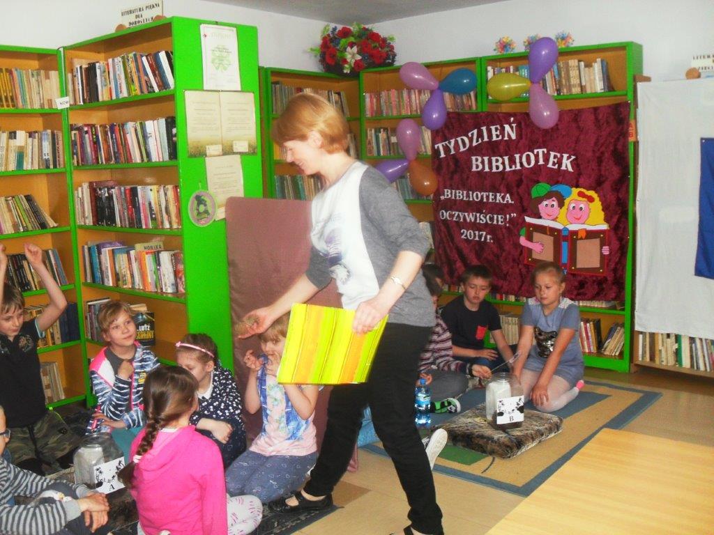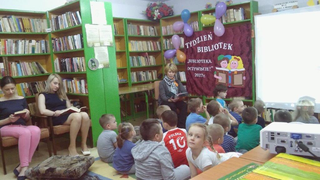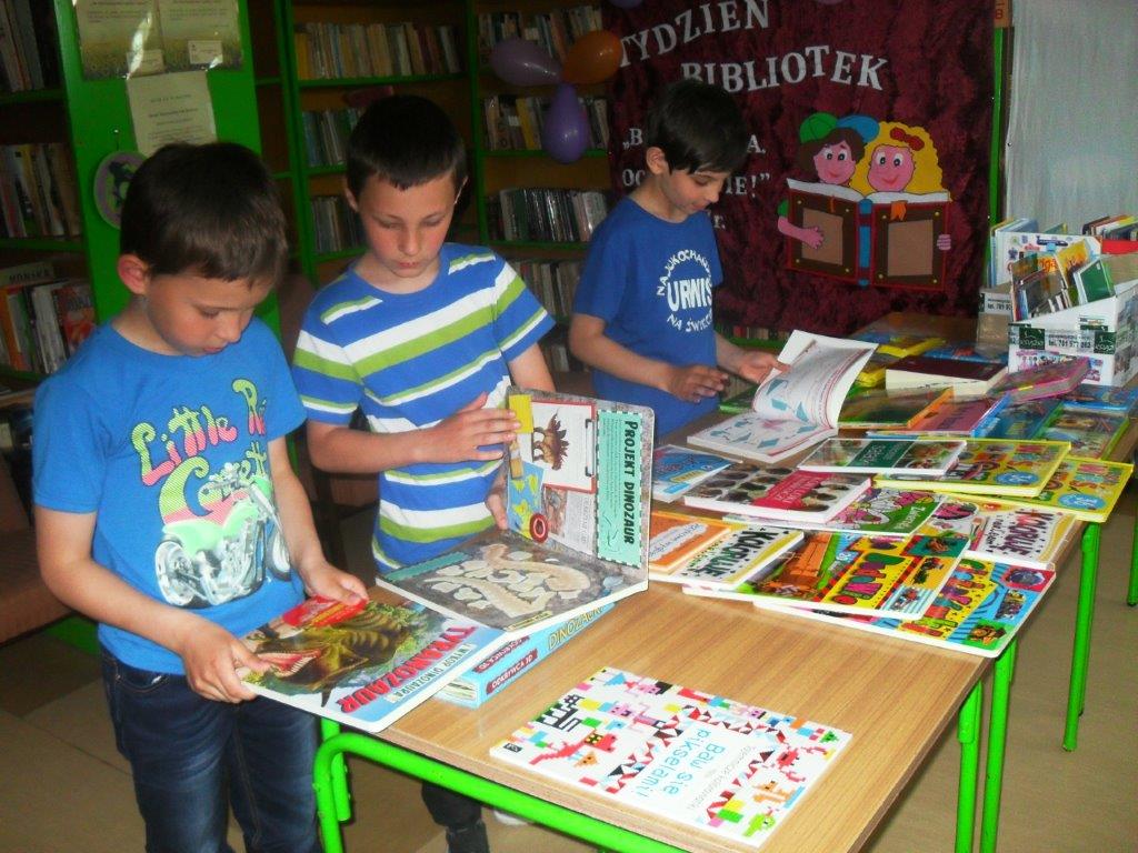 Kolejny dzień to spotkanie z przedszkolakami, MIŚ”. Maluchy wysłuchały ciekawych i pouczających opowiadań G. Kasdepke, Ostrożnie” czytanych przez p. bibliotekarkę E. Dzik. Następnie w formie zagadek dowiedziały się, jakie są zawody i w jaki sposób unikać niebezpiecznych sytuacji związanych z poszczególną pracą. Dla nieco starszych dzieci zostały przeprowadzone turnieje wiedzy: dla kl., II” i, III” pt. ,,Doktor Dolittle...”, Dla kl. V i VI, Dynastia Miziołków” oraz ciekawe prezentacje multimedialne pt.,, Dlaczego warto czytać książki” i, ,,Żyj bez narkotyków” przygotowanych przez bibliotekarkę. Pobyt każdej z grup dzieci w bibliotece został nagrodzony słodyczami. Wszystkim tym działaniom towarzyszył kiermasz książki przeprowadzony w bibliotece.