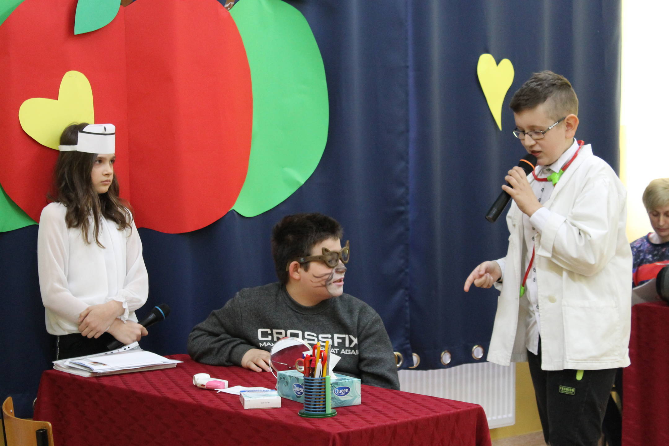 Występ artystyczny uczniów z klas IV, V i VI przygotowała p. Joanna Dwojak. Zebrani obejrzeli scenki pt. „Chory kotek” i „Chory dzięcioł” oraz przedstawienie „Baba Jaga u dentysty” . Ponadto usłyszeli recytację wierszy związanych z tematyką zdrowotną oraz piosenkę z pokazem "Kubuś - wytańcz witaminy". Punktem kończącym występ były życzenia złożone gościom przez uczniów i p. dyrektor Marzannę Błach.