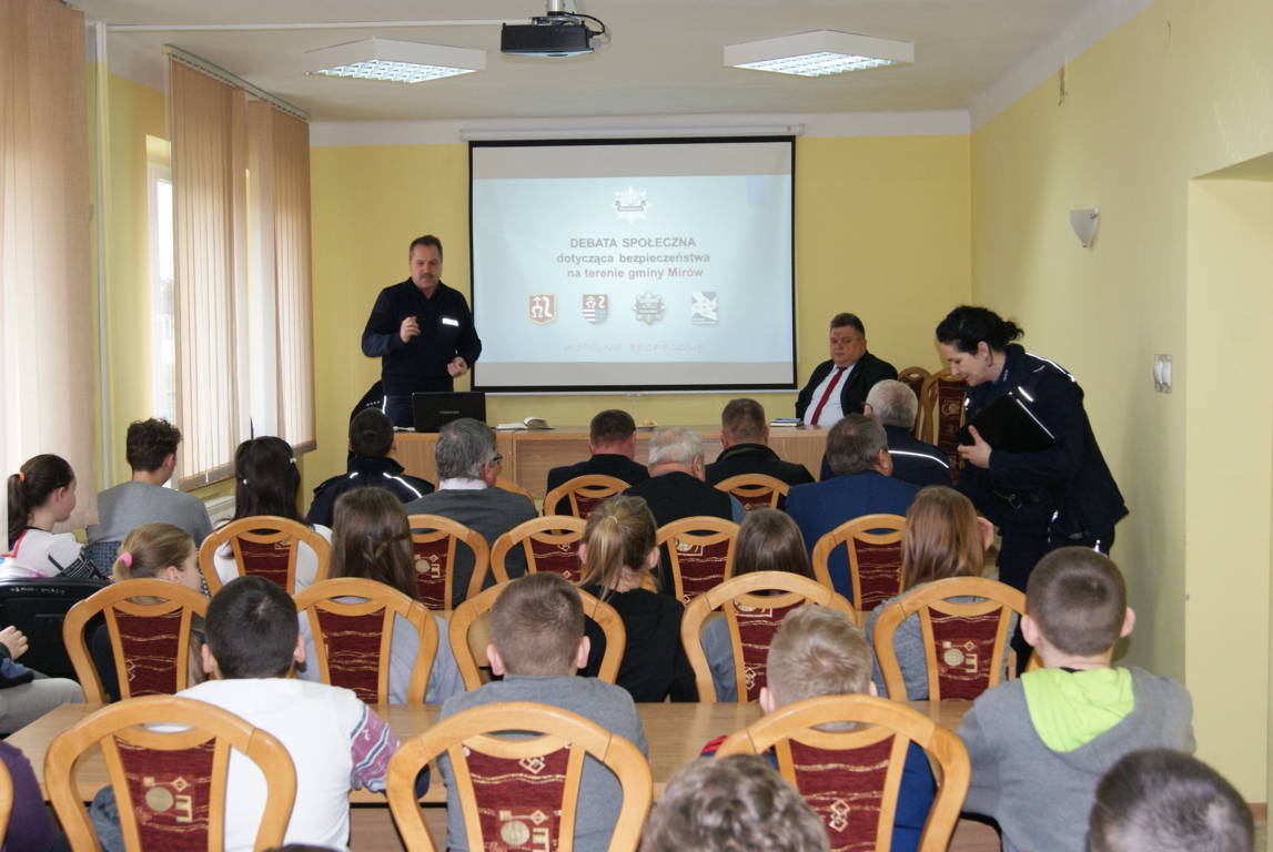 W dniu 24.02.2016r. w Sali konferencyjnej Urzędu Gminy Mirów odbyło się spotkanie dot. bezpieczeństwa na terenie gminy Mirów. W debacie udział wzięli przedstawicieli lokalnych władz samorządowych, przedstawiciele Komendy Powiatowej Policji w Szydłowcu, młodzież gimnazjalna oraz mieszkańcy gminy. Spotkanie rozpoczął wójt Artur Siwiorek od przywitania wszystkich gości. Naczelnik Wydziału Prewencji Komendy Powiatowej Policji w Szydłowcu aspirant sztabowy Dariusz Kalita przedstawił skalę przemocy dotyczącą rodzin oraz stan bezpieczeństwa w ruchu drogowym oraz przestępczości za 2015r.
