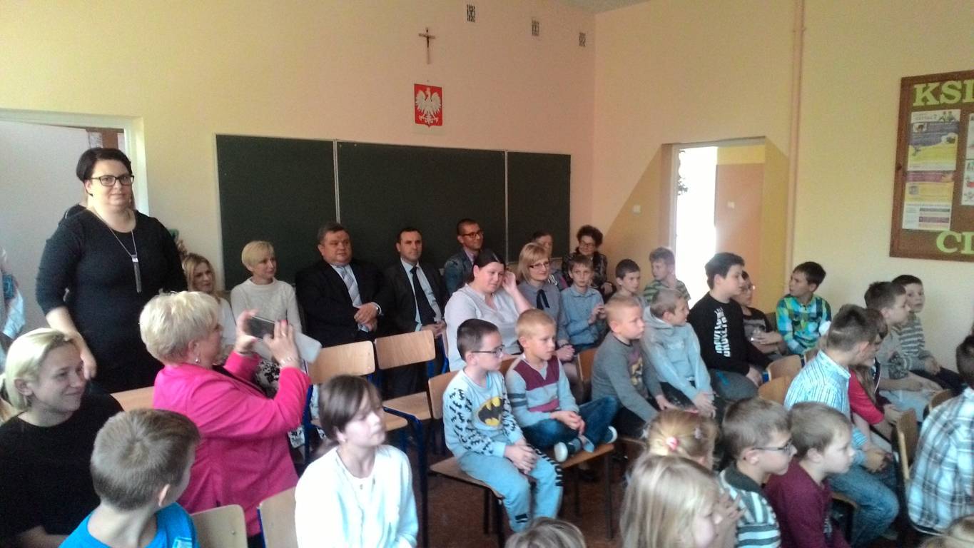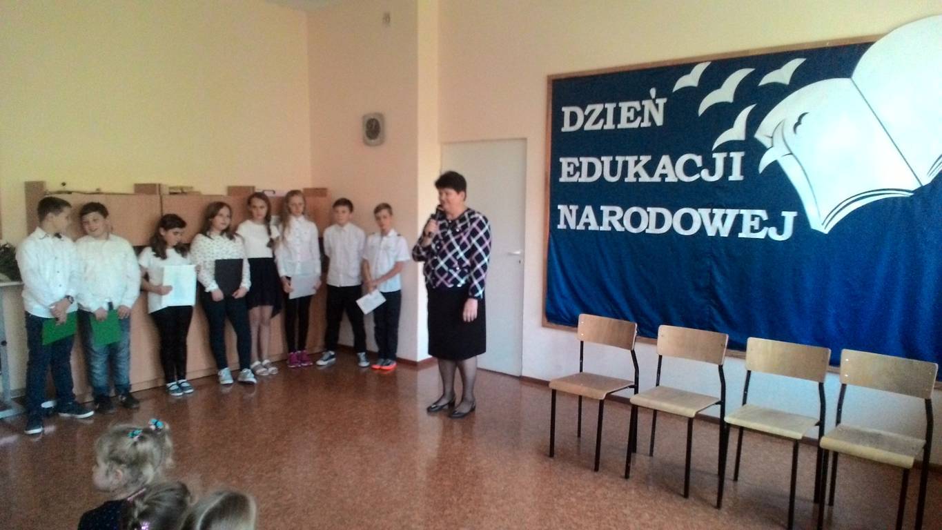 Humorystyczne przedstawienie, konkurs wiedzy o szkole oraz słuchowisko przygotowali uczniowie klasy szóstej wraz z wychowawczynią Panią Joanną Drabik. Przesłanie części artystycznej, skierowane pod adresem pedagogów i pracowników szkoły, było wyrazem życzliwości, wdzięczności i głębokiego szacunku za zaangażowanie i troskę o dobro uczniów. Po ich występie głos zabrała Pani Dyrektor Marzanna Błach, która wypowiedziała wiele ciepłych słów pod adresem dzieci i złożyła życzenia pracownikom szkoły. Zebrani usłyszeli także serdeczne życzenia od Pana Wójta, Przewodniczącego Komisji Oświaty -Jarosława Gromka oraz Inspektora Oświaty – Piotra Kowalika.