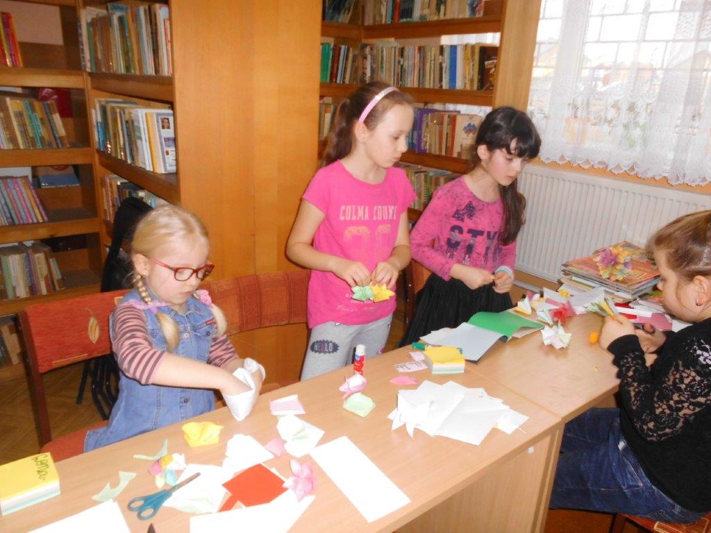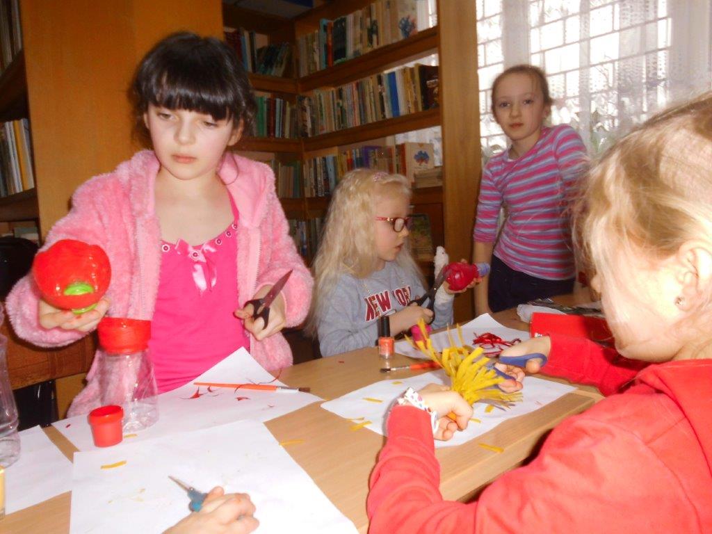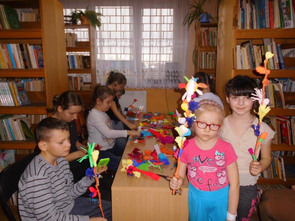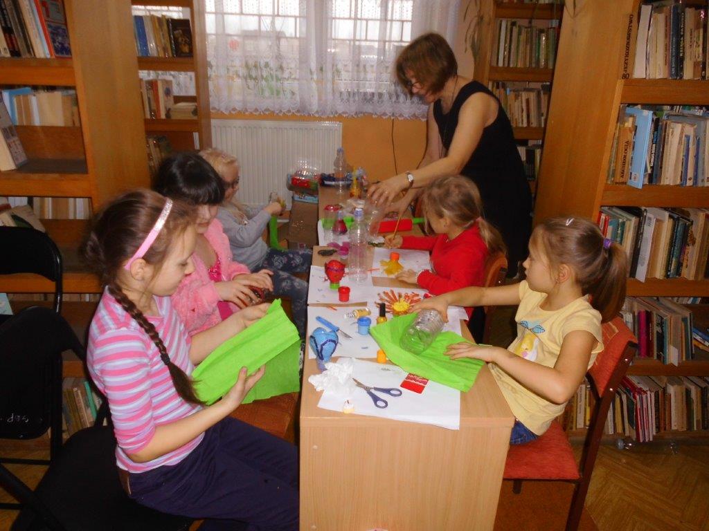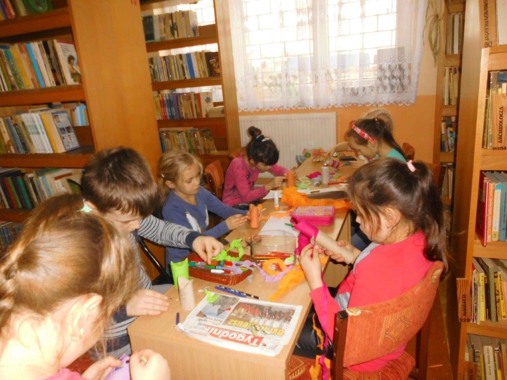 Podczas drugiego tygodnia ferii w bibliotece pt. „Ferie fanaberie” dzieci miały możliwość uczestniczyć w zajęciach manualno plastycznych. Bibliotekarki Beata Seweryn i Anna Erbel zadbały o to by dzieci się nie nudziły. Uczyły zasad recyklingu, czyli wykorzystania zużytych butelek plastikowych, rolek po papierze toaletowym do zrobienia niesamowitych rzeczy. Powstały piękne kotki, kwiaty i wazony. Natomiast metodą origami powstawały m.in. serca, pudełka, tulipany, kotki, biedronki. W trakcie zajęć dzieci również wykonywały wiosenne kwiaty z krepiny i bibuły, które wykorzystały do wykonania palemki wielkanocnej.Nie mogło zabraknąć głośnego czytania bajek przez bibliotekarki. A także wierszy przez uczestników zajęć. Dużym zainteresowaniem cieszyły się kalambury i quizy. Ponadto do dyspozycji dzieci były gry planszowe, puzzle, klocki. W czasie spotkań maluchom towarzyszył uśmiech i dobry humor. Wszystkim uczestnikom ferii dziękujemy i zapraszamy do korzystania z Biblioteki.