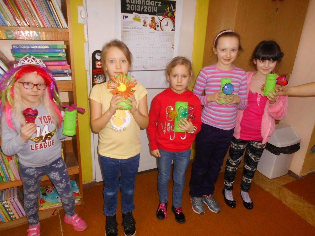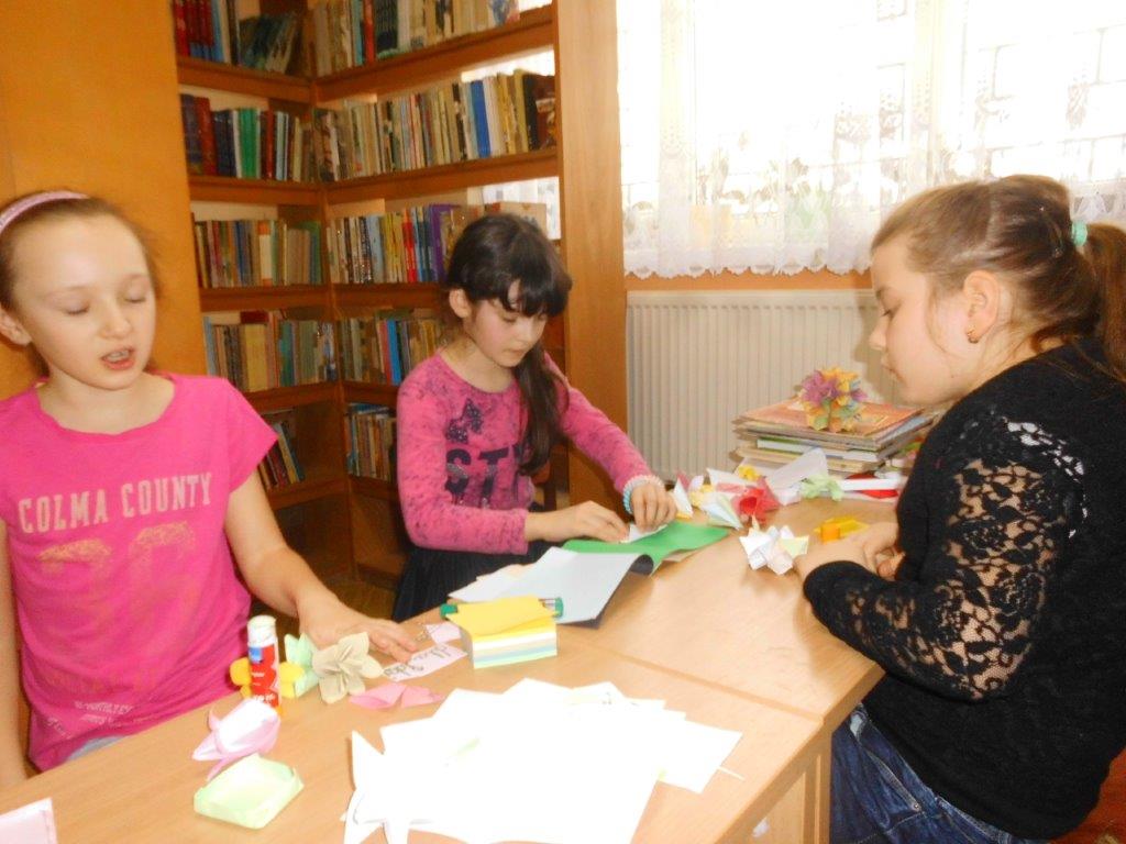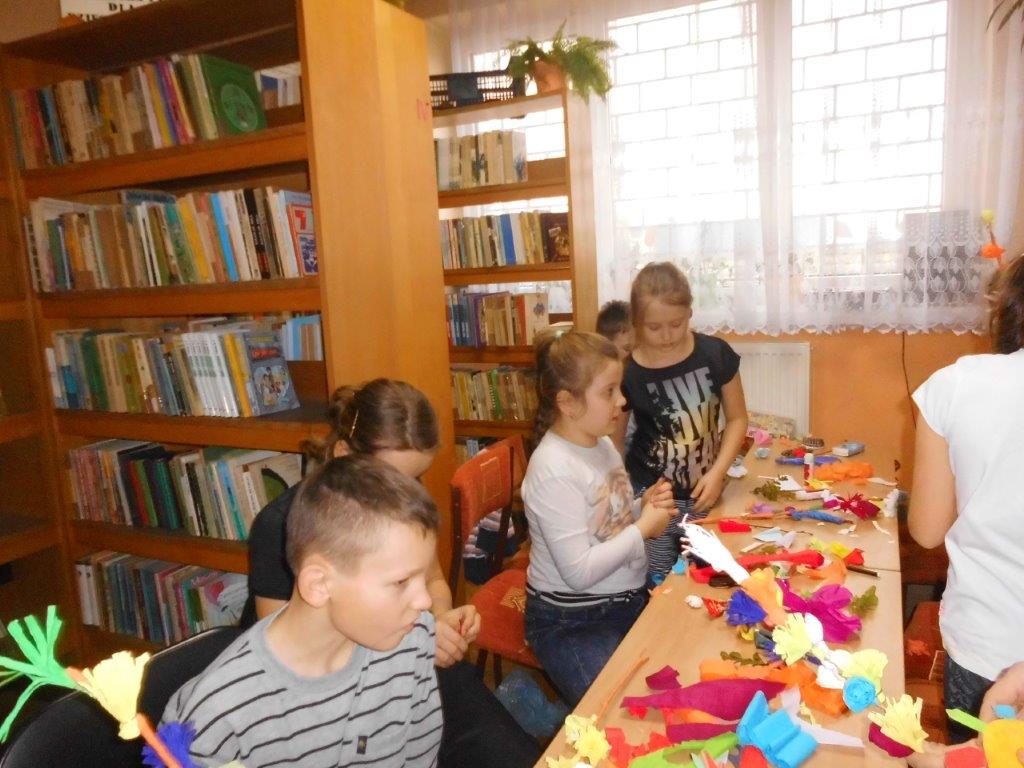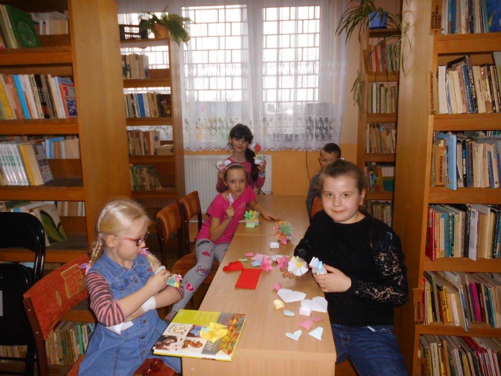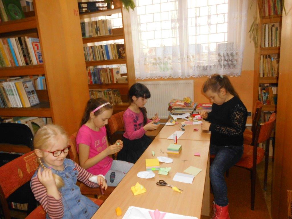 Podczas drugiego tygodnia ferii w bibliotece pt. „Ferie fanaberie” dzieci miały możliwość uczestniczyć w zajęciach manualno plastycznych. Bibliotekarki Beata Seweryn i Anna Erbel zadbały o to by dzieci się nie nudziły. Uczyły zasad recyklingu, czyli wykorzystania zużytych butelek plastikowych, rolek po papierze toaletowym do zrobienia niesamowitych rzeczy. Powstały piękne kotki, kwiaty i wazony. Natomiast metodą origami powstawały m.in. serca, pudełka, tulipany, kotki, biedronki. W trakcie zajęć dzieci również wykonywały wiosenne kwiaty z krepiny i bibuły, które wykorzystały do wykonania palemki wielkanocnej.Nie mogło zabraknąć głośnego czytania bajek przez bibliotekarki. A także wierszy przez uczestników zajęć. Dużym zainteresowaniem cieszyły się kalambury i quizy. Ponadto do dyspozycji dzieci były gry planszowe, puzzle, klocki. W czasie spotkań maluchom towarzyszył uśmiech i dobry humor. Wszystkim uczestnikom ferii dziękujemy i zapraszamy do korzystania z Biblioteki.