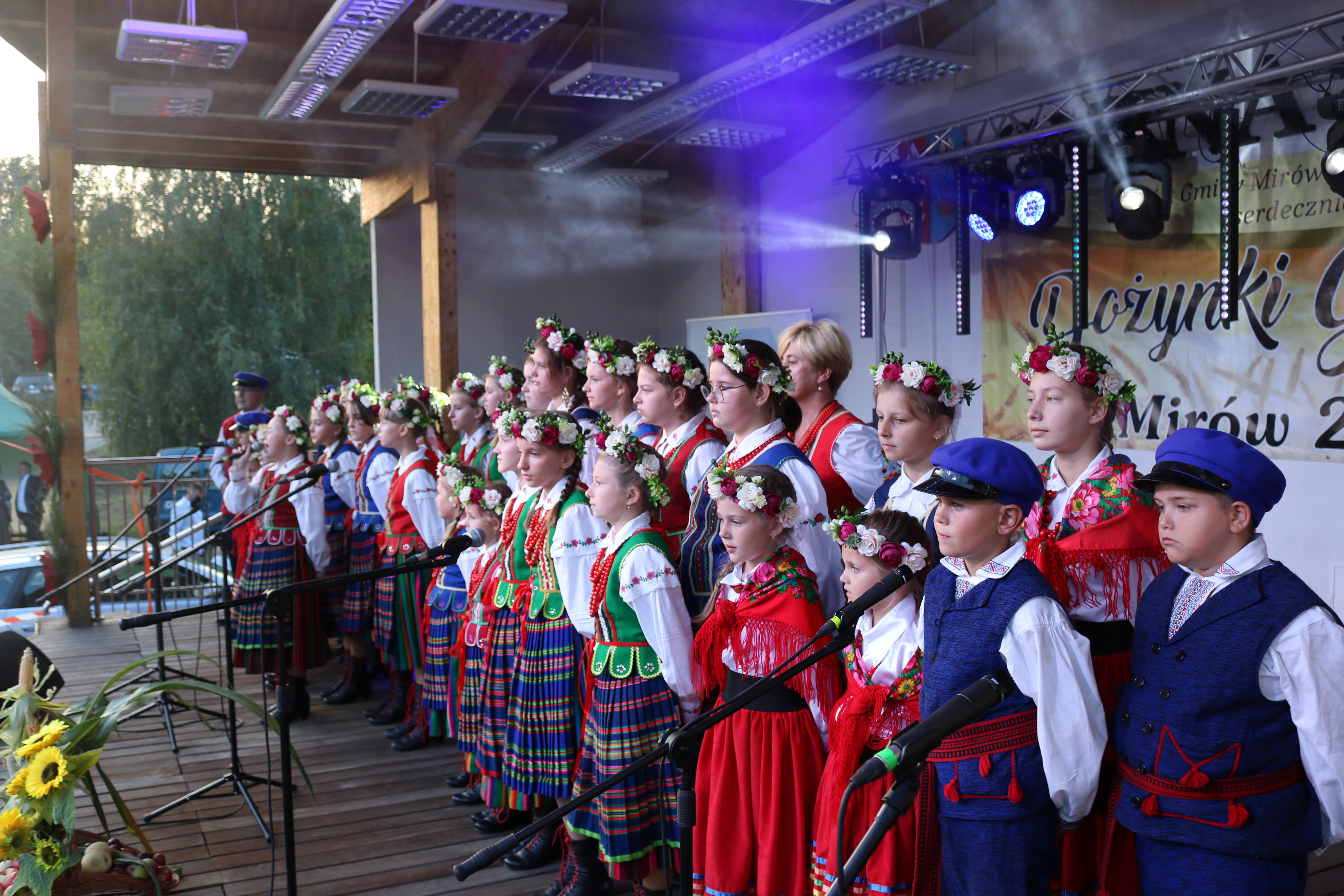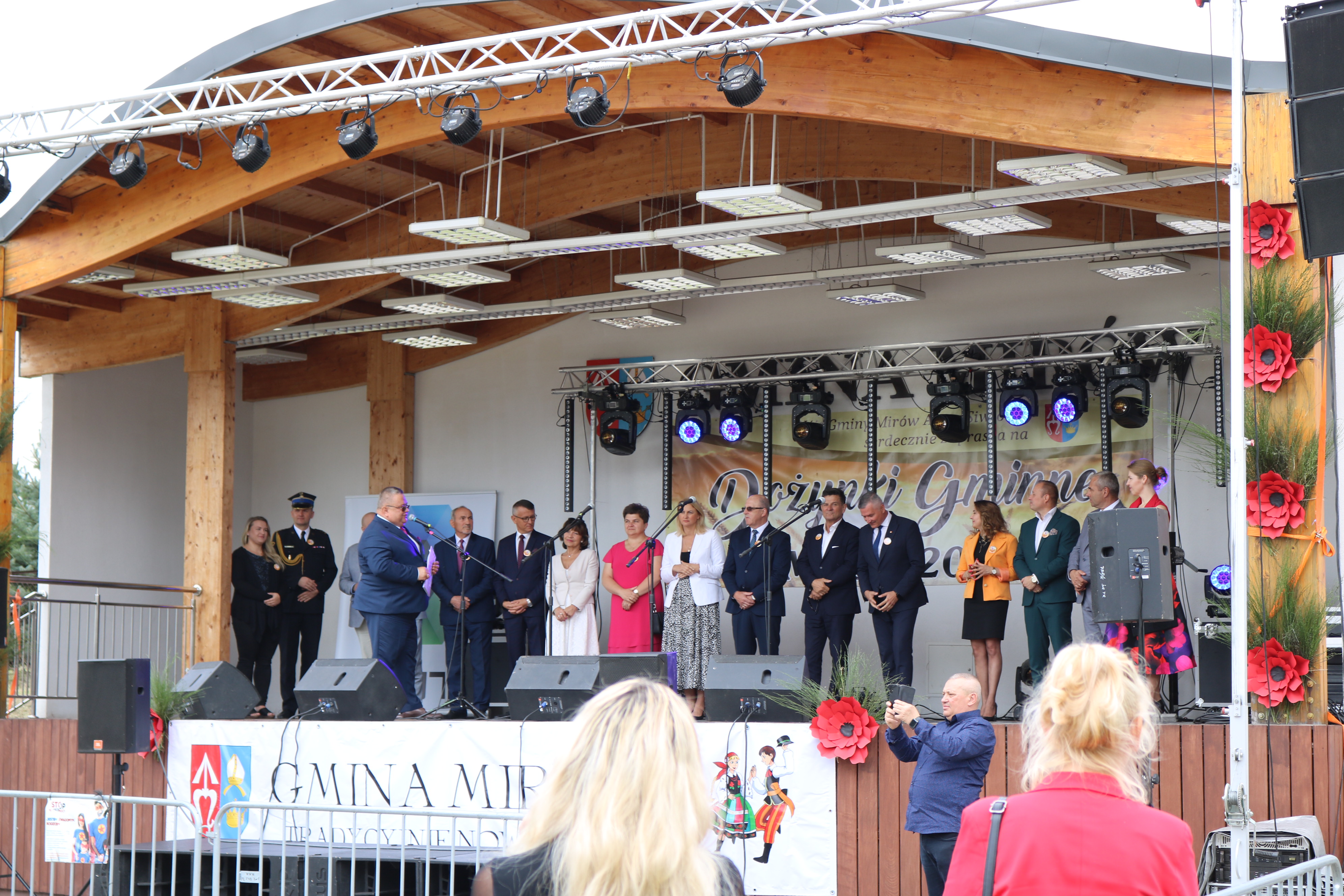 Korowód dożynkowy został przywitany przez proboszcza Parafii Matki Bożej Częstochowskiej – ks. Jana Godka. Po zakończeniu nabożeństwa zebrani przemieścili się na plac przed mirowskim amfiteatrem gdzie odbyła się dalsza część uroczystości. Zaproszonych gości przywitali gospodarze gminy: Wójt Artur Siwiorek oraz Przewodniczący Rady Gminy Mirów Wiesław Morawiak. Po przemówieniach gospodarze oraz starostowie dożynek: Daria Pytoń oraz Sławomir Zawisza w asyście sołtysów dzielili chleb dożynkowy wśród zebranych. Po obrzędzie dzielenia się chlebem delegacje wieńcowe rozpoczęły ceremonię obśpiewywania wieńców. Należy wspomnieć, że wszystkie sołectwa zaprezentowały okazałe wieńce wykonane z tegorocznych zbiorów. Po zakończeniu występów ludowych rozpoczęły się konkurencje sołectw. Rywalizacja odbywała się w czterech dyscyplinach: rzucie kaloszem do celu, ubijaniu jajek, wyścigu w workach oraz biegu z jajkiem. Następnie na scenie wystąpił kabaret Paka z Jeleniej Góry a zaraz po nim goście mogli obejrzeć jak zawsze wyjątkowy koncert w wykonaniu Szkolnego Zespołu Ludowego Radosne Nutki, który wykonał kilka najbardziej znanych utworów ludowych. Kolejnymi artystami, którzy pojawili się na scenie był ukraiński zespół Shlager Band. Niesamowity głos wokalistki zespołu poruszył publiczność. Należy wspomnieć, że zespół śpiewa wiele znanych Polskich utworów. Na koniec wystąpiła gwiazda wieczoru czyli zespół MIG, który rozgrzał publiczność do czerwoności. Po koncercie artyści spotkali się ze swoimi fanami przed sceną chętnie pozując do zdjęć. Impreza zakończyła się dyskoteką pod gwiazdami.