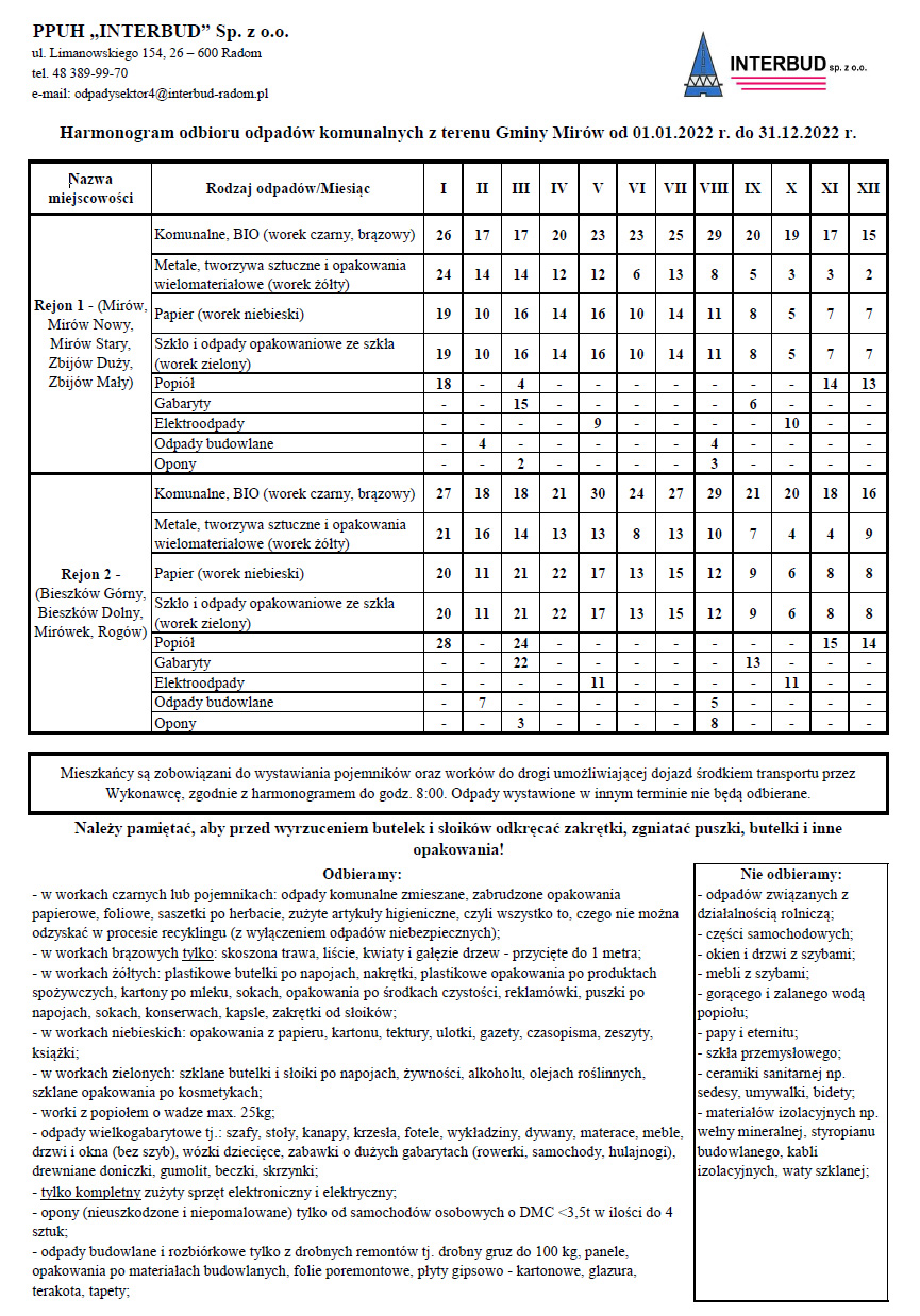 W załączeniu przedstawiamy Państwu nowy harmonogram odbioru odpadów komunalnych w Gminie Mirów na rok 2022.