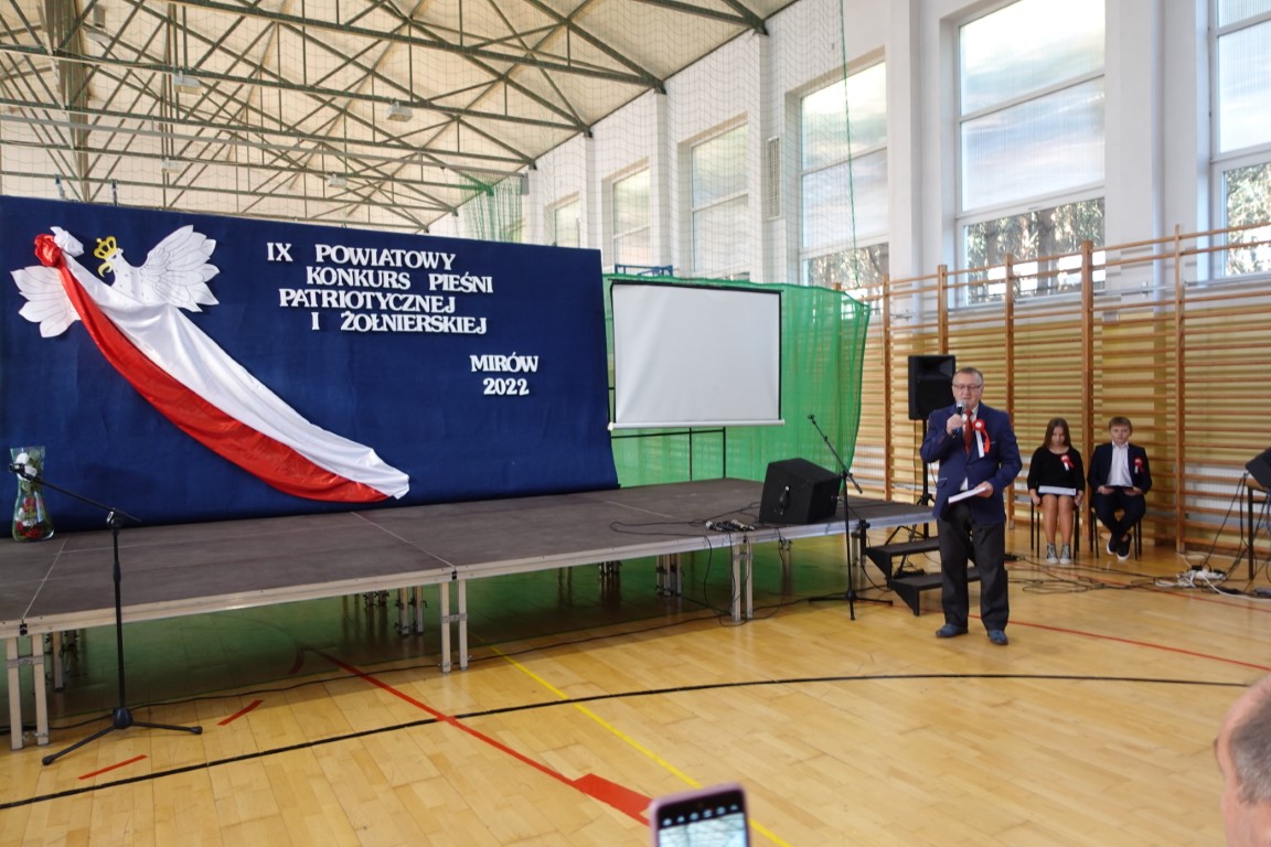 Następnie pan Jan Wojciech Ulewiński Dyrektor Publicznej Szkoły Podstawowej im. Świętego Jana Pawła II w Mirowie powitał zaproszonych gości, jury, występujących i ich opiekunów oraz nauczycieli i uczniów naszej szkoły, zapraszając na niezwykły koncert ukazujący miłość do ojczyzny w piękny sposób – śpiewem.