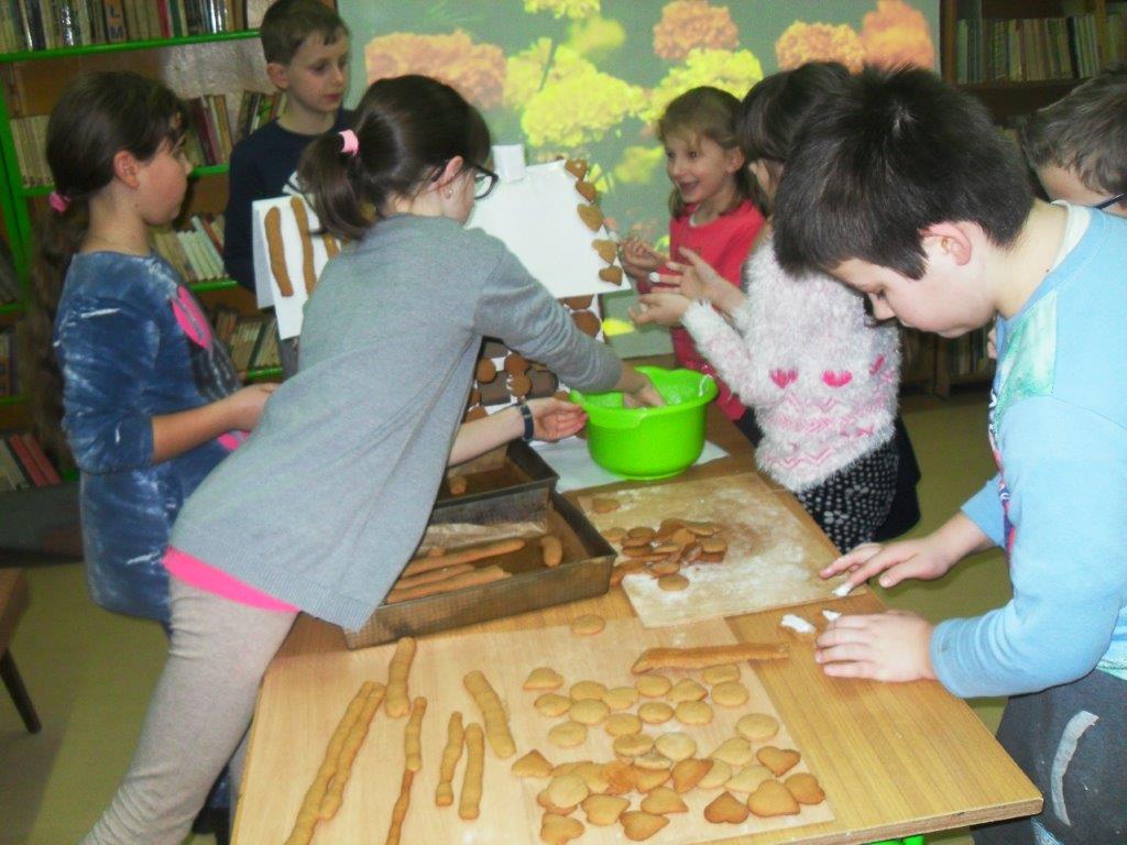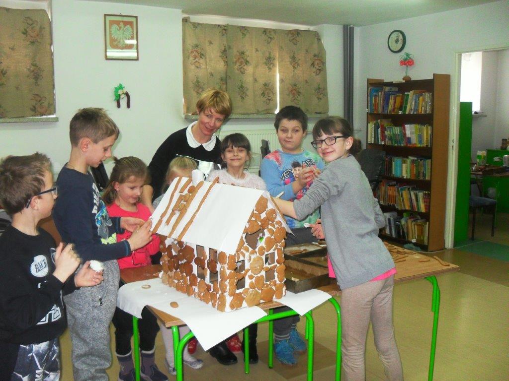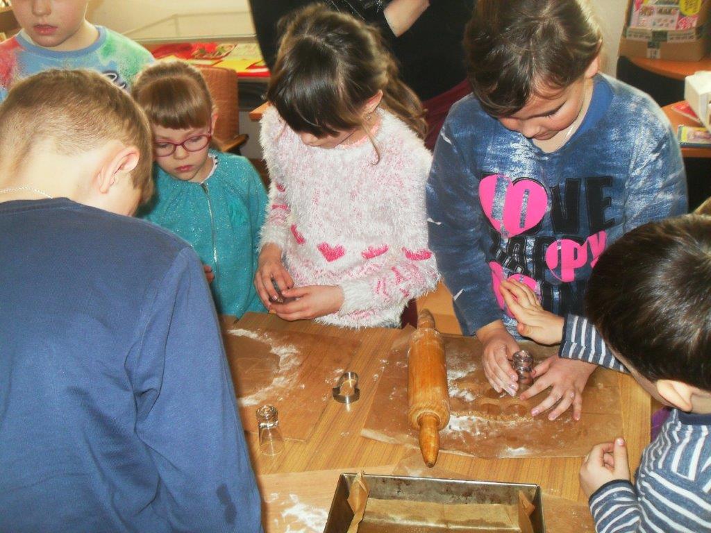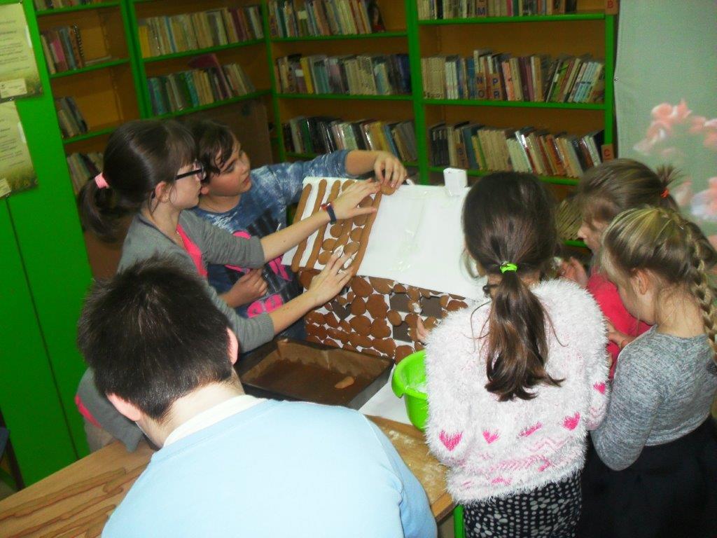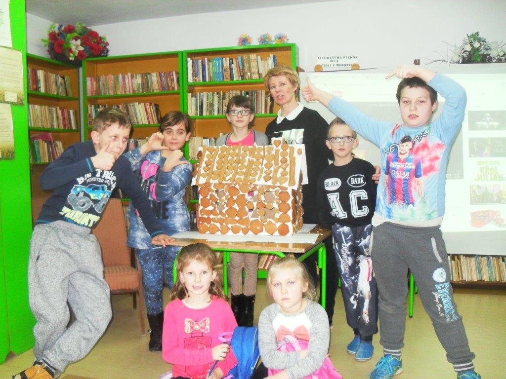W 3 dniu wypiekania pierniczków wszystkie dziewczynki i chłopcy zostali ucharakteryzowani na ,,Jasia i Małgosie”. Po wykrawaniu pierniczków obejrzały prezentacje multimedialną pt. ,,Jaś i Małgosia” przygotowaną przez p. bibliotekarkę oraz starsze dzieci odegrały krótką scenkę na której Baba Jaga uczy Jasia i Małgosie siadać na łopacie… W czasie, kiedy ciasteczka się piekły, dzieci bawiły się w kalambury, śpiewały ulubione piosenki i z niecierpliwością czekały na gotowe upieczone pierniczki. Na koniec, odbyła się dalsza dekoracja pachnącego domku.