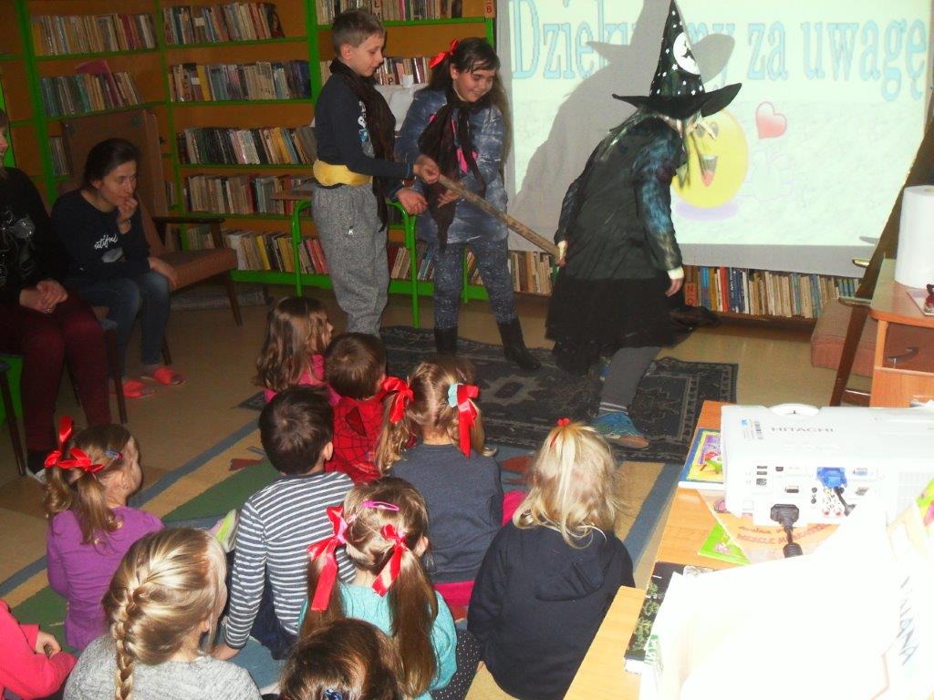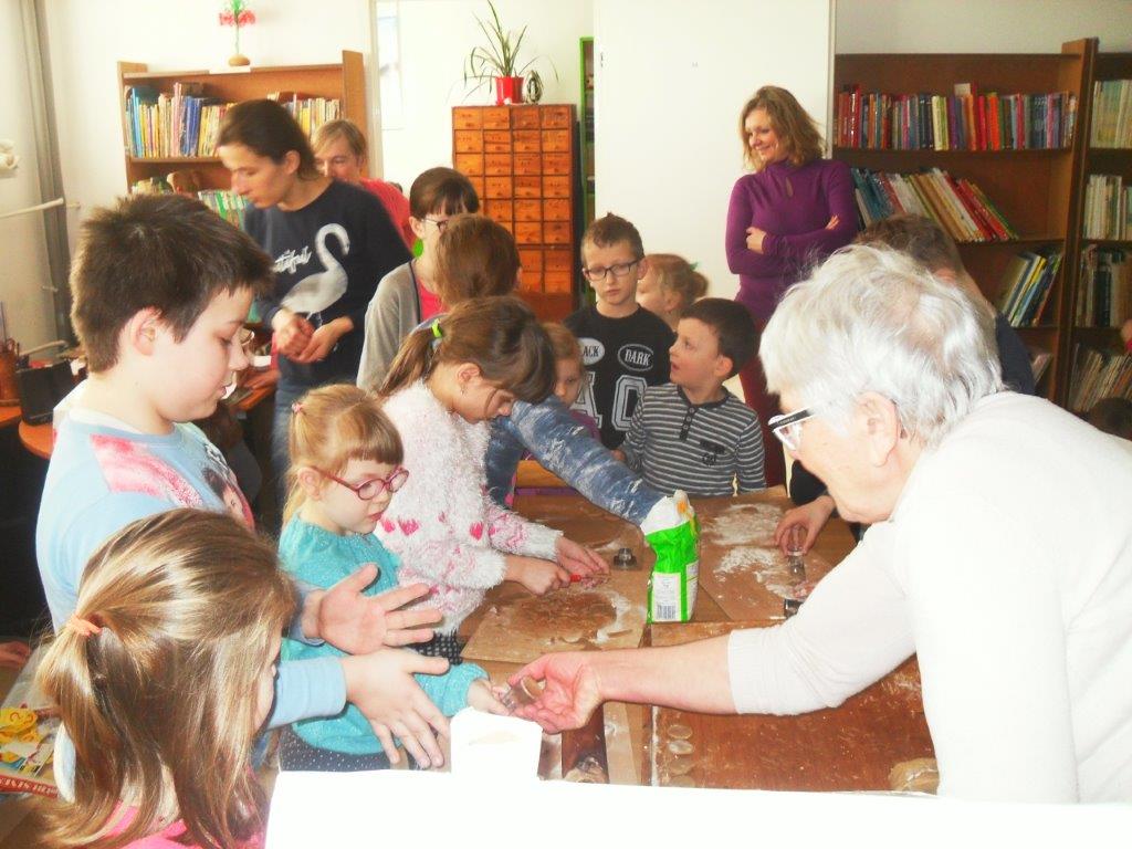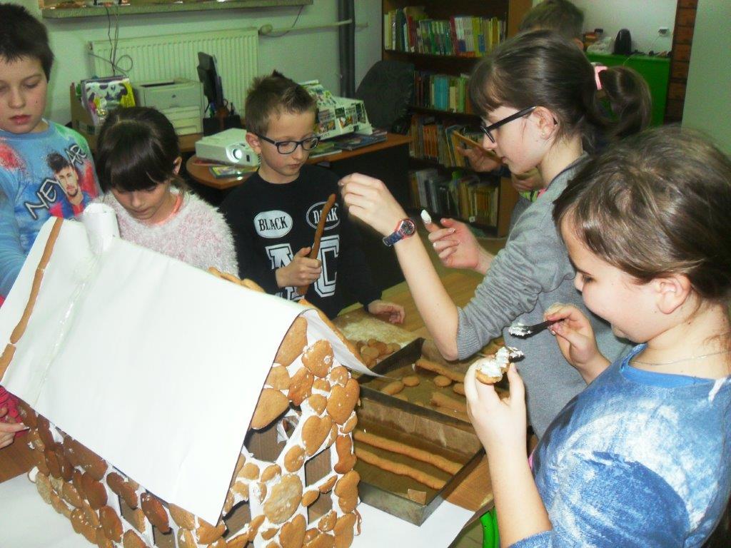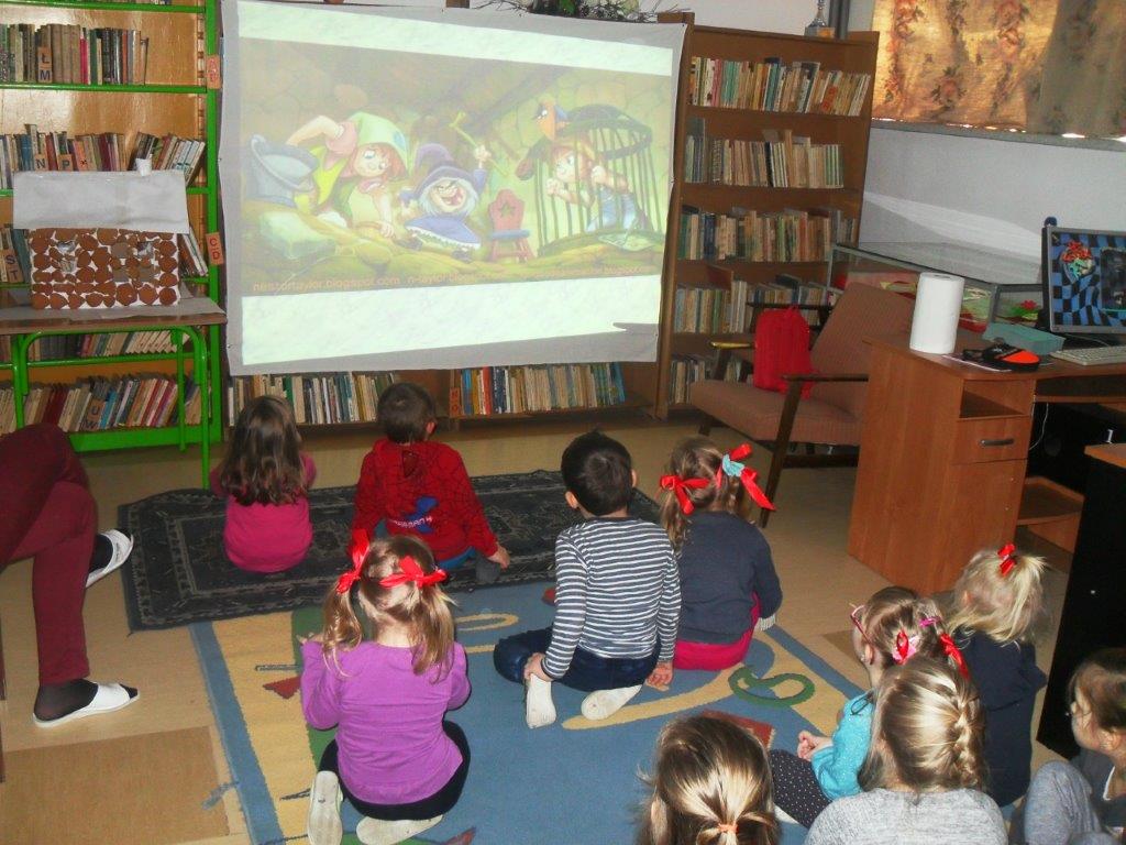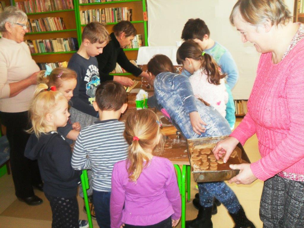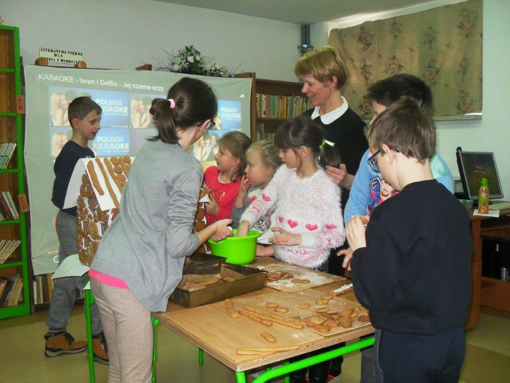W 3 dniu wypiekania pierniczków wszystkie dziewczynki i chłopcy zostali ucharakteryzowani na ,,Jasia i Małgosie”. Po wykrawaniu pierniczków obejrzały prezentacje multimedialną pt. ,,Jaś i Małgosia” przygotowaną przez p. bibliotekarkę oraz starsze dzieci odegrały krótką scenkę na której Baba Jaga uczy Jasia i Małgosie siadać na łopacie… W czasie, kiedy ciasteczka się piekły, dzieci bawiły się w kalambury, śpiewały ulubione piosenki i z niecierpliwością czekały na gotowe upieczone pierniczki. Na koniec, odbyła się dalsza dekoracja pachnącego domku.