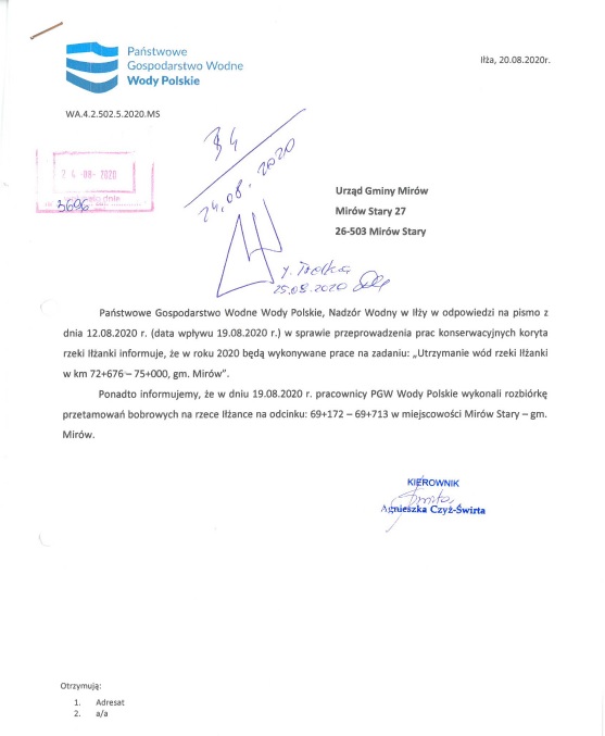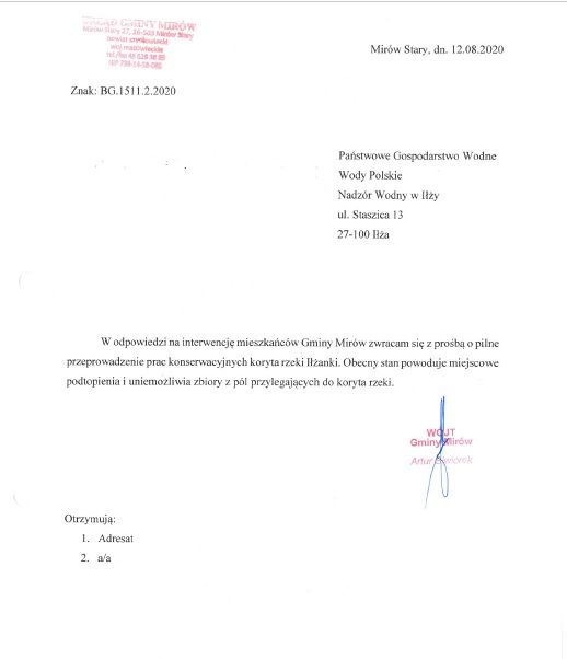 Od kilku miesięcy Urząd Gminy Mirów prowadzi korespondencję z delegaturą Wód Polskich w sprawie oczyszczenia koryta rzeki Iłżanki. Działanie urzędu było pokłosiem wielokrotnych interwencji mieszkańców, którzy przez spiętrzenie wody spowodowanie zarośnięciem koryta rzeki mają utrudniony dojazd do pól, a niekiedy prace polowe okazują się niemożliwe do wykonania.