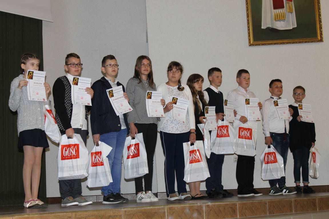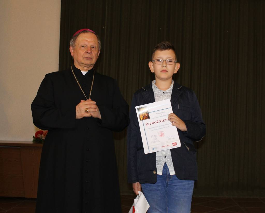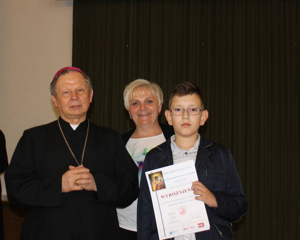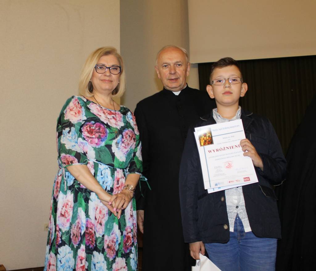 Dnia 16 maja 2018r. odbył się w Wyższym Seminarium Duchownym etap diecezjalny konkursu biblijnego ,,Jasnogórska Królowa Polski”. W eliminacjach wzięło udział 126 uczniów ze szkół diecezji radomskiej, w tym też uczeń naszej szkoły – Mateusz Bąk z klasy V, który otrzymał wyróżnienie. Dyplomy oraz wyróżnienia, wręczył ks. biskup ordynariusz naszej diecezji-Henryk Tomasik. Mateuszowi serdecznie gratulujemy wiedzy oraz wyróżnienia, które otrzymało 10 uczniów spośród uczestników konkursu. Mateusz został przygotowany przez p. Marzenę Chmielnicką.