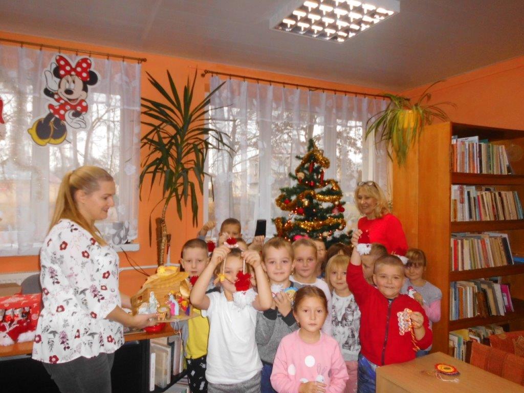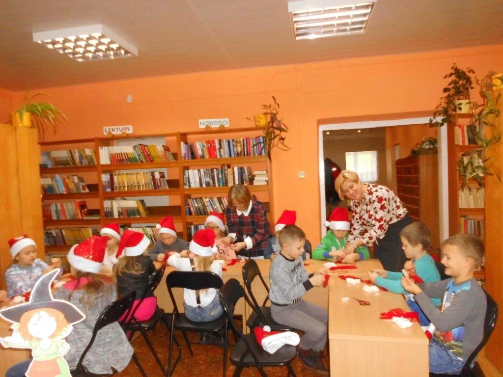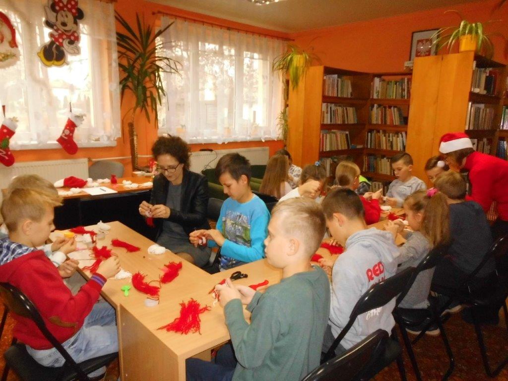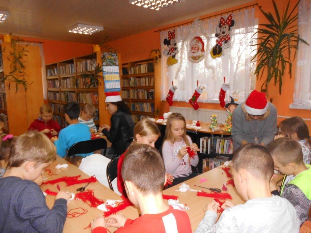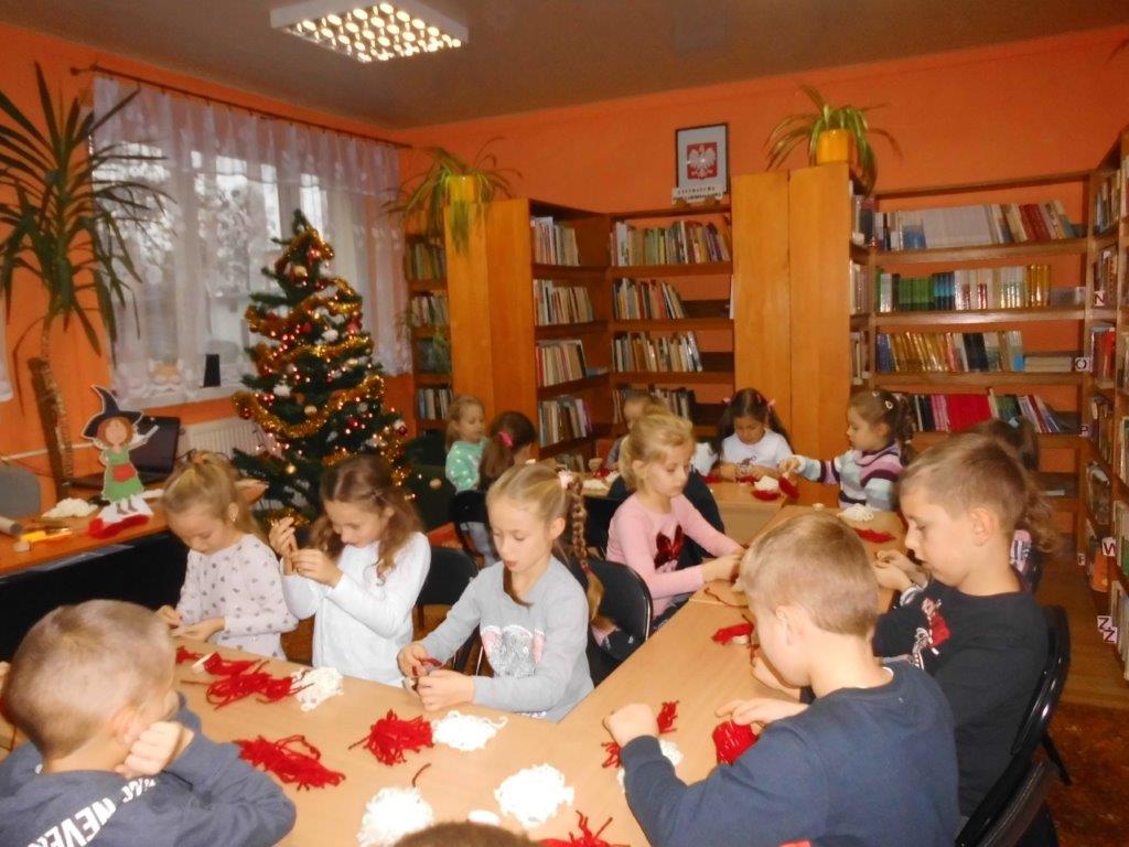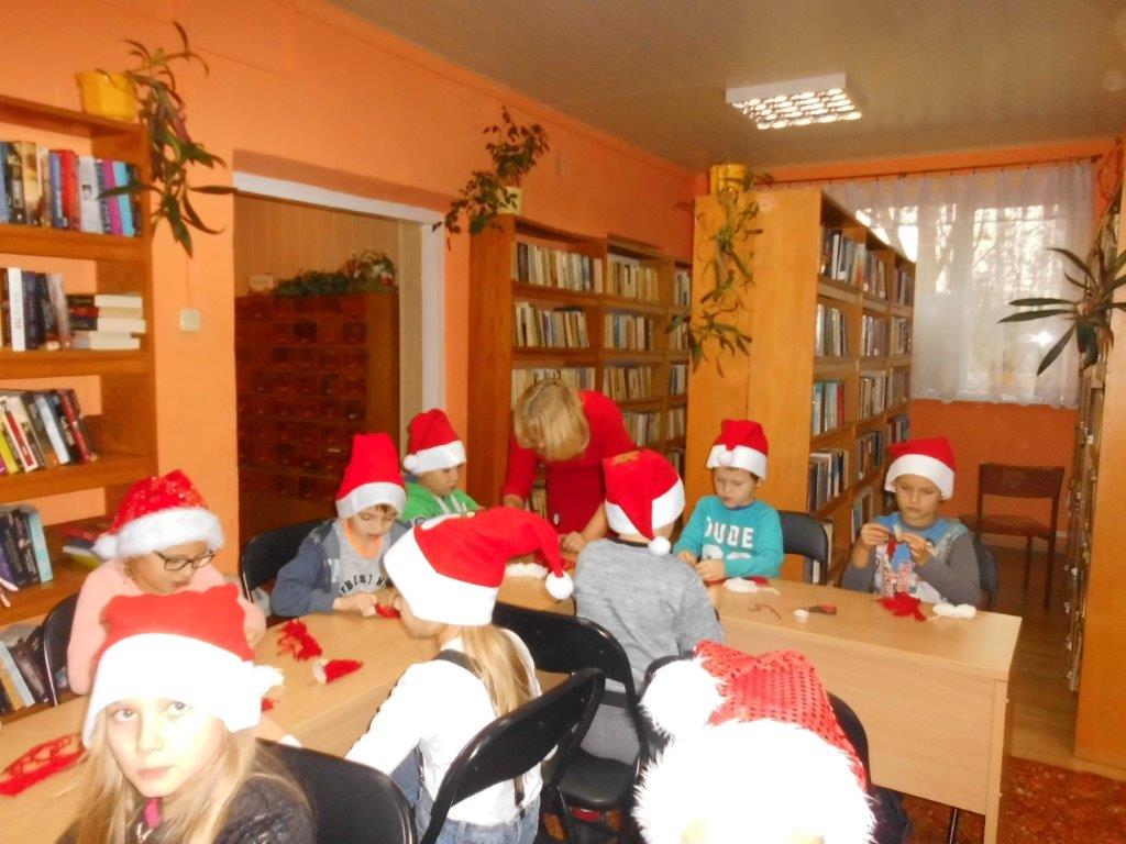 Wyrabiały z włóczki piękne główki mikołajkowe oraz kartonowe kolorowe ozdoby choinkowe, które mogły zabrać do domu. Wspólnie spędzony czas upłynął w miłej atmosferze przy recytowaniu wierszyków i śpiewaniu piosenek o Mikołaju. Panie bibliotekarki pokazały ciekawe i pięknie ilustrowane książki o tematyce mikołajkowej i bożonarodzeniowej, które można było wypożyczyć do domu. Na zakończenie wszyscy uczestnicy spotkań otrzymali czekoladowe figurki mikołajkowe. W filii bibliotecznej najmłodsze dzieci tworzyły z elementów papierowych piękną szopkę bożonarodzeniową, rozwiązywały quizy ze świętym Mikołajem oraz rozmawiały o tradycji związanej z Bożym Narodzeniem. Starsze dzieciaki, robiły papierowe gwiazdki 3D, co było nie lada wyzwaniem, ale efekt był zachwycający, pomimo, że zajęło to dość dużo czasu.