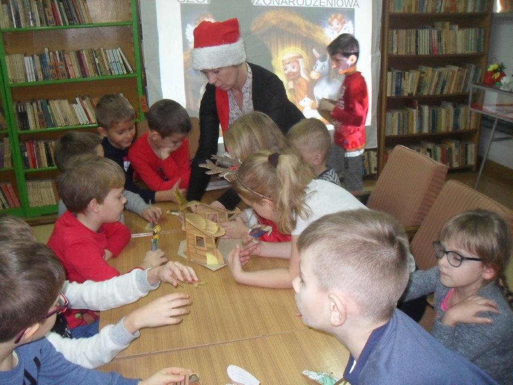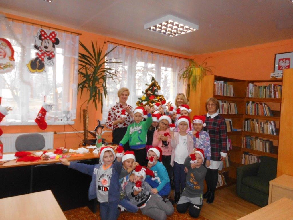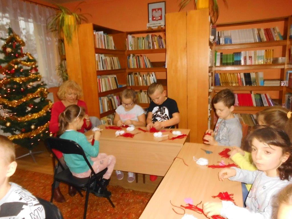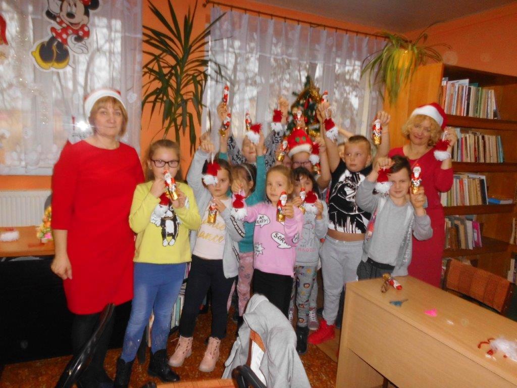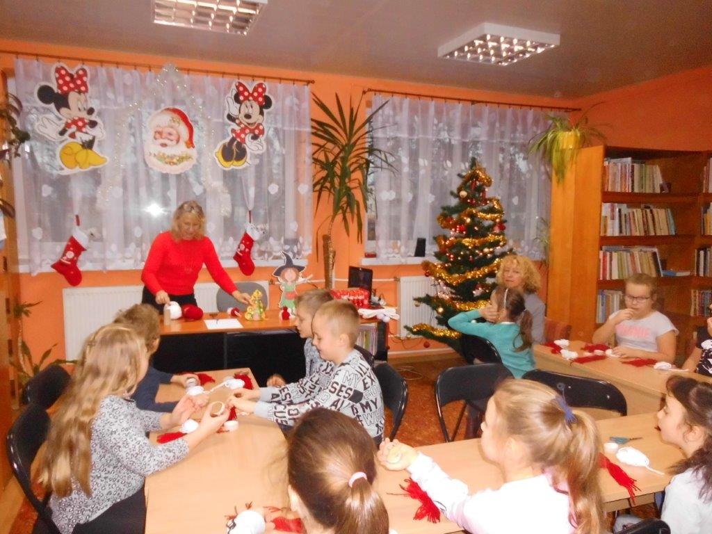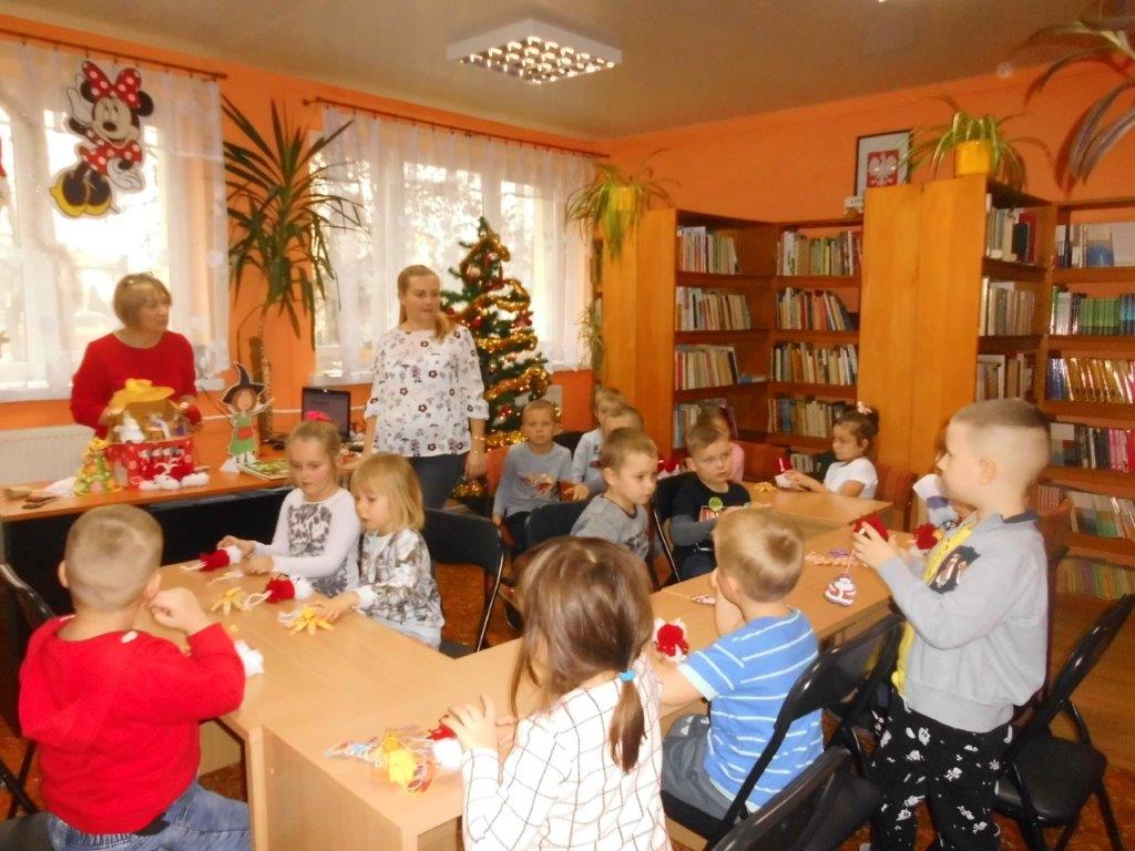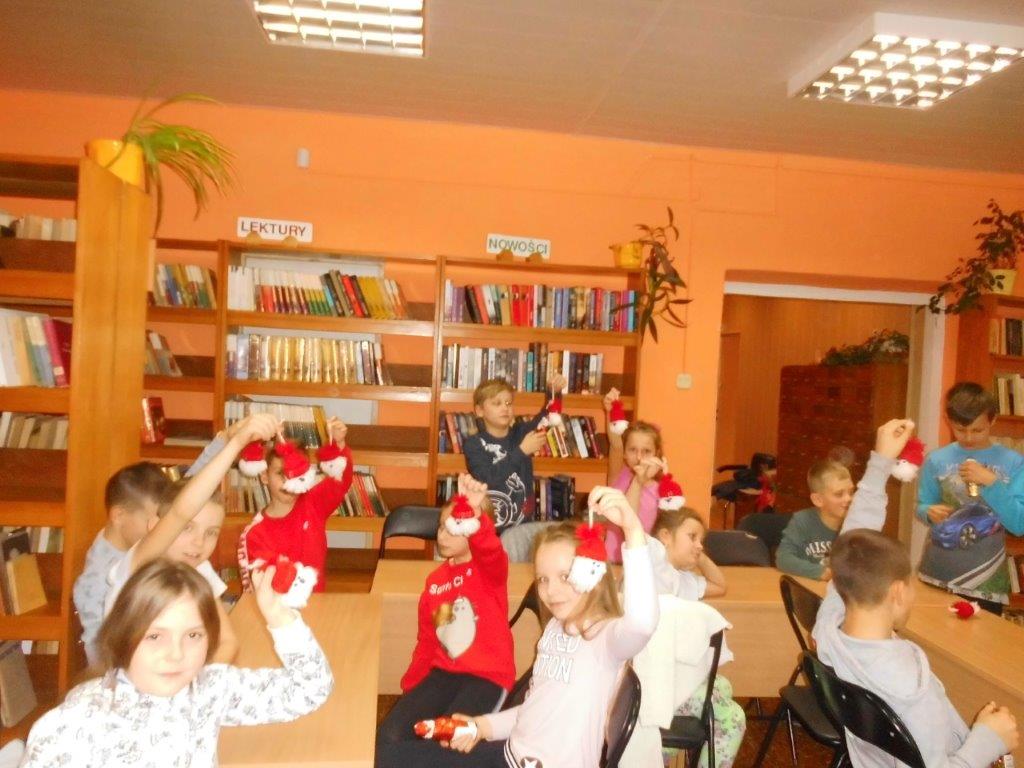 Wyrabiały z włóczki piękne główki mikołajkowe oraz kartonowe kolorowe ozdoby choinkowe, które mogły zabrać do domu. Wspólnie spędzony czas upłynął w miłej atmosferze przy recytowaniu wierszyków i śpiewaniu piosenek o Mikołaju. Panie bibliotekarki pokazały ciekawe i pięknie ilustrowane książki o tematyce mikołajkowej i bożonarodzeniowej, które można było wypożyczyć do domu. Na zakończenie wszyscy uczestnicy spotkań otrzymali czekoladowe figurki mikołajkowe. W filii bibliotecznej najmłodsze dzieci tworzyły z elementów papierowych piękną szopkę bożonarodzeniową, rozwiązywały quizy ze świętym Mikołajem oraz rozmawiały o tradycji związanej z Bożym Narodzeniem. Starsze dzieciaki, robiły papierowe gwiazdki 3D, co było nie lada wyzwaniem, ale efekt był zachwycający, pomimo, że zajęło to dość dużo czasu.