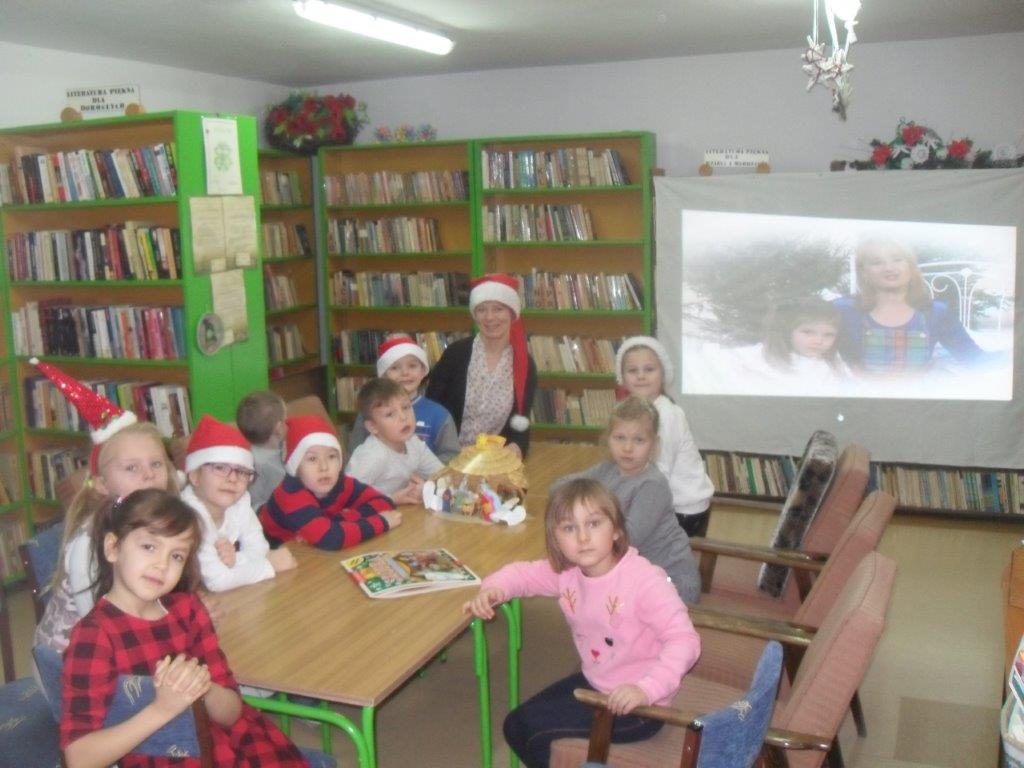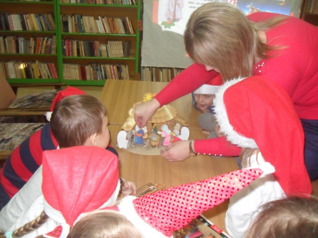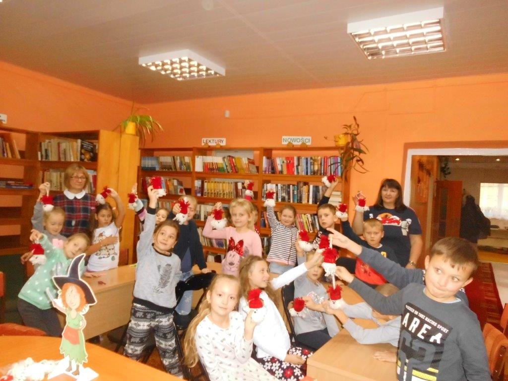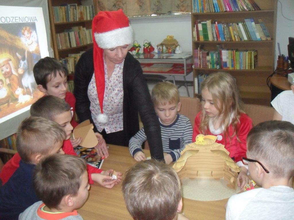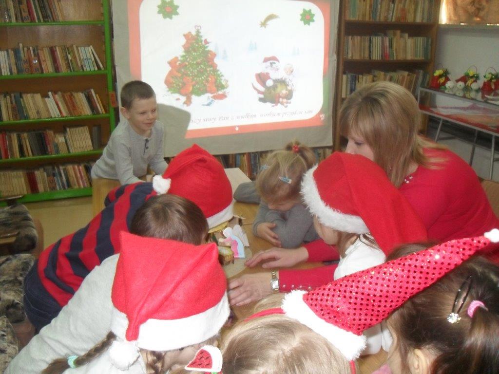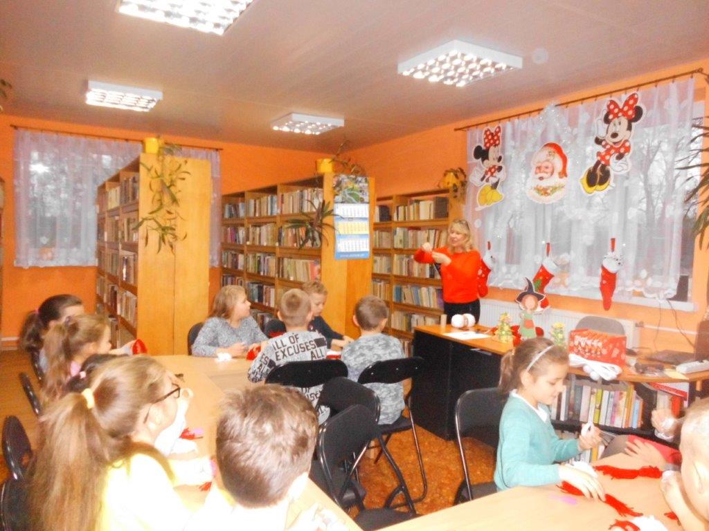 Wyrabiały z włóczki piękne główki mikołajkowe oraz kartonowe kolorowe ozdoby choinkowe, które mogły zabrać do domu. Wspólnie spędzony czas upłynął w miłej atmosferze przy recytowaniu wierszyków i śpiewaniu piosenek o Mikołaju. Panie bibliotekarki pokazały ciekawe i pięknie ilustrowane książki o tematyce mikołajkowej i bożonarodzeniowej, które można było wypożyczyć do domu. Na zakończenie wszyscy uczestnicy spotkań otrzymali czekoladowe figurki mikołajkowe. W filii bibliotecznej najmłodsze dzieci tworzyły z elementów papierowych piękną szopkę bożonarodzeniową, rozwiązywały quizy ze świętym Mikołajem oraz rozmawiały o tradycji związanej z Bożym Narodzeniem. Starsze dzieciaki, robiły papierowe gwiazdki 3D, co było nie lada wyzwaniem, ale efekt był zachwycający, pomimo, że zajęło to dość dużo czasu.