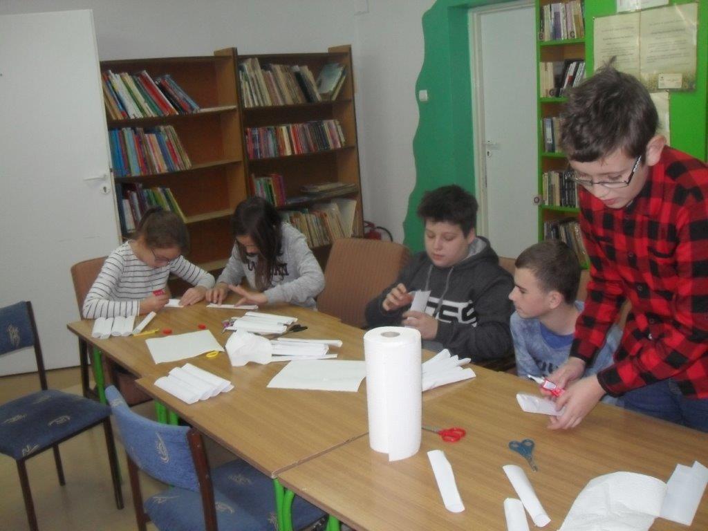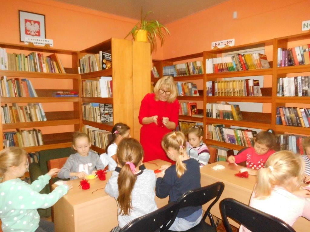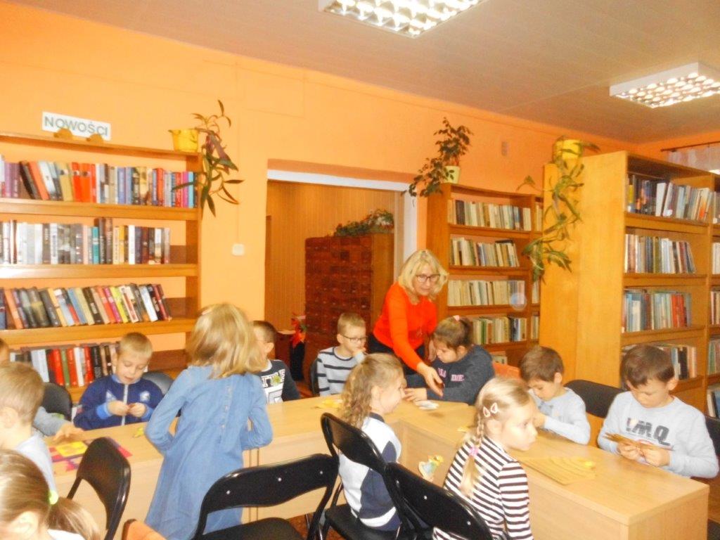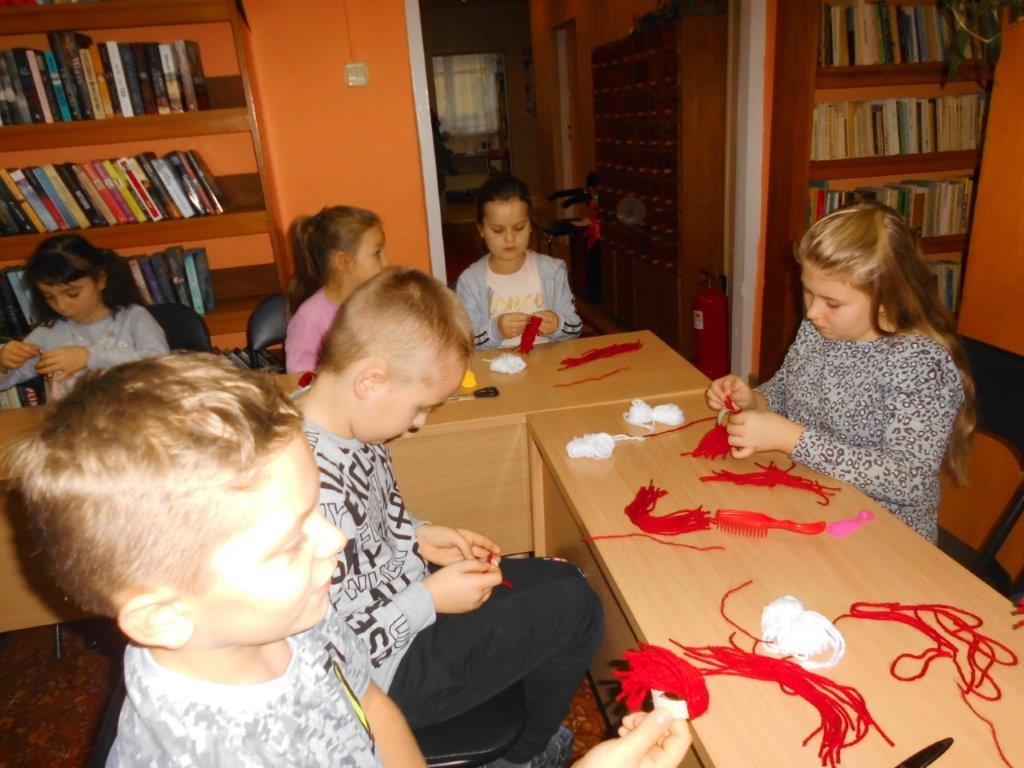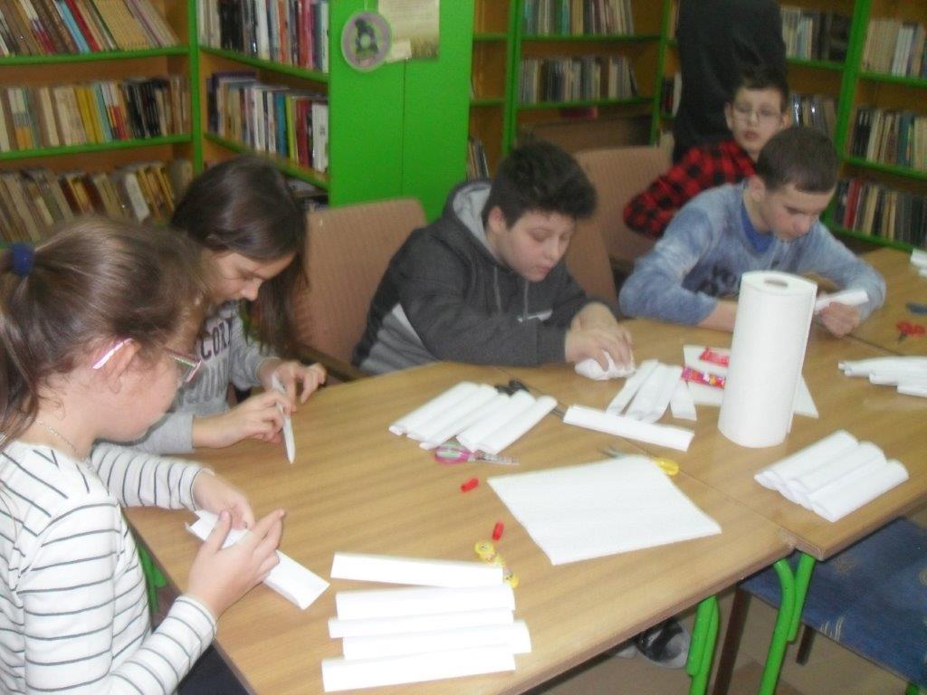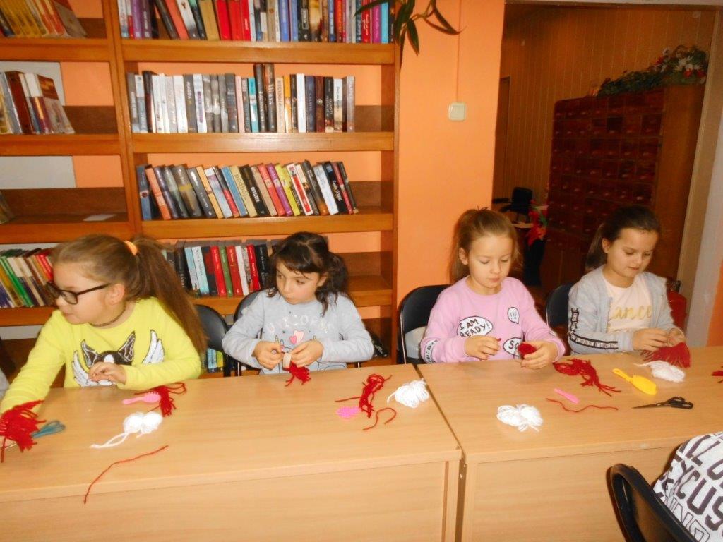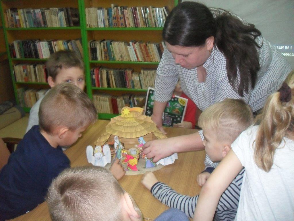 Wyrabiały z włóczki piękne główki mikołajkowe oraz kartonowe kolorowe ozdoby choinkowe, które mogły zabrać do domu. Wspólnie spędzony czas upłynął w miłej atmosferze przy recytowaniu wierszyków i śpiewaniu piosenek o Mikołaju. Panie bibliotekarki pokazały ciekawe i pięknie ilustrowane książki o tematyce mikołajkowej i bożonarodzeniowej, które można było wypożyczyć do domu. Na zakończenie wszyscy uczestnicy spotkań otrzymali czekoladowe figurki mikołajkowe. W filii bibliotecznej najmłodsze dzieci tworzyły z elementów papierowych piękną szopkę bożonarodzeniową, rozwiązywały quizy ze świętym Mikołajem oraz rozmawiały o tradycji związanej z Bożym Narodzeniem. Starsze dzieciaki, robiły papierowe gwiazdki 3D, co było nie lada wyzwaniem, ale efekt był zachwycający, pomimo, że zajęło to dość dużo czasu.