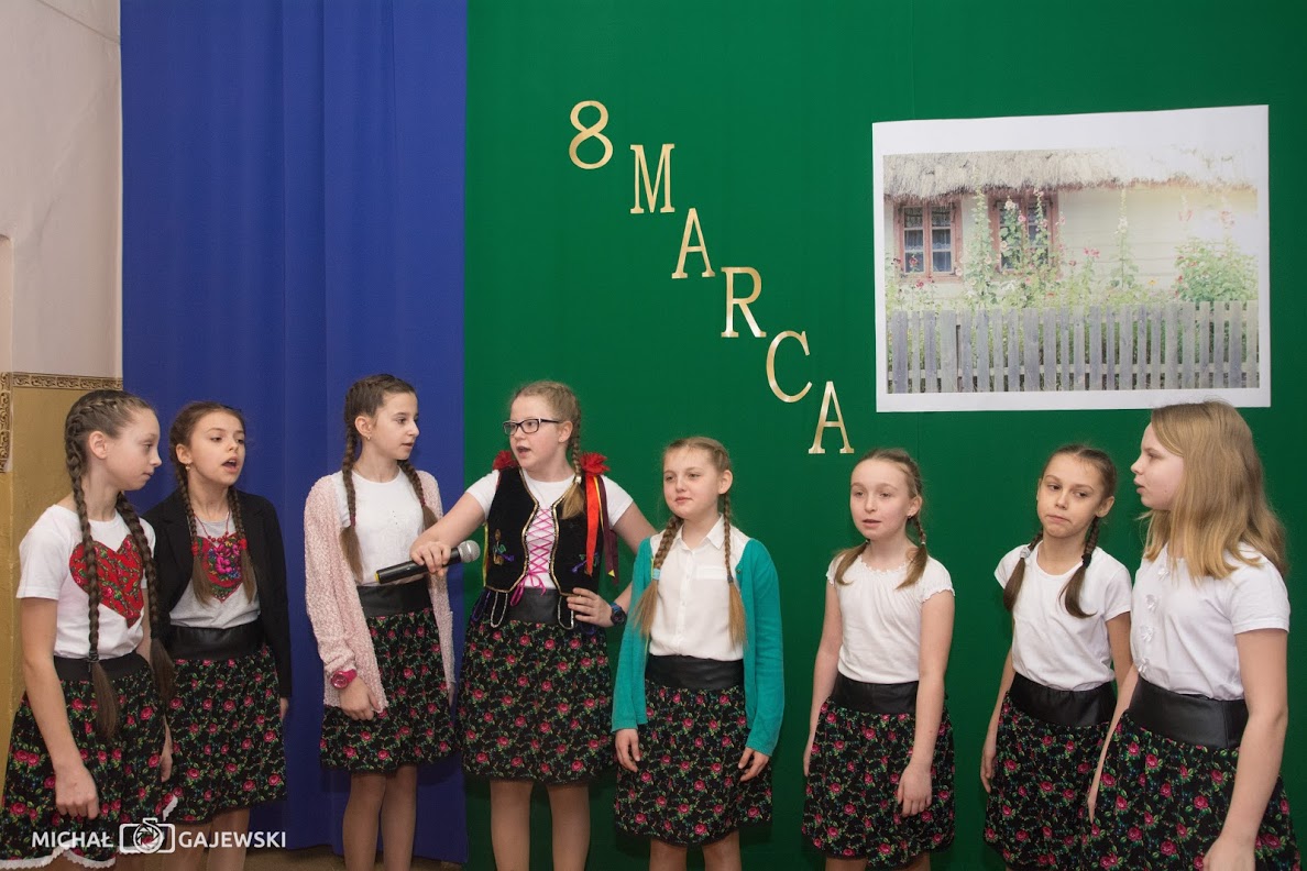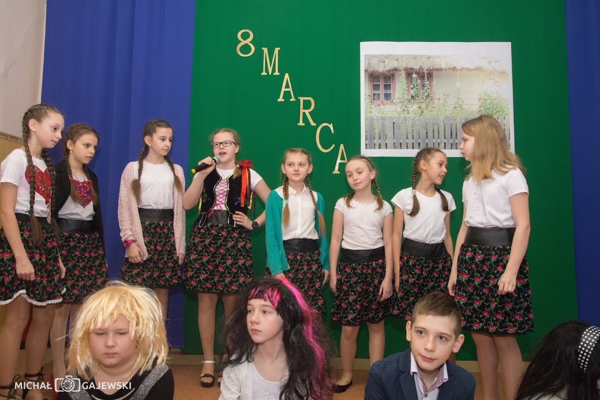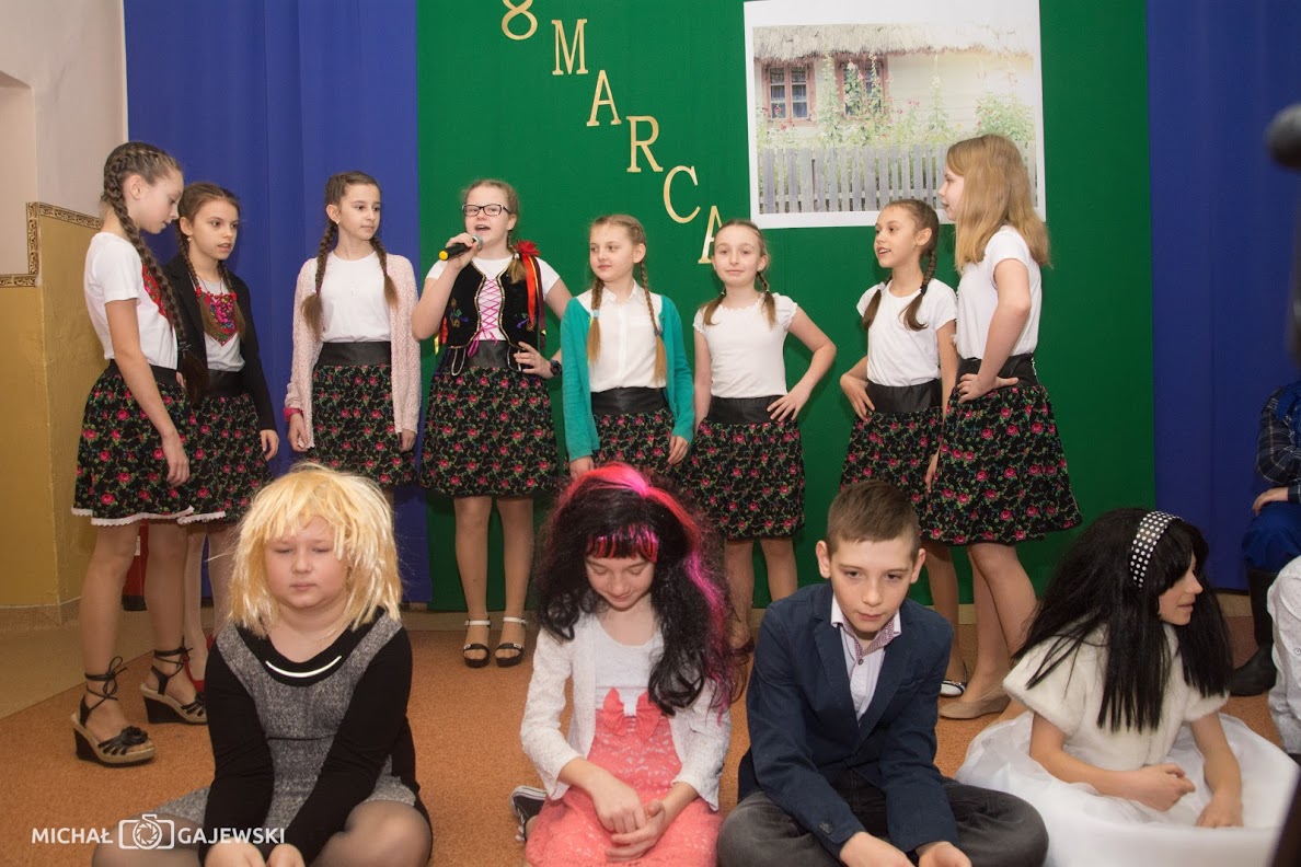 Jak więc świętować Dzień Kobiet we współczesnej Polsce? Najlepszym rozwiązaniem wydaje się być dostrzeżenie tego dnia wkładu pań w życie społeczne, rodzinne i polityczne naszego kraju; dowartościowanie roli matki, żony i koleżanki z pracy, podziękowanie za ich codzienną empatyczną, pełną troski i miłości obecność; sprawienie, by na zabieganej twarzy współczesnej kobiety godzącej opiekę nad ogniskiem domowym z obowiązkami zawodowymi pojawił się uśmiech. Ten ostatni cel wyznaczyli sobie autorzy tegorocznego występu z okazji Dnia Kobiet, Karol Kaczmarzyk i Michał Gajewski. Z kreatywnym i pełnym zaangażowania udziałem klasy V zaprezentowali program artystyczny pt. „Rolnik szuka żony” nawiązujący do popularnego programu telewizyjnego. Utarła się tradycja, że 8 marca w role dziewcząt wcielają się chłopcy, tak więc i tym razem role kandydatek na żony rolników odegrali chłopcy. Mieli przed sobą nie lada wyzwania: wykonanie makijażu, dojenie krowy czy skrobanie ziemniaków, z których wywiązali się wzorowo, ku uciesze zgromadzonej widowni. Część chłopców wcieliła się w role zdesperowanych starokawalerstwem rolników szukających szczęścia w miłości zaś dziewczęta zajęły się oprawą muzyczną wstępu. Na zakończenie akademii popłynęła moc gorących życzeń dla wszystkich PAŃ i DZIEWCZĄT. I pomimo, iż pogoda za oknem nie była przyjemna, to w szkolnych salach panował ciepły, pogodny i wesoły nastrój.