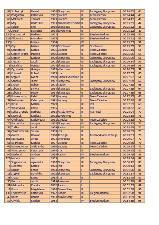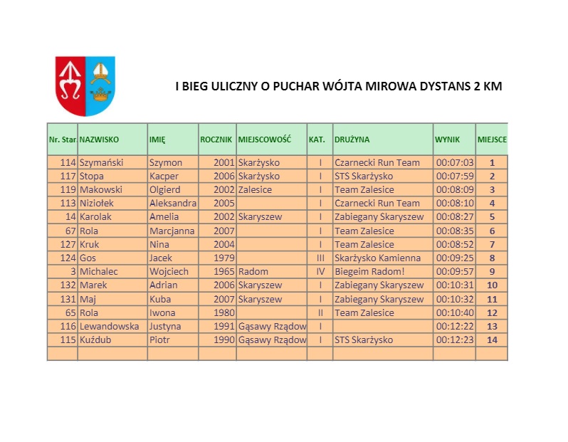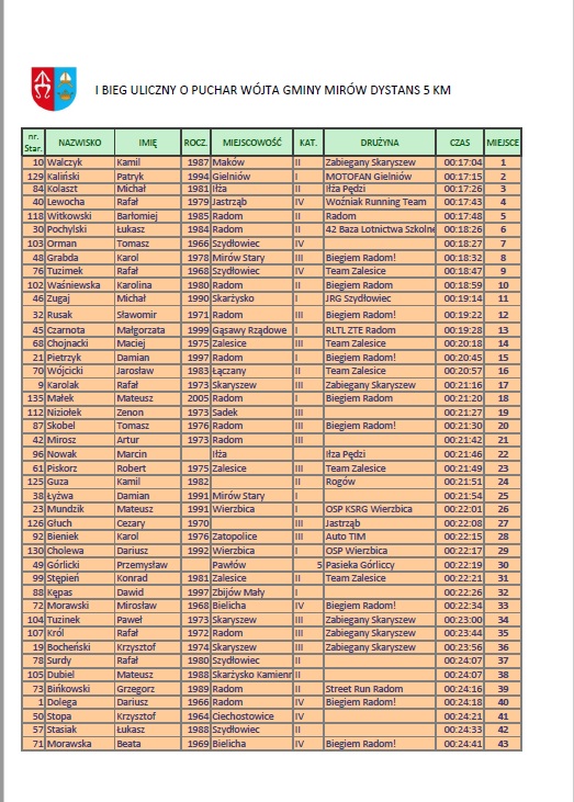 Wyniki niedzielnej imprezy potwierdziły niezwykle wysoki poziom sportowy startujących zawodników. W biegu na 5 km zwyciężył Kamil Walczyk (17:04) , drugi był Patryk Kaliński (17:15) a trzeci Michał Kolaszt (17:26). Wśród kobiet na tym dystansie najszybsza była Karolina Waśniewska (18:59), druga Małgorzata Czarnota (19:28) a trzecia Beata Morawska (24:41). W biegu na 2 km w klasyfikacji mężczyzn zwyciężył Szymon Szymański (7:03), drugie miejsce zajął Kacper Stopa (7:59) a trzecie Olgierd Makowski (8:09). W klasyfikacji kobiet zwyciężyła Aleksandra Niziołek (8:10) druga dobiegła Amelia Karolak (8:27) a trzecia Marcjanna Rola (8:35). W sumie w imprezie brało udział 111 zawodników, w tym 14 na dystansie 2 km, co jak na pierwszą edycję jest bardzo dobrym wynikiem. Wśród reprezentacji dominowały trzy kluby: Zabiegany Skaryszew, Biegiem Radom oraz Zalesice Team. Biegła też trzyosobowa reprezentacja Iłża Pędzi. Imprezę poprowadził wielokrotny maratończyk a jednocześnie Prezes Klubu Biegiem Radom – Tadeusz Kraska. Imprezę otworzyli przedstawiciele samorządu: Wójt Gminy Mirów, Artur Siwiorek oraz Przewodniczący Rady Gminy Mirów Wiesław Morawiak.