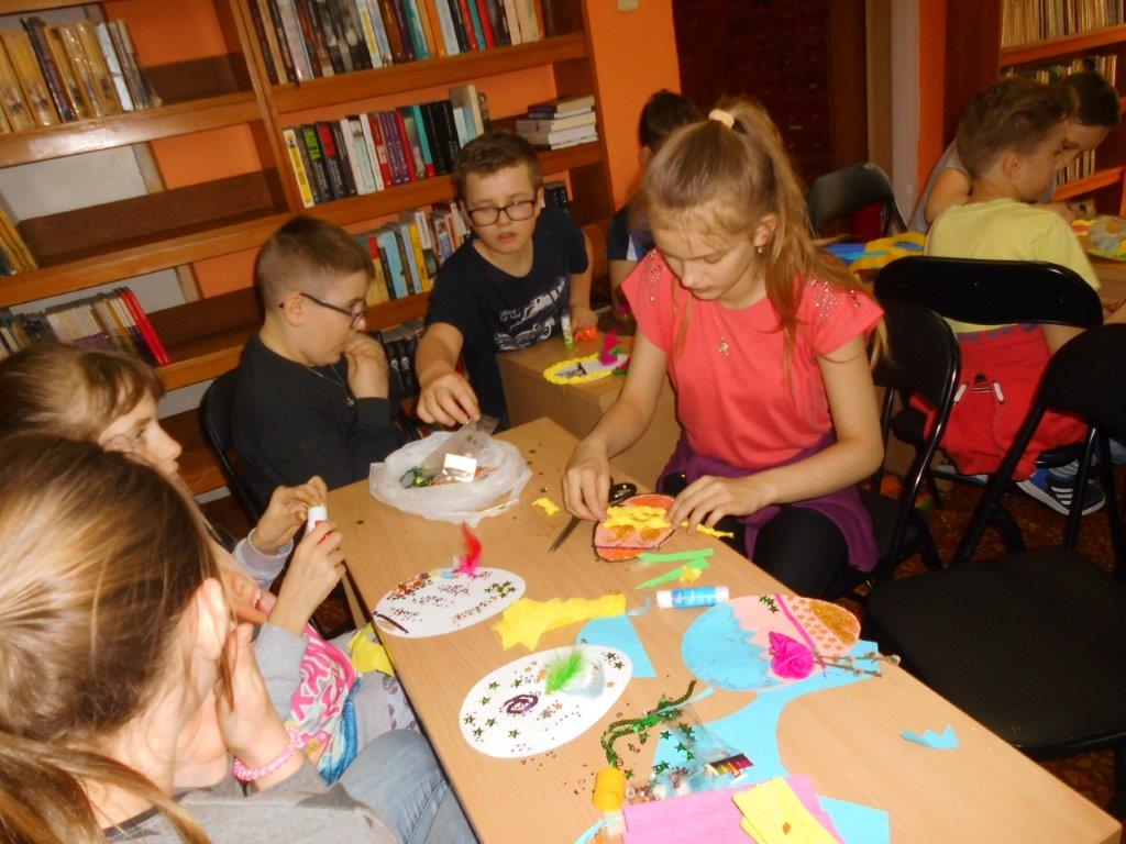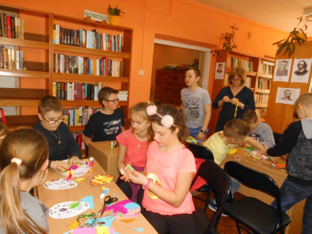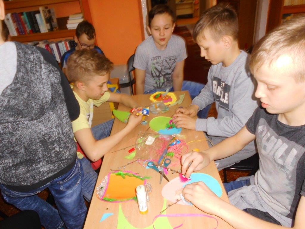 W warsztatach uczestniczyły również dzieci ze szkół podstawowych, które z wydmuszek jajek wykonywały kolorowe kurczaczki, aby później przyozdobić własnoręcznie zrobione stroiki świąteczne. Najmłodsi natomiast mieli okazję stworzyć swoje własne kolorowe pisanki z papieru, które przyozdabiali kolorową bibułą, cekinami, brokatem, piórkami, baziami i dekoracyjnym sznurkiem. W świąteczny klimat spotkania „wprowadziła” pogadanka o zwyczajach i tradycjach związanych z palmą i pisanką wielkanocną.