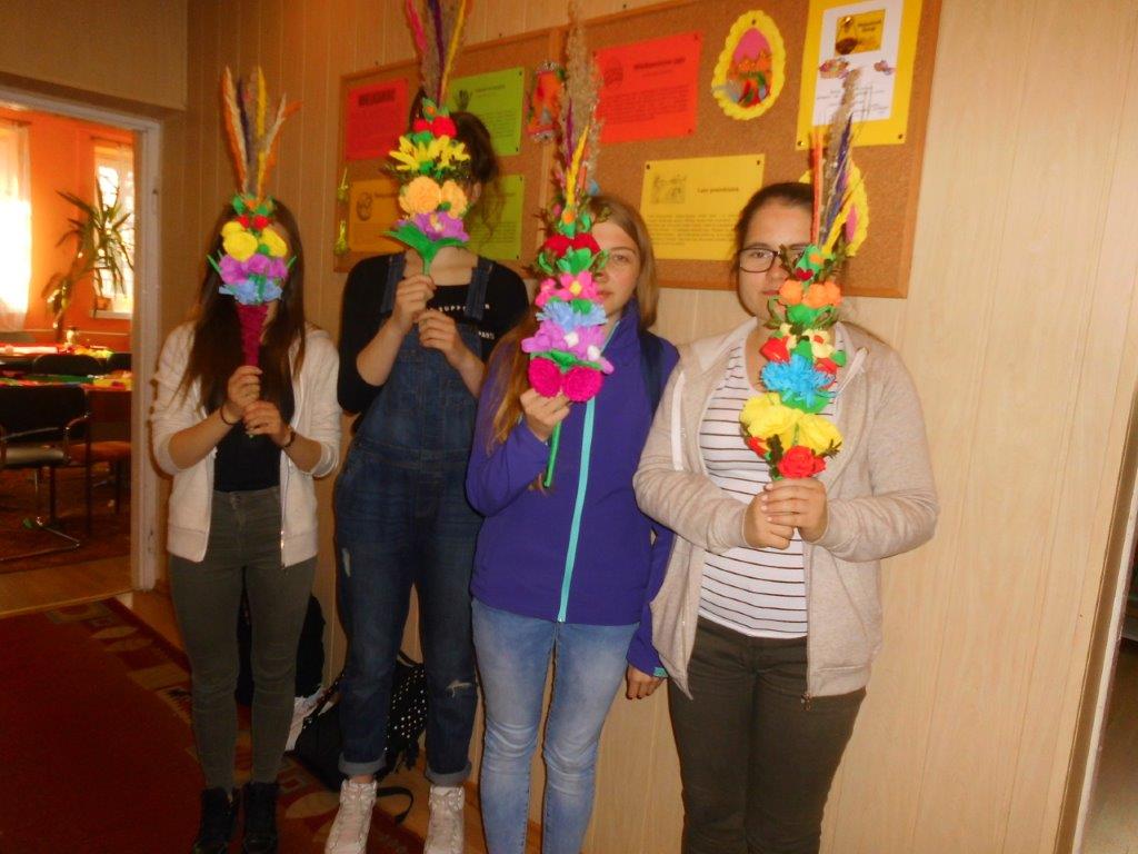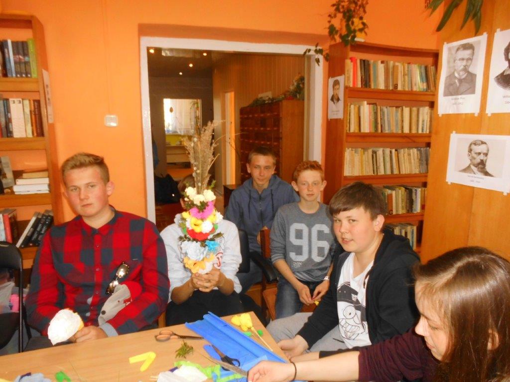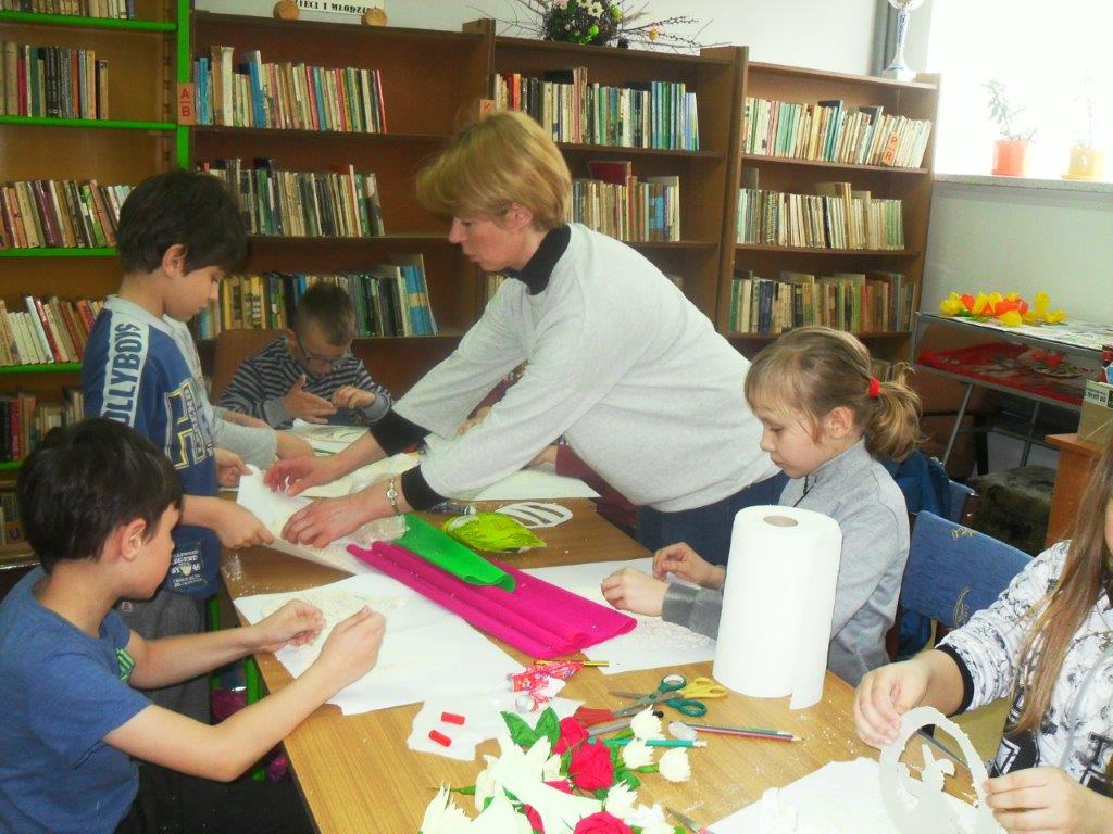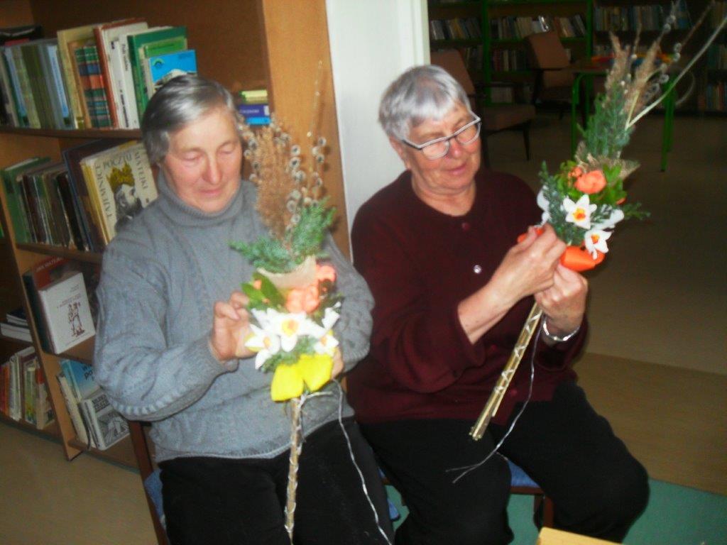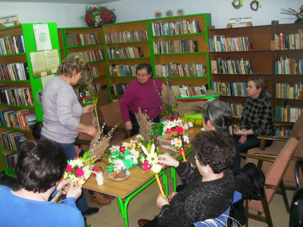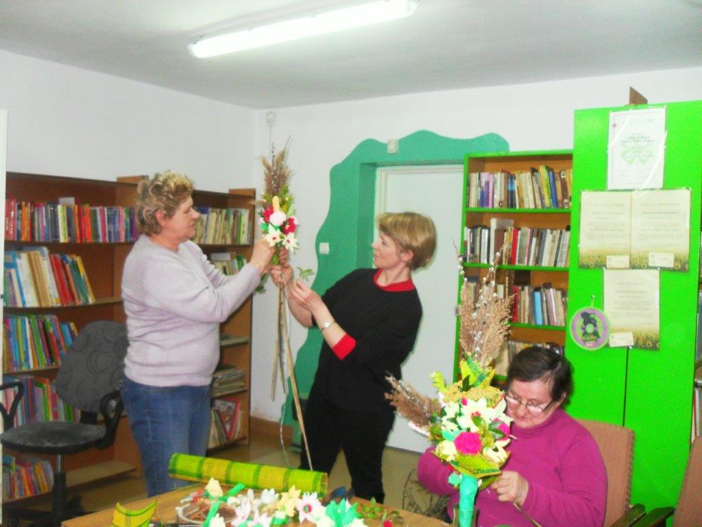 Wiele tradycji i zwyczajów wielkanocnych, z pokolenia na pokolenie wciąż jest przez nas kultywowanych. W dniach 4 i 5 kwietnia w Gminnej Bibliotece Publicznej w Mirowie i Filii Bibliotecznej w Zbijowie Małym odbyły się warsztaty rękodzielnicze „Palma i pisanka wielkanocna”. W warsztatach uczestniczyły młodzież gimnazjalna i chętne mieszkanki z terenu naszej gminy. Pod okiem pań B. Seweryn, A. Erbel i E. Dzik uczestnicy wykonywali palmy wielkanocne. W każdej palmie nie mogło zabraknąć bazi, bukszpanu, polnej trawy, gałązek wierzbowych i leśnych borówek. Kwiaty z bibuły i krepiny znakomicie uzupełniały własnoręcznie zrobione palmy.