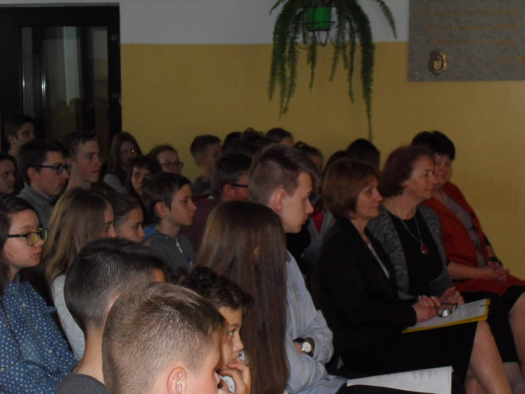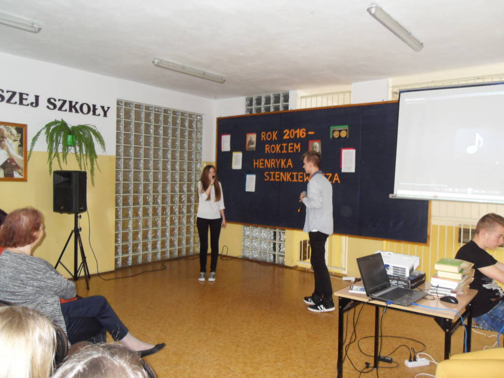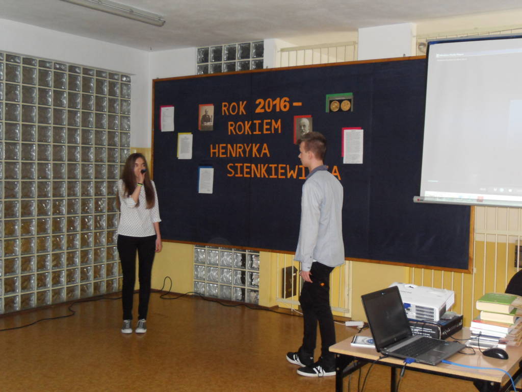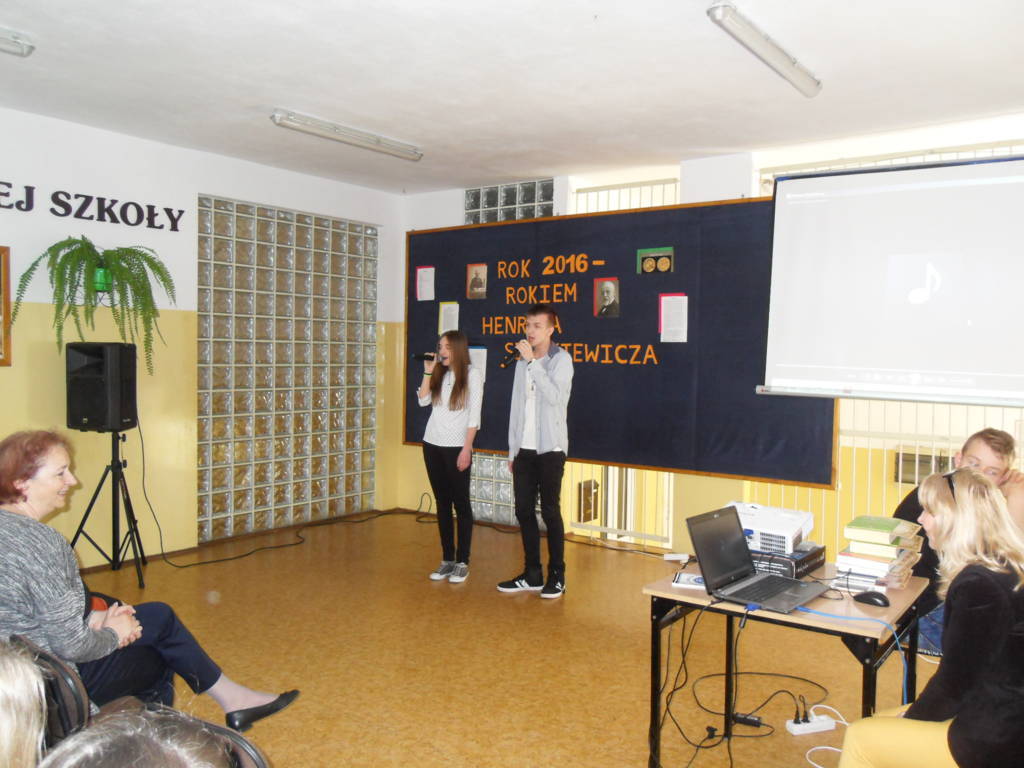 Uzupełnieniem prezentacji multimedialnej był występ uczniów klasy III b Publicznego Gimnazjum im. Jana Pawła II - Mileny Marlicy i Ernesta Bąka z repertuarem piosenek adaptacji filmowych dzieł Henryka Sienkiewicza.