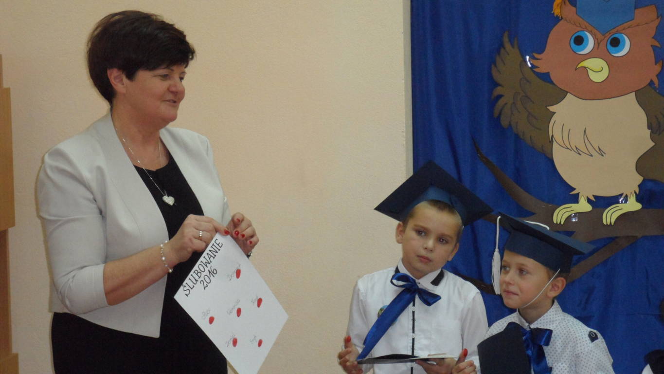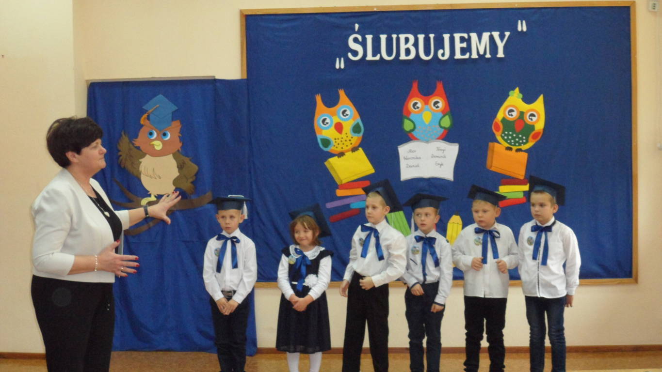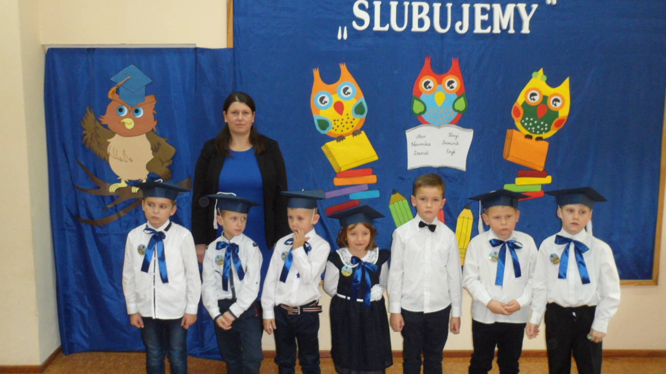 Uroczystość rozpoczęła się odśpiewaniem hymnu państwowego oraz hymnu szkoły. Następnie uroczyste ślubowanie złożyli członkowie Samorządu Uczniowskiego, którego opiekunem w roku szkolnym 2016/2017 jest p. Agnieszka Zaborska. Kolejnym wydarzeniem było ślubowanie i pasowanie pierwszaków. Tego dnia do społeczności uczniowskiej zostali włączeni następujący uczniowie klasy I : Krzysztof, Alex ,Dominik, Daniel, Weronika , Eryk. Część artystyczną przygotowała wychowawczyni p. Anna Bąk, podczas której dzieci recytowały wiersze oraz śpiewały piosenki.