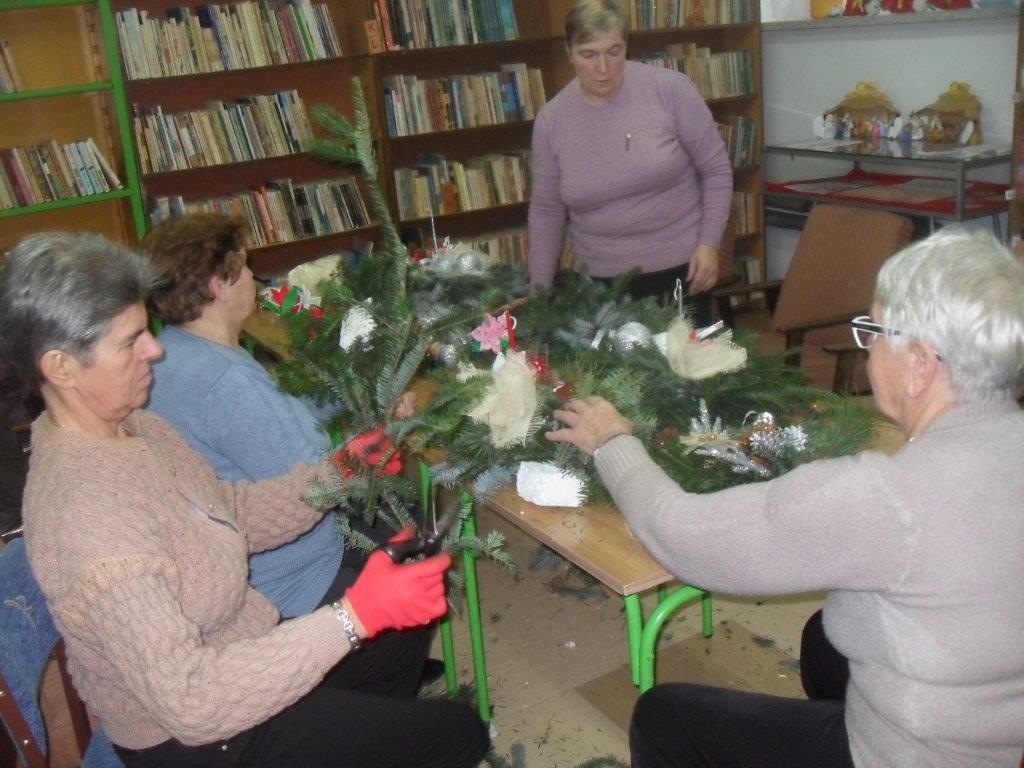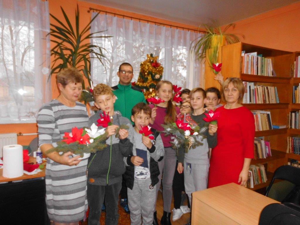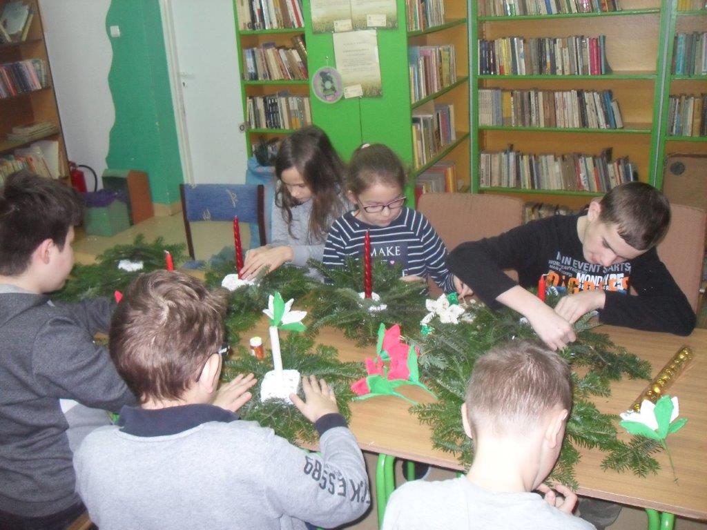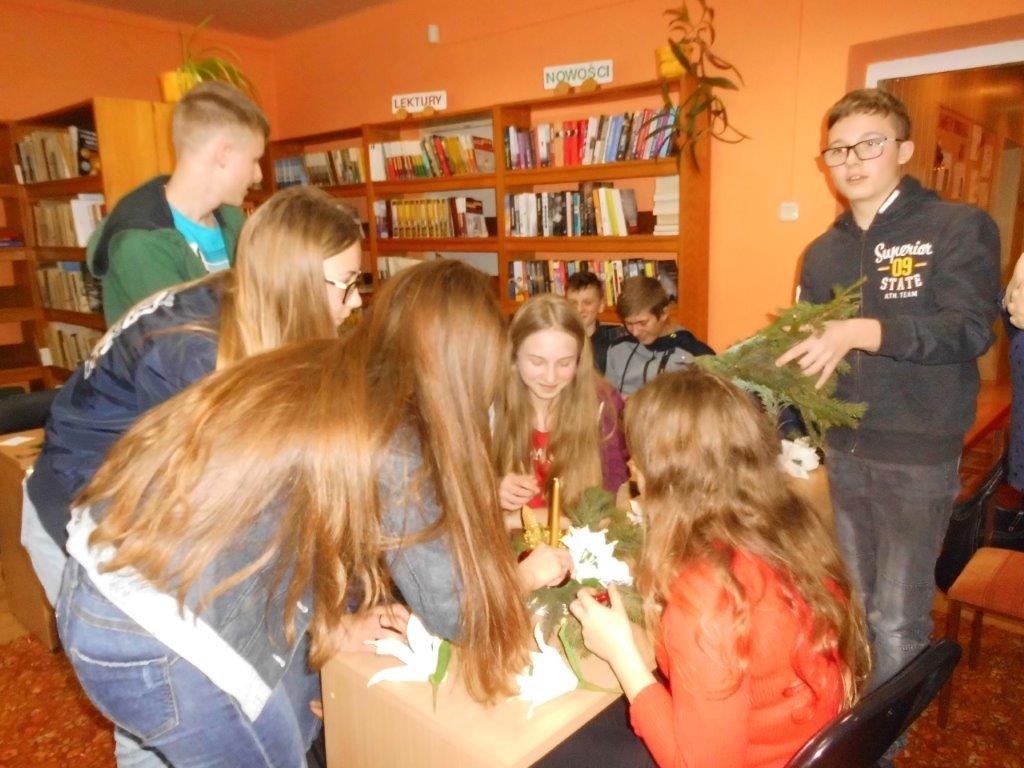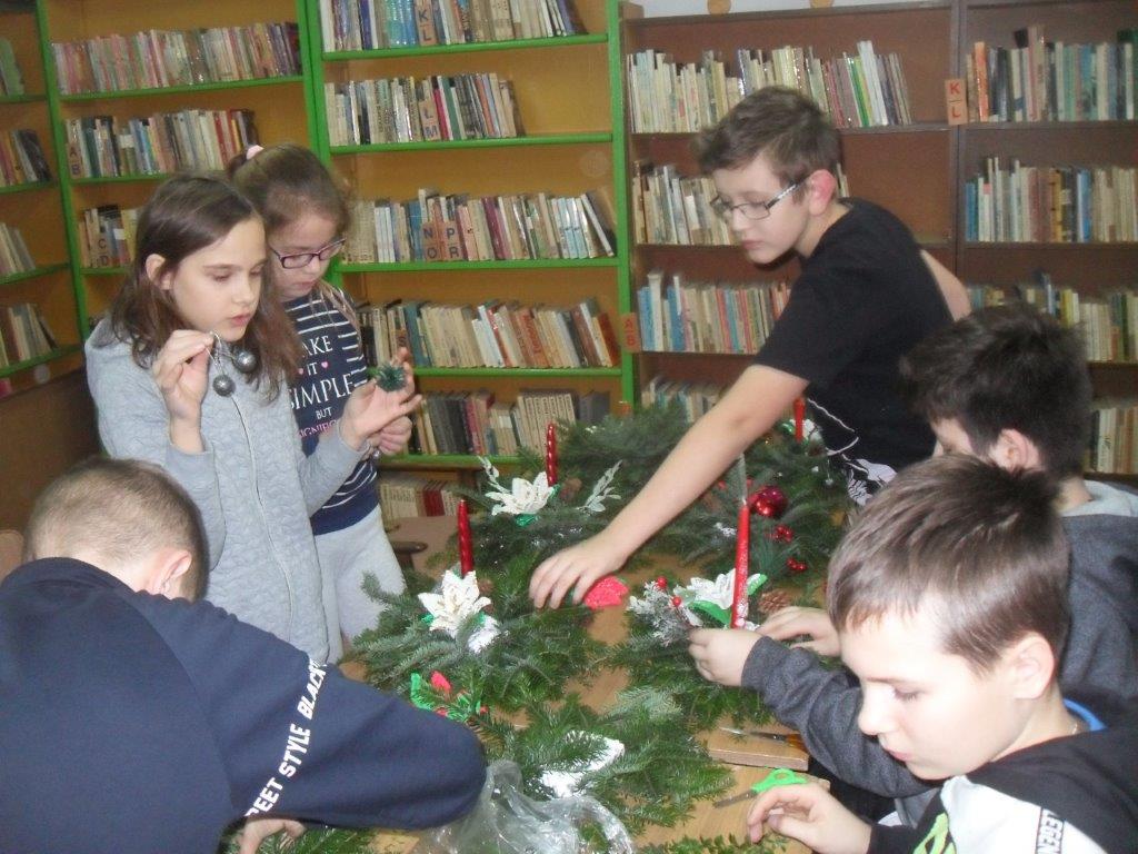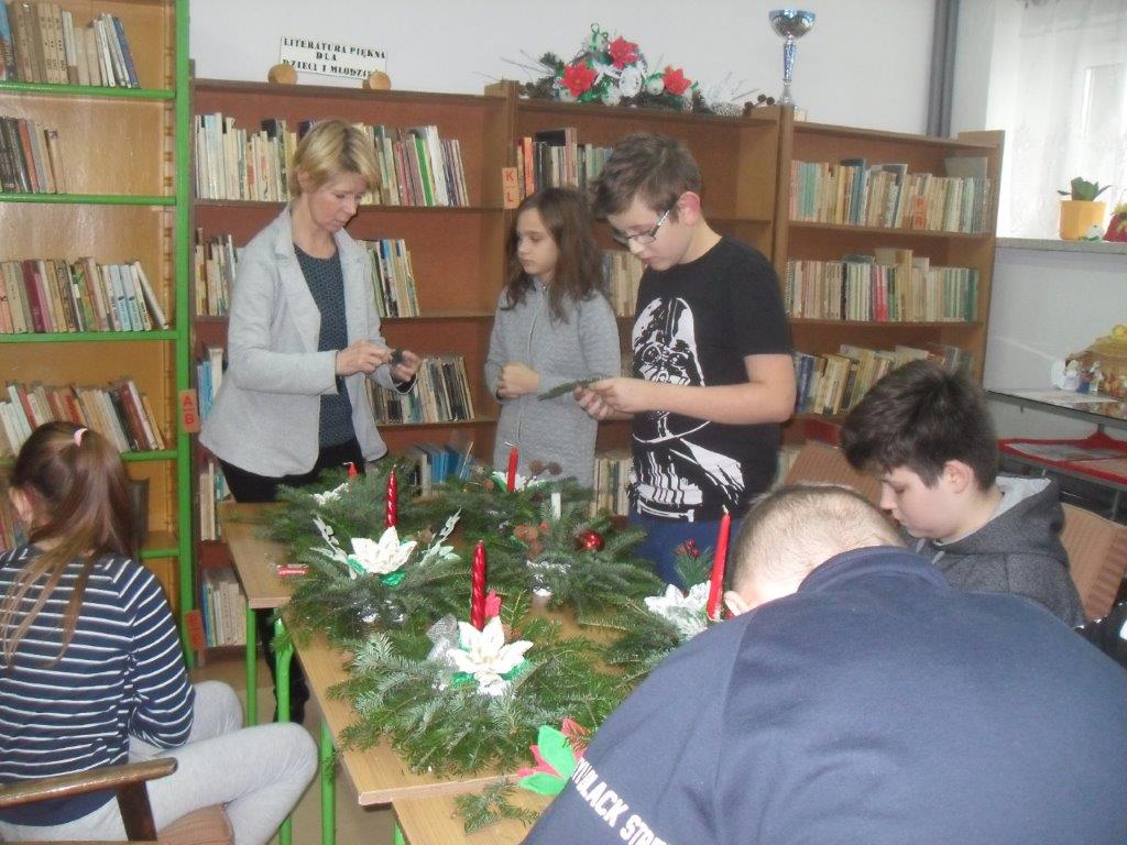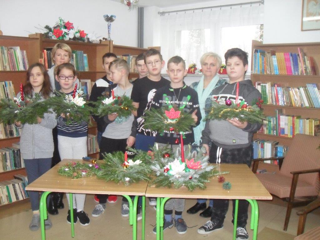 Święta Bożego Narodzenia, to czas radości, przebaczania, ale także jest to czas refleksji i spotkań nie tylko rodzinnych. Przedświąteczny czas posłużył nam do tego, aby w Gminnej Bibliotece Publicznej w Mirowie i Filii Bibliotecznej w Zbijowie Małym zorganizować spotkania dla dorosłych, młodzieży i dzieci. Celem spotkań było wykonanie tradycyjnych stroików, które będą ozdobą stołu wigilijnego na spotkaniu osób samotnych w Urzędzie Gminy Mirów. Stroiki były wykonane z jedliny, zdobiły je bombki, świeczki, szyszki a także kwiaty z krepiny wykonane samodzielnie przez uczniów.