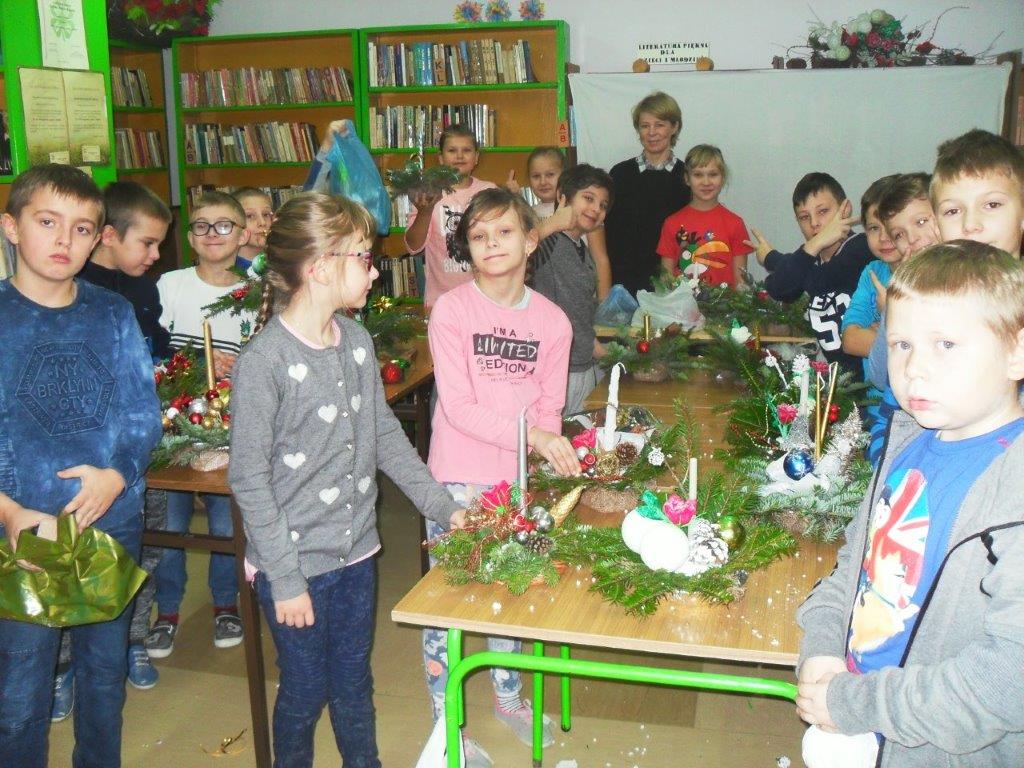 Podsumowanie tych spotkań odbyło się dnia 19 grudnia 2017 roku, na które przybyła kl. II i III wraz z panią katechetką M. Chmielnicką. Każde dziecko własnoręcznie i przy pomocy pań przyozdabiało bombkami, ozdobną świeczką, kolorowymi kokardami, różnymi ozdobami pachnący jedliną stroik. Następnie w kolejnym dniu kl. ,,I” z wychowawczynią p. A. Zaborską przybyła, aby pięknie udekorować (cekinami, dzwoneczkami, brokatem itp.) wcześniej zrobione i pomalowane przez dzieci ze starszych klas, ażurowe gwiazdki papierowe.