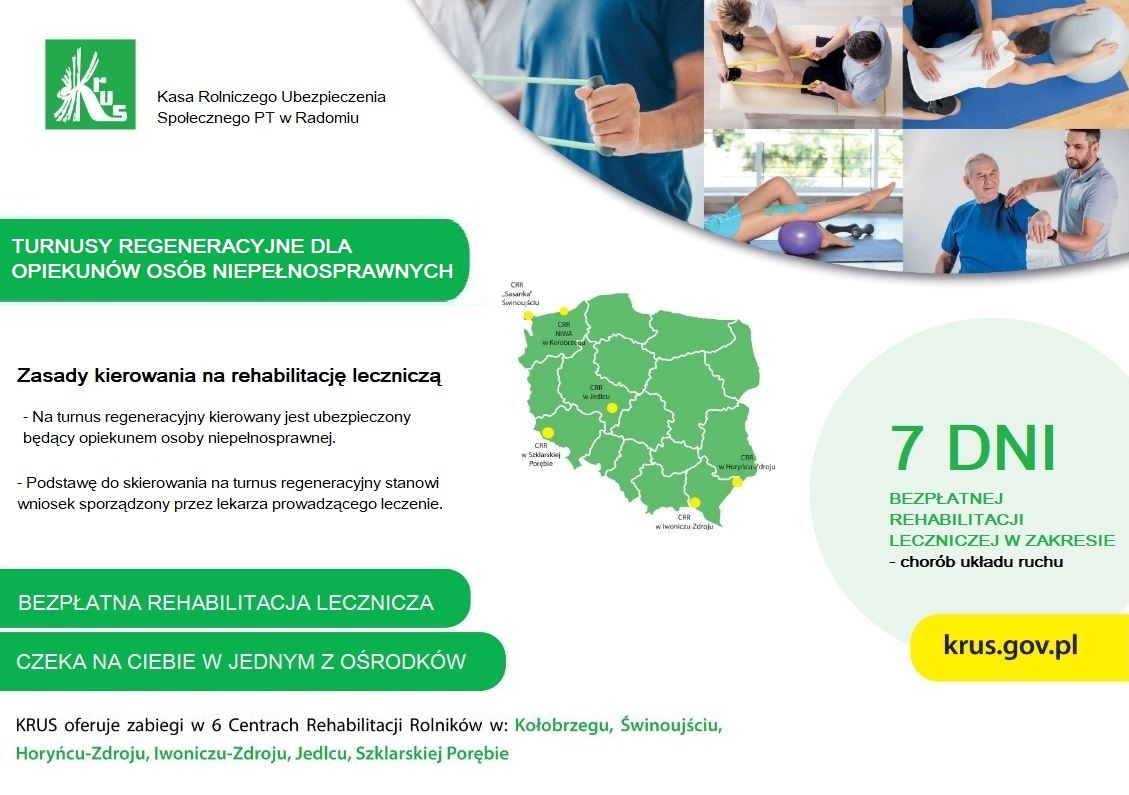 Kasa Rolniczego Ubezpieczenia Społecznego Placówka Terenowa w Radomiu informuje, że od 1 stycznia 2023 roku organizowane są turnusy regeneracyjne dla opiekunów osób niepełnosprawnych, w celu poprawy kondycji psychofizycznej i jakości życia. Turnusy są organizowane w 7 dniowym trybie stacjonarnym. Na turnus regeneracyjny pacjent może być kierowany nie częściej niż 12 miesięcy. Pobyt na turnusie regeneracyjnym jest bezpłatny.