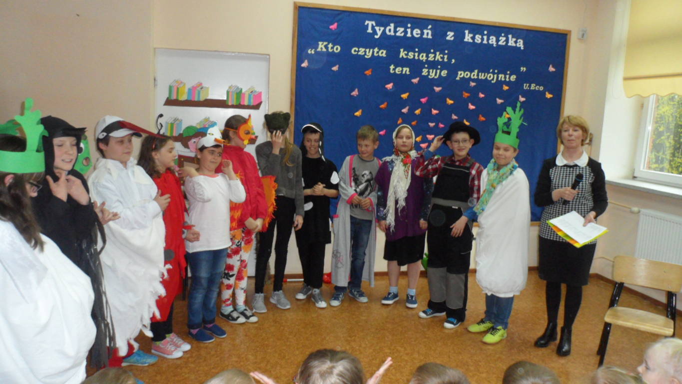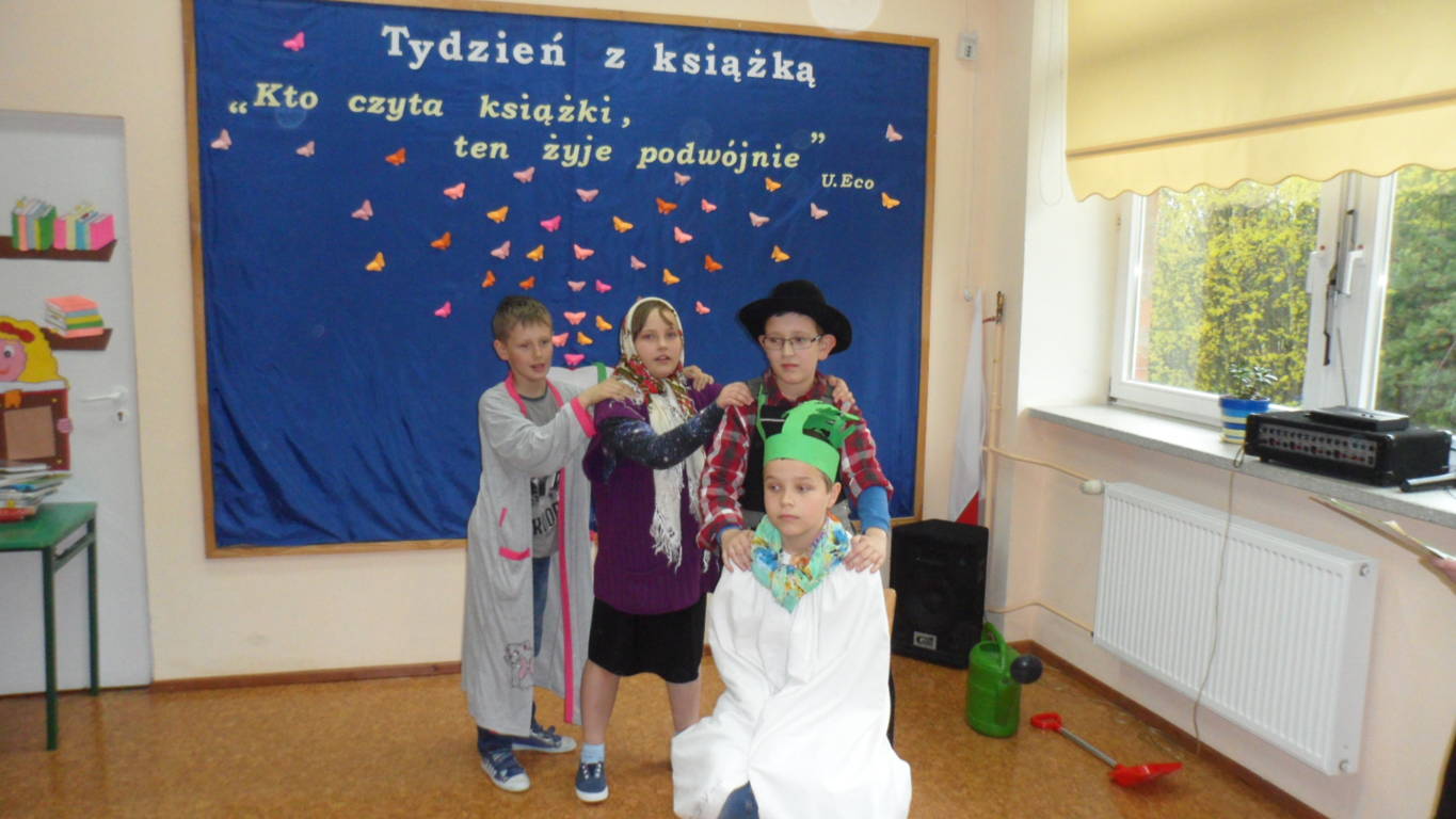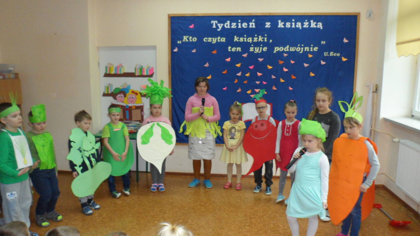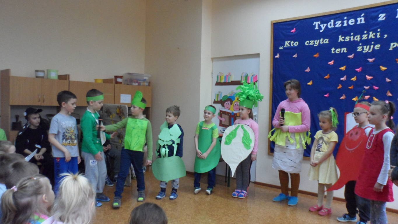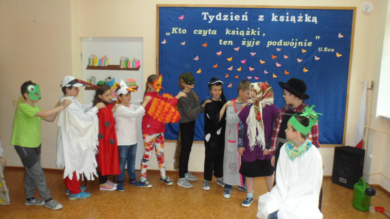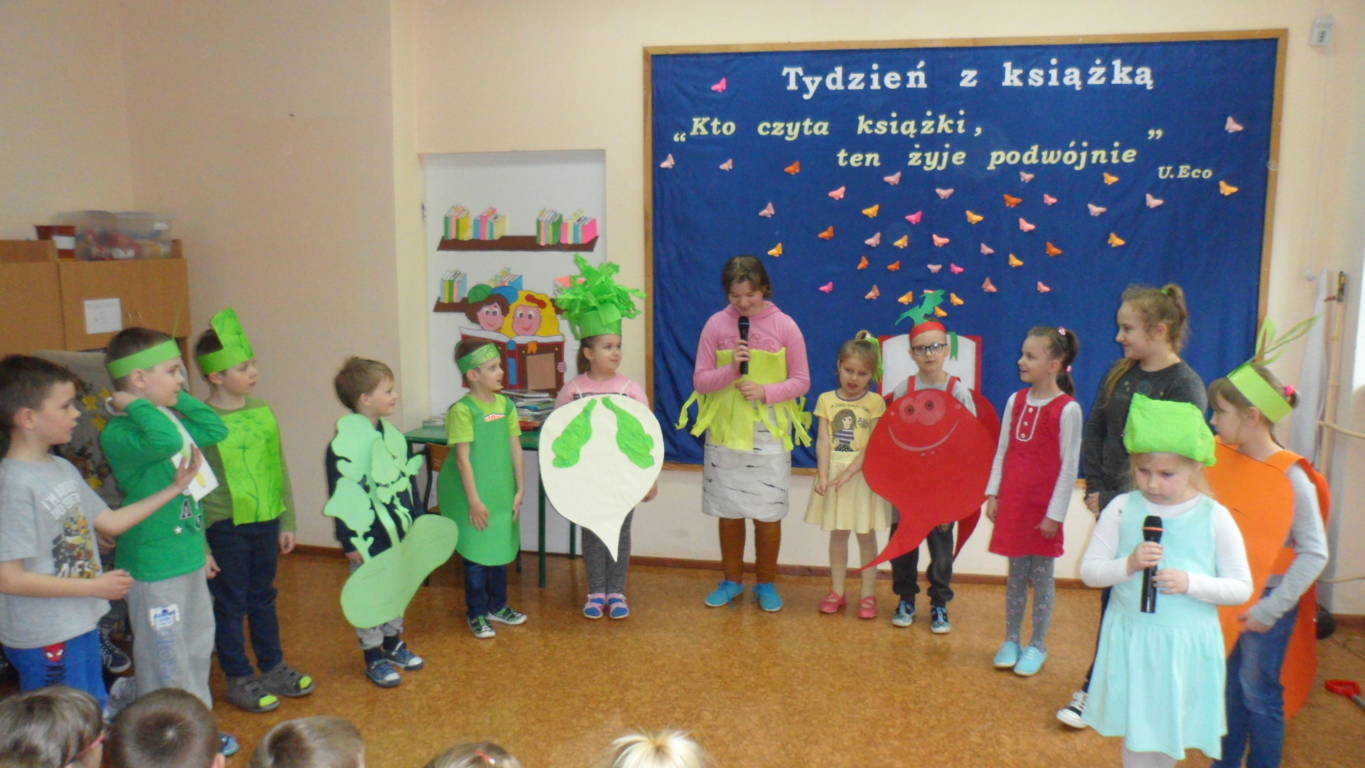 W piątek 28.04.2017r. podsumowano akcję „Tydzień z książką”. Pani Joanna Drabik przedstawiła „Ciekawostki o książce” w interesującej prezentacji multimedialnej. Następnie uczniowie klasy IV i V przygotowani przez p. E. Dzik i p. M. Boros przedstawili inscenizację utworu „Rzepka” J. Tuwima. W/ w przedstawienie bardzo podobało się wszystkim uczestnikom, ponieważ kolorowe stroje i niecodzienna odpowiednia oprawa muzyczna spowodowała, że wszyscy włączyli się w śpiewanie znanych utworów wykorzystanych do inscenizacji wiersza.