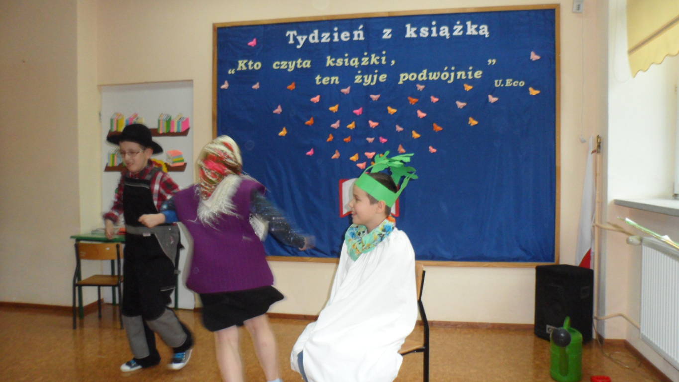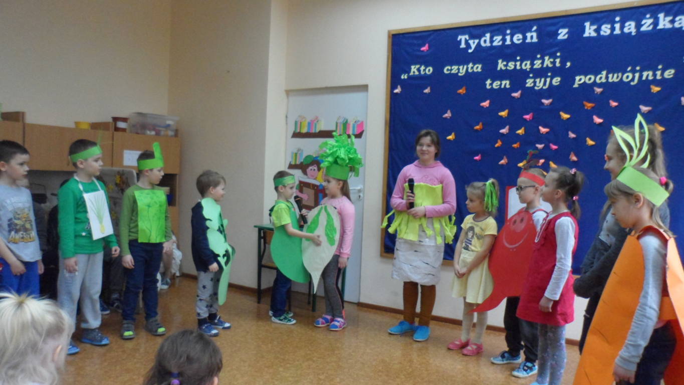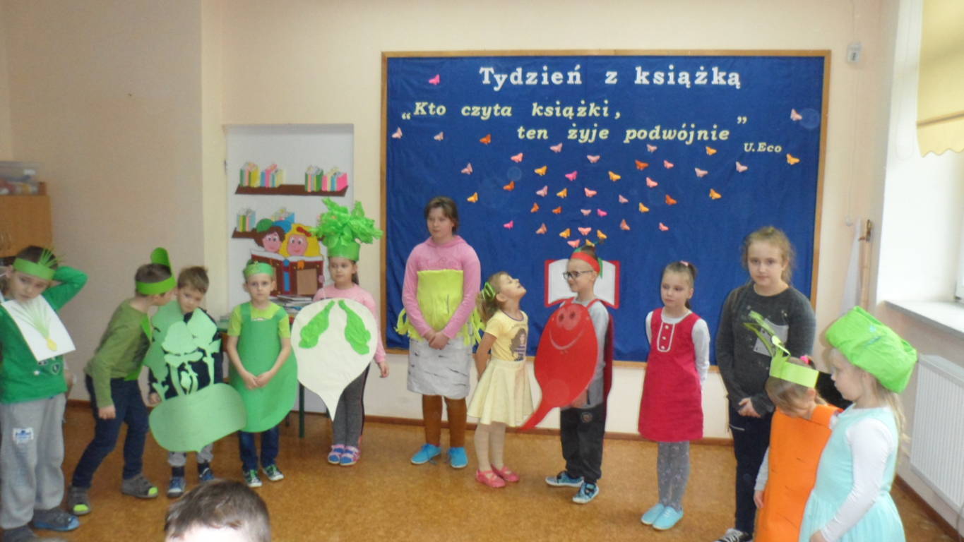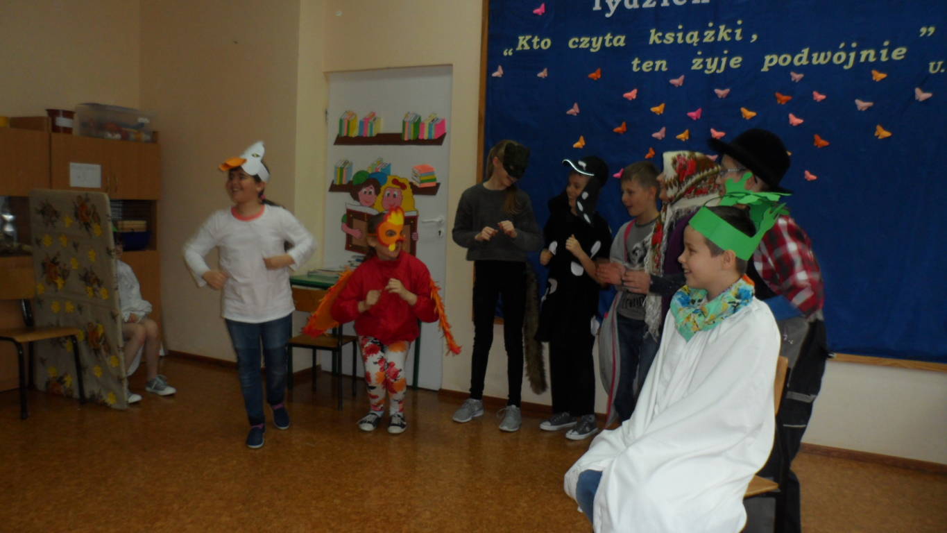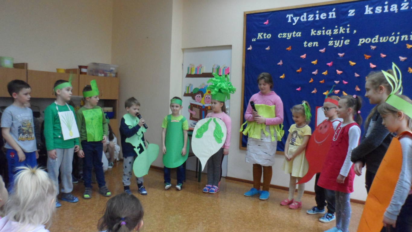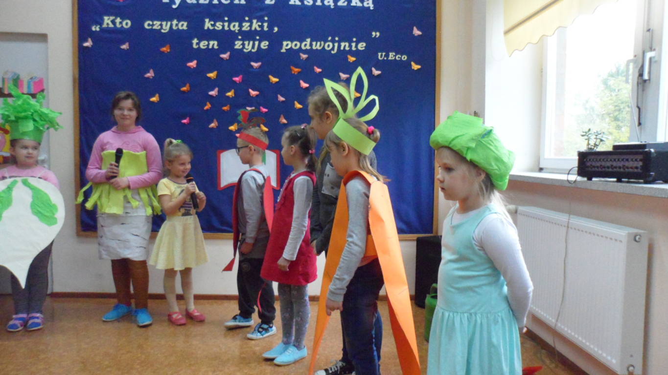 W piątek 28.04.2017r. podsumowano akcję „Tydzień z książką”. Pani Joanna Drabik przedstawiła „Ciekawostki o książce” w interesującej prezentacji multimedialnej. Następnie uczniowie klasy IV i V przygotowani przez p. E. Dzik i p. M. Boros przedstawili inscenizację utworu „Rzepka” J. Tuwima. W/ w przedstawienie bardzo podobało się wszystkim uczestnikom, ponieważ kolorowe stroje i niecodzienna odpowiednia oprawa muzyczna spowodowała, że wszyscy włączyli się w śpiewanie znanych utworów wykorzystanych do inscenizacji wiersza.