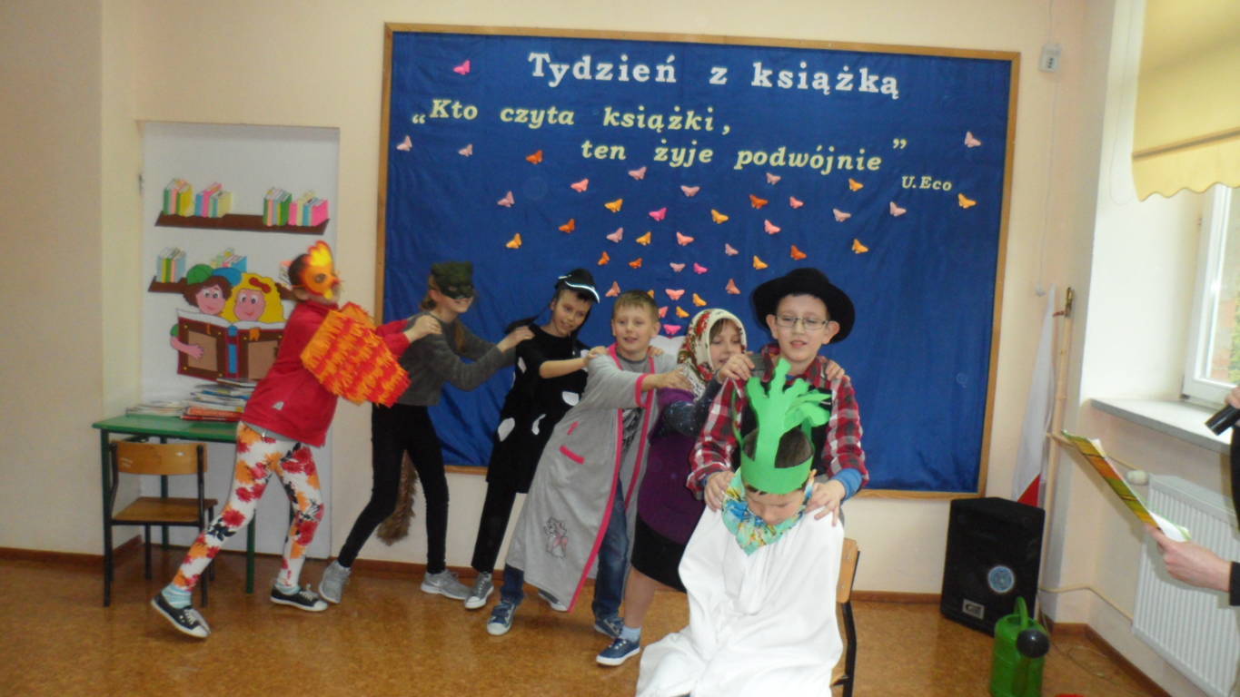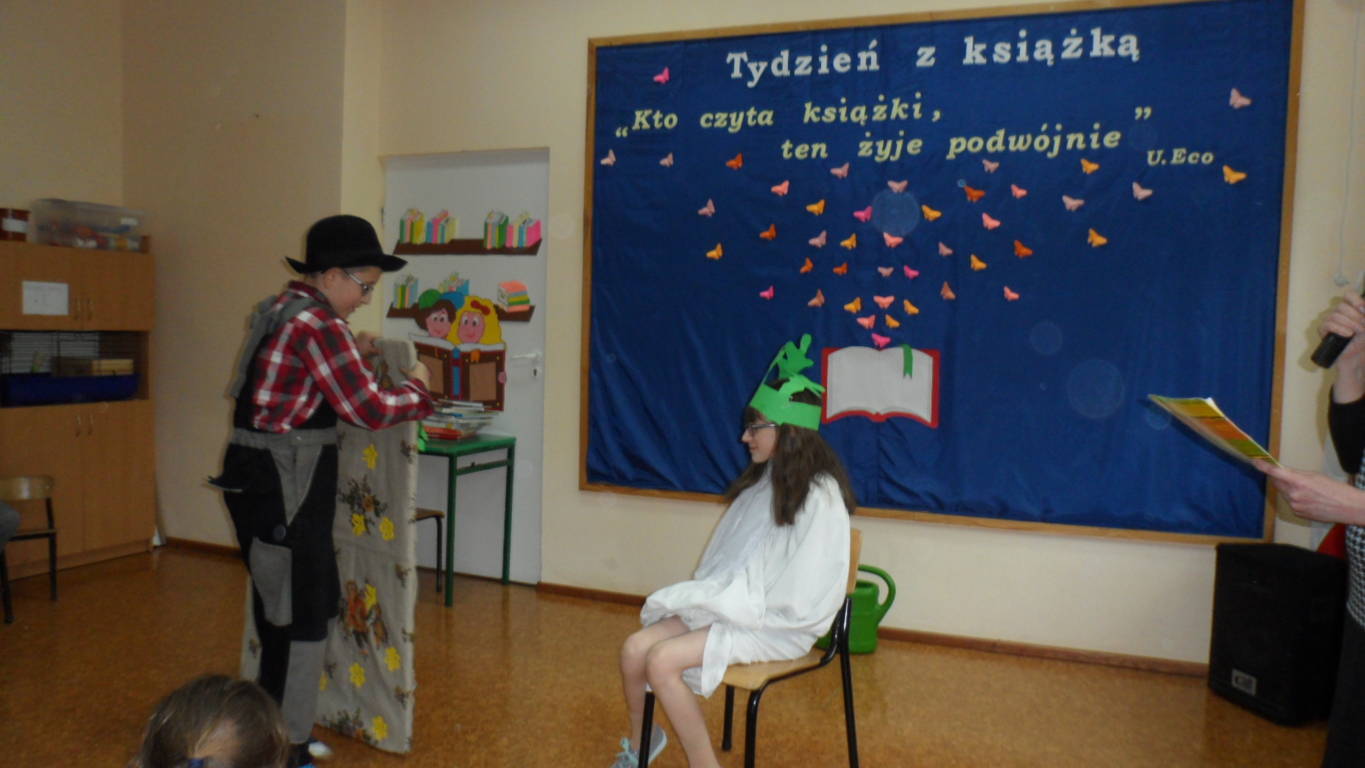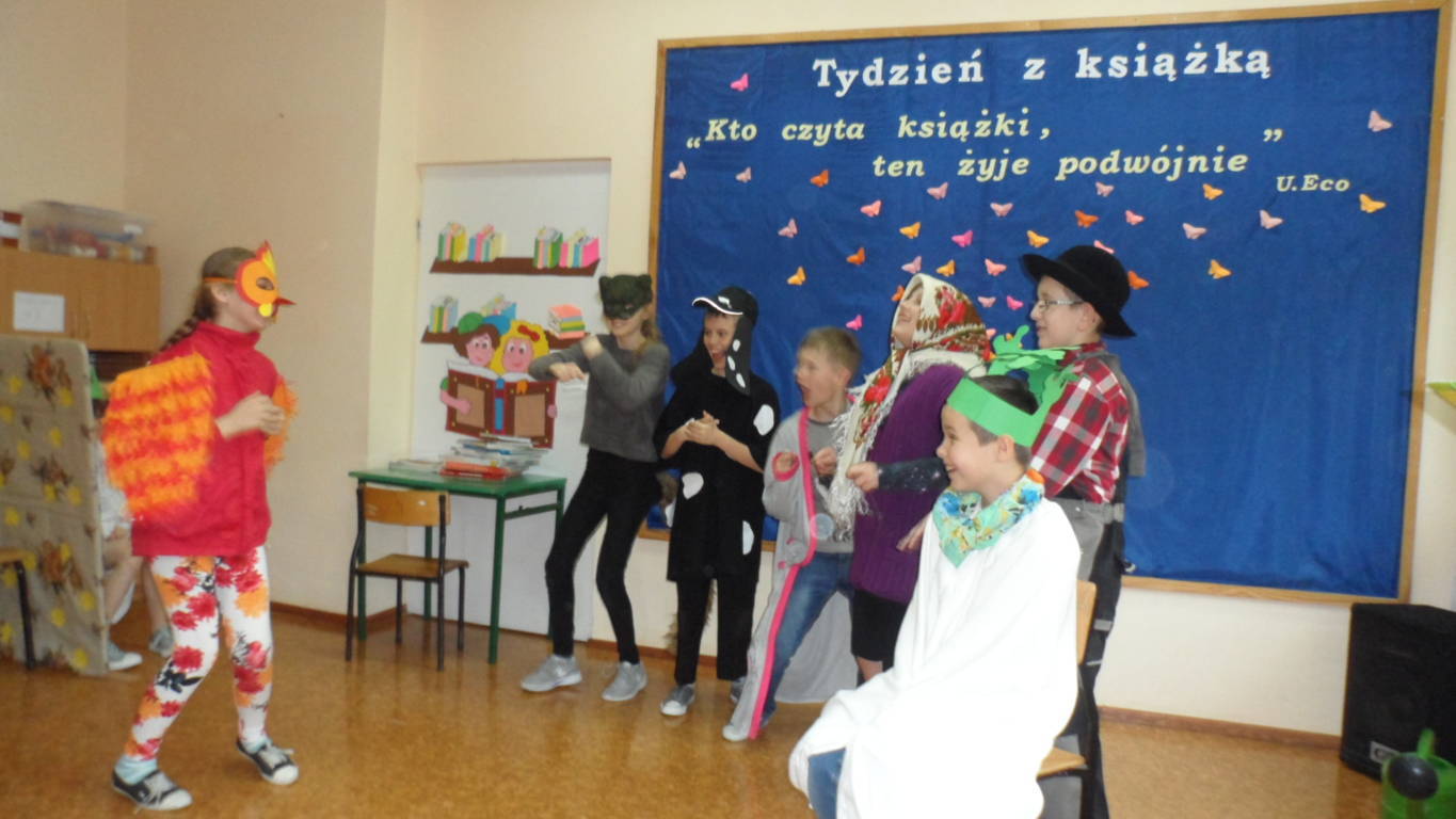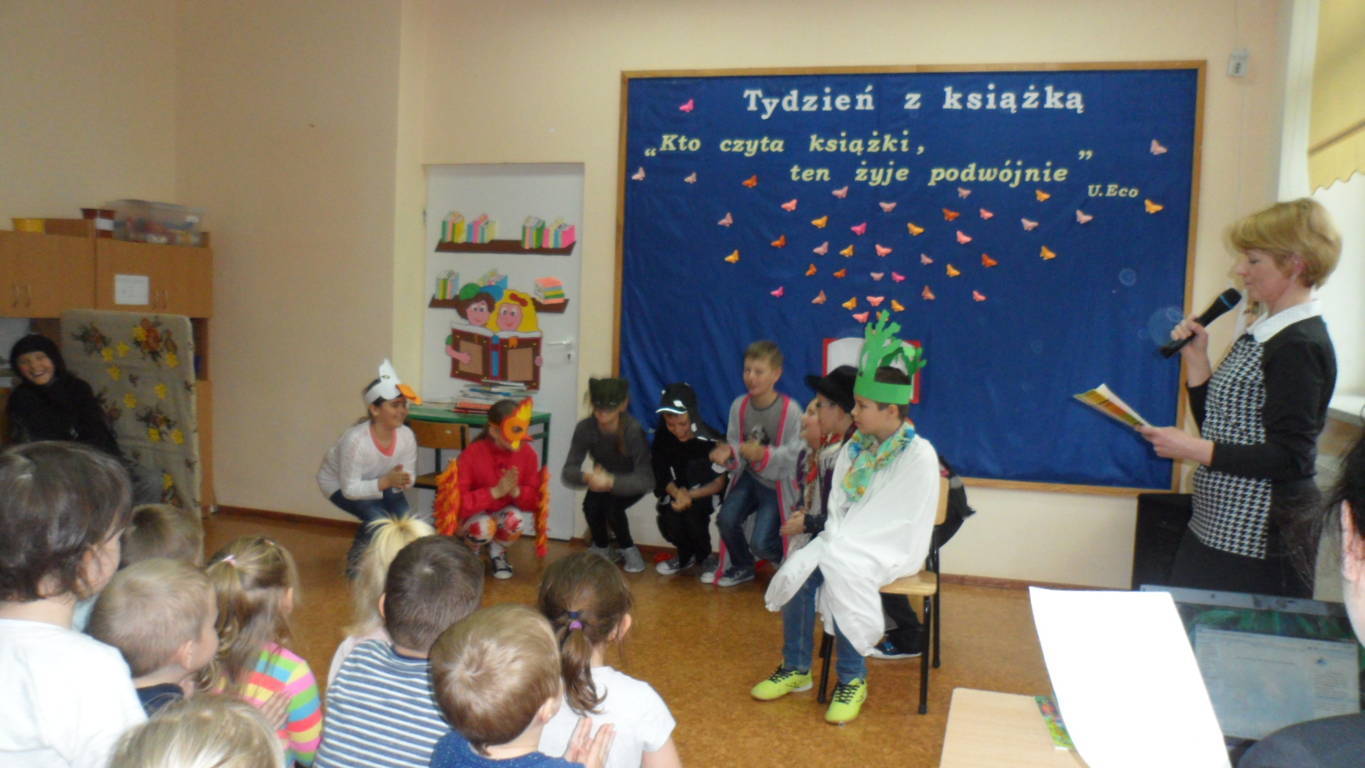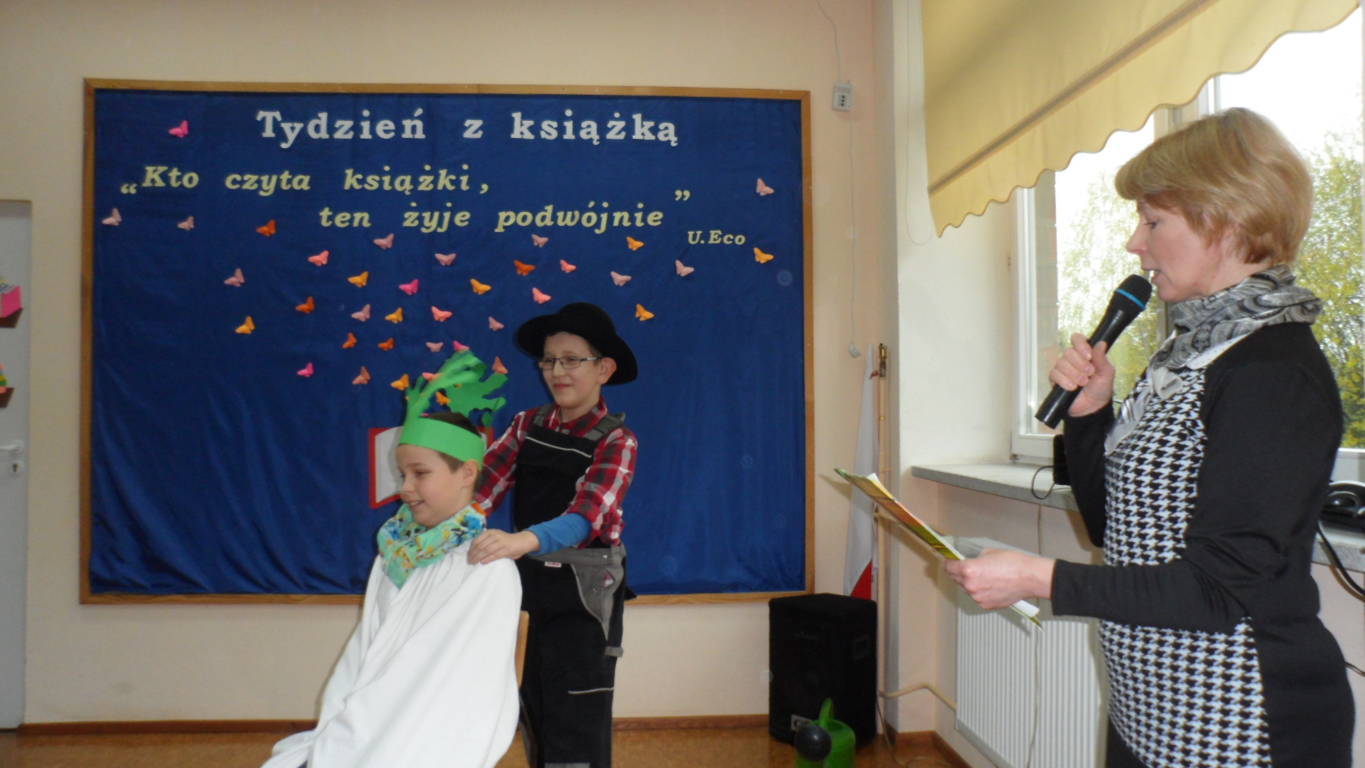 W piątek 28.04.2017r. podsumowano akcję „Tydzień z książką”. Pani Joanna Drabik przedstawiła „Ciekawostki o książce” w interesującej prezentacji multimedialnej. Następnie uczniowie klasy IV i V przygotowani przez p. E. Dzik i p. M. Boros przedstawili inscenizację utworu „Rzepka” J. Tuwima. W/ w przedstawienie bardzo podobało się wszystkim uczestnikom, ponieważ kolorowe stroje i niecodzienna odpowiednia oprawa muzyczna spowodowała, że wszyscy włączyli się w śpiewanie znanych utworów wykorzystanych do inscenizacji wiersza.
