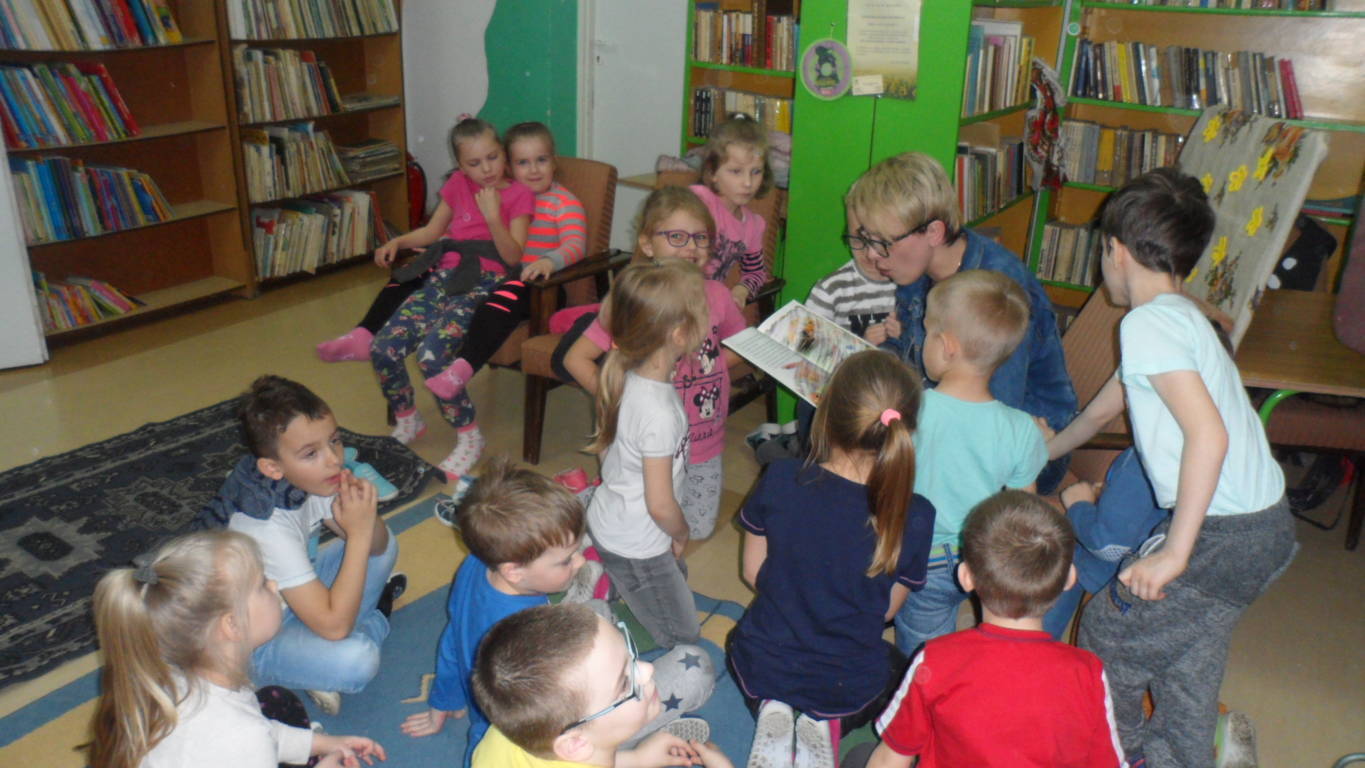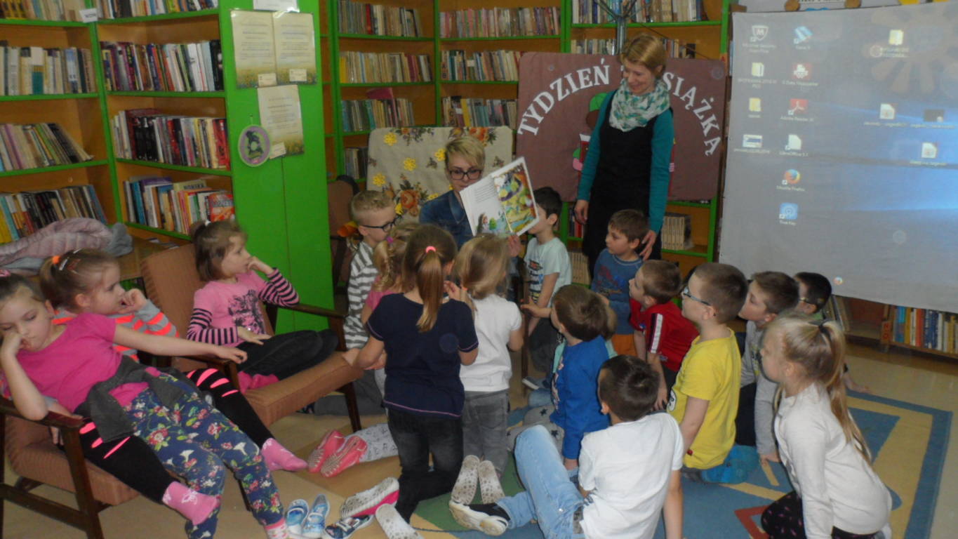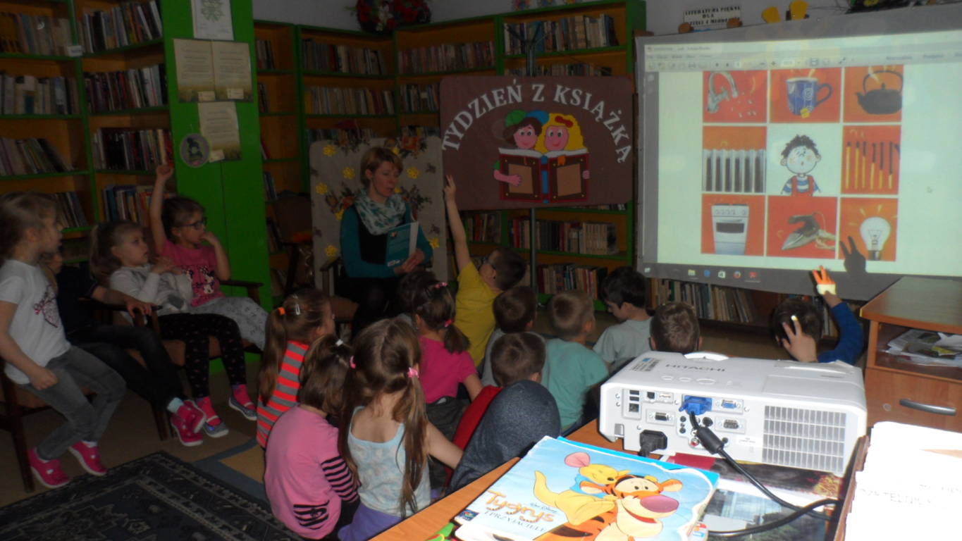 „Tydzień z książką” przeniósł się również do Filii Gminnej Biblioteki Publicznej w Zbijowie, gdzie na najmłodszych czytelników czekał szereg inspirujących atrakcji. W bibliotece pani bibliotekarka Elżbieta Dzik przedstawiła najmłodszym dzieciom multimedialne obrazki do książki G. Kazdepke ,,Ostrożnie”, następnie przeczytała fragmenty ciekawych, pouczających opowieści z których dzieci mogły dowiedzieć się: w jakich sytuacjach należy zachować ostrożność i jak przewidzieć i unikać sytuacji niebezpiecznych. Na spotkanie przybyła również pani Malwina Boros (zaproszony rodzic), przeczytała najmłodszym dzieciom bajkę pt,,Czarnoksiężnik z krainy Oz” . Fascynująca bajka rozpaliła dziecięcą wyobraźnię. Opowiedziała o podróży przyjaciół, celem spełnienie największych marzeń, o wierze w siebie, o tym, że wszystko zależy przede wszystkim od nas (nie, wcale nie od Czarnoksiężnika).Ciekawa oprawa multimedialna nie pozwoliła na nudę, a dobór atrakcyjnych pozycji książkowych zaszczepił w młodych odbiorcach zamiłowanie do literatury.