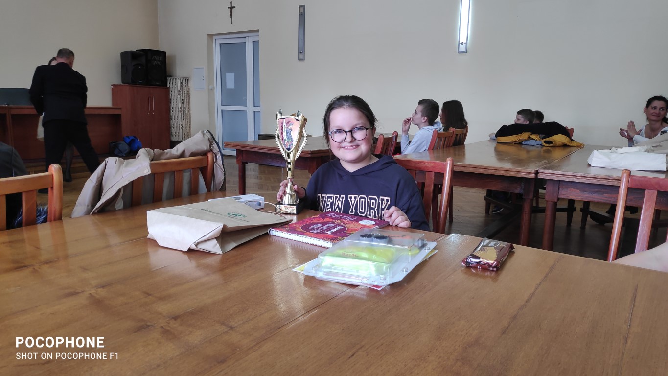 z 40 pytań zamkniętych i otwartych. Z opinii uczestników turnieju wynika, że był bardzo trudny. Jesteśmy bardzo dumni z naszych uczniów, a szczególnie z wyniku Nikoli Parszewskiej – uczennicy PSP w Bieszkowie Dolnym za zajęcie III miejsca w pierwszej grupie wiekowej (uczniowie szkół podstawowych klasy I-VI). Nikola wygrała zegarek smartwatch, piłkę, otrzymała dyplom, statuetkę, książki i odblaski. Pozostali uczniowie również otrzymali dyplomy, statuetki, piłki i drobne upominki.