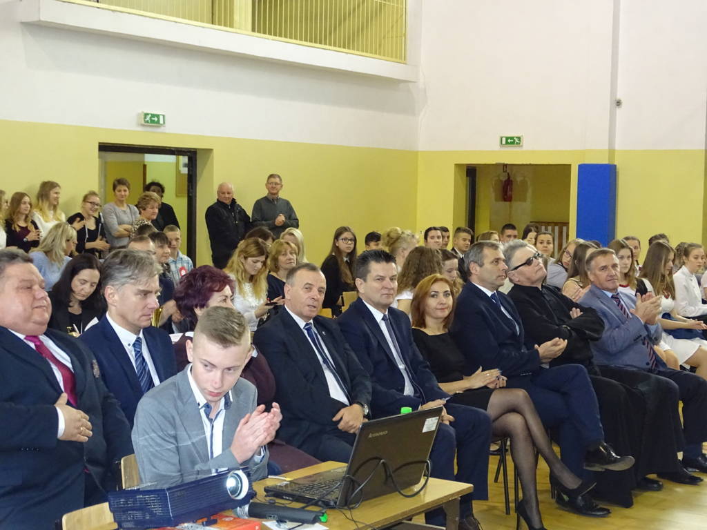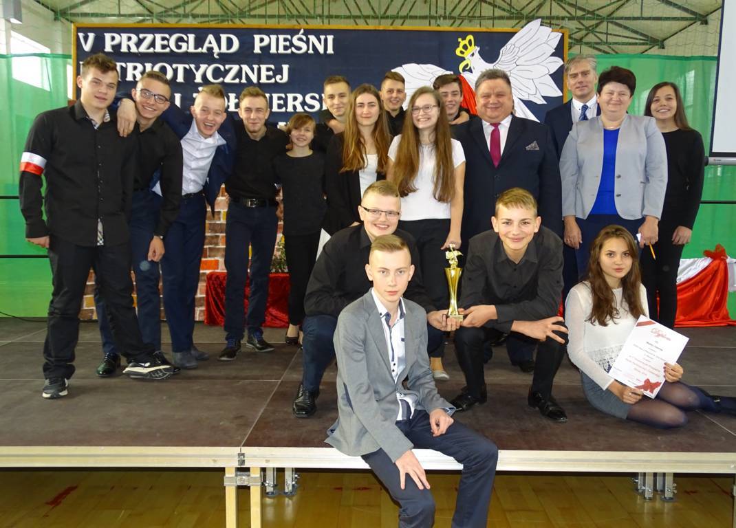 Powitała wszystkich obecnych oraz przybyłych gości, a mianowicie: reprezentującego Kierownika Delegatury Mazowieckiego Urzędu Wojewódzkiego w Radomiu pana Pawła Sagana, Starostę Powiatu Szydłowieckiego pana Włodzimierza Górlickiego, Przewodniczącą Rady Powiatu panią Anitę Gołosz, reprezentującą Burmistrza Szydłowca panią Jadwigę Kopycką, Wójta Gminy Jastrząb pana Andrzeja Brachę, Wójta Gminy Orońsko pana Henryka Noskowskiego, Wójta Gminy Mirów pana Artura Siwiorka, Radnych Gminy Mirów na czele z Przewodniczącym Rady Gminy w Mirowie panem Piotrem Gołoszem, Sekretarza Gminy Mirów pana Jarosława Basiaka, Kierownika Referatu Oświaty pana Piotra Kowalika, dyrektorów gimnazjów i dyrektorów szkół podstawowych oraz rodziców, nauczycieli i uczniów. Starosta Powiatu Szydłowieckiego pan Włodzimierz Górlicki w sposób bardzo ciepły i serdeczny zwrócił się do młodzieży, dziękując im za ich zaangażowanie i udział w obchodach Święta Niepodległości. Po wspólnym zaśpiewaniu pieśni „My pierwsza brygada” rozpoczęły się występy uczniów. Prezentowali się w dwóch kategoriach: zespół i soliści. Jury przeglądu w składzie: p. A. Bilska, p. P. Olszewska, p. J. Orczykowska i p. J. Ulewiński wyróżniło dwa zespoły z PG nr 2 z Szydłowca i PG w Mirowie. Wykonywali zarówno te zapomniane, jak i zupełnie nowe, we własnych aranżacjach pieśni i piosenki patriotyczne. Poziom wykonań gimnazjalistów był bardzo wysoki. Za własną pracę i pracę ich opiekunów otrzymali gromkie brawa i liczne pochwały. Przegląd poprowadziła pani Krystyna Książek. Na zakończenie przeglądu pan wójt A. Siwiorek i p. P. Sagan wręczyli nagrody i pamiątkowe dyplomy. Mamy nadzieję, że spotkamy się za rok.