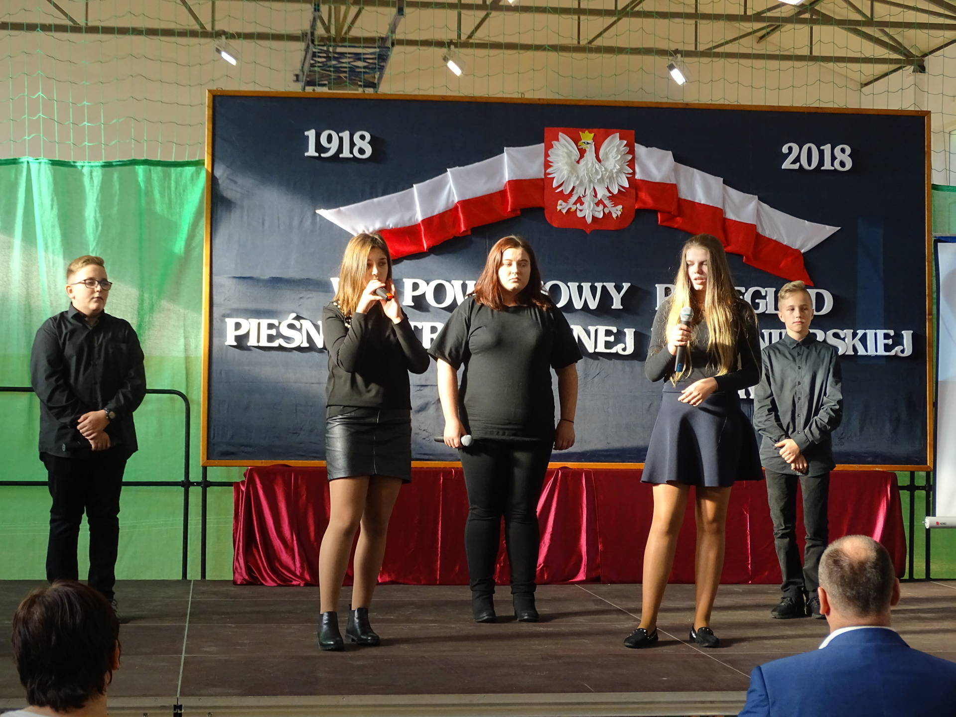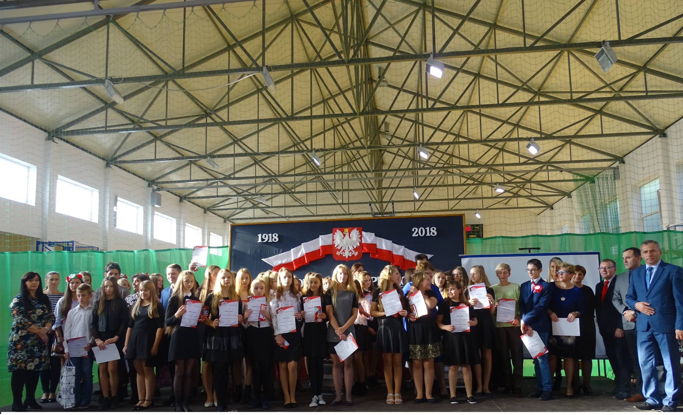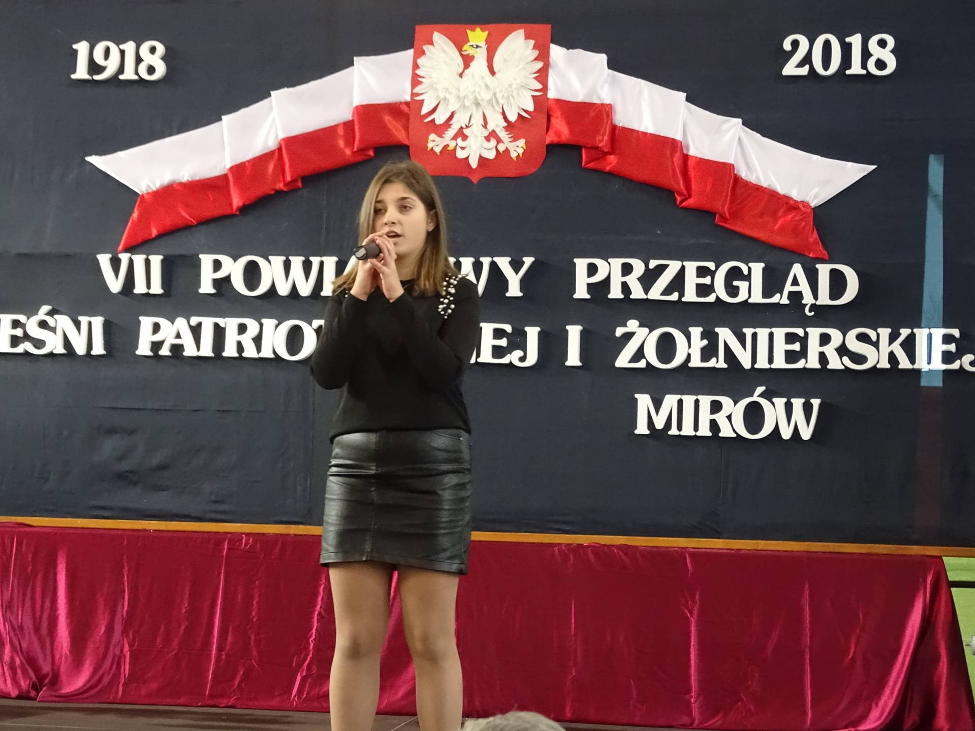 Wicestarosta Powiatu Szydłowieckiego pan Adam Włoskiewicz, Wójt Gminy Jastrząb pan Andrzej Bracha, Wójt Gminy Mirów pan Artur Siwiorek, Kierownik Gminnego Ośrodka Pomocy Społecznej w Mirowie pani Alicja Wójcik , Kierownik Referatu Oświaty, Sportu, Kultury, Zdrowia i Funduszy Strukturalnych pan Piotr Kowalik, Przewodniczący Komisji Oświaty pan Jarosław Gromek, dyrektorzy szkół podstawowych z powiatu szydłowieckiego, Dyrektor Gminnej Biblioteki Publicznej w Mirowie pani Beata Seweryn, Proboszcz parafii Mirów ks. Grzegorz Stępień. Tegoroczny przegląd odbywał się w 100 rocznicę odzyskania przez Polskę niepodległości. Rozpoczęła go tańcem z szarfami w barwach narodowych grupa dziewcząt z kl. IV – V. Następnie prowadząca przegląd pani Krystyna Książek złożyła życzenia z okazji Święta Niepodległości i zaprosiła do występów solistów i zespoły. Na scenie wystąpili uczniowie z Publicznej Szkoły Podstawowej w: Bieszkowie Dolnym, Cukrówce, Jastrzębiu, Majdowie, Mirowie, Orońsku, nr 1 w Szydłowcu, Wałsnowie, Woli Lipienieckiej Dużej, Wysokiej, Zbijowie Małym oraz z Centrum Kształcenia Zawodowego i Ustawicznego w Szydłowcu i Publicznego Gimnazjum w Chlewiskach. Młodzież wykonywała te zapomniane, jak i zupełnie nowe, pieśni i piosenki patriotyczne i żołnierskie. Jury w składzie: pani Sława Hanusz, pani Joanna Orczykowska, pani Małgorzata Jasińska pochwaliło młodych artystów za ich śpiew, akompaniament, choreografię i zaangażowanie. Wyróżnieni przez jury i publiczność soliści: Natalia Dygas z PSP w Mirowie, Eryk Tarka z PSP w Cukrówce, Julia Kacprowicz z PSP w Wałsnowie i zespoły: zespół z PSP w Jastrzębiu, zespół z PSP w Mirowie, zespół z PSP nr 1 w Szydłowcu, zespół z PSP w Wysokiej zostali nagrodzeni, a każdy uczestnik otrzymał dyplom, pamiątkowy długopis i czekoladę. Z okazji 100 lecia niepodległości wszyscy śpiewali pieśni patriotyczne i żołnierskie. Przegląd Pieśni Patriotycznej i Żołnierskiej przygotowały panie: Krystyna Książek, Marta Piętek i Joanna Orczykowska.