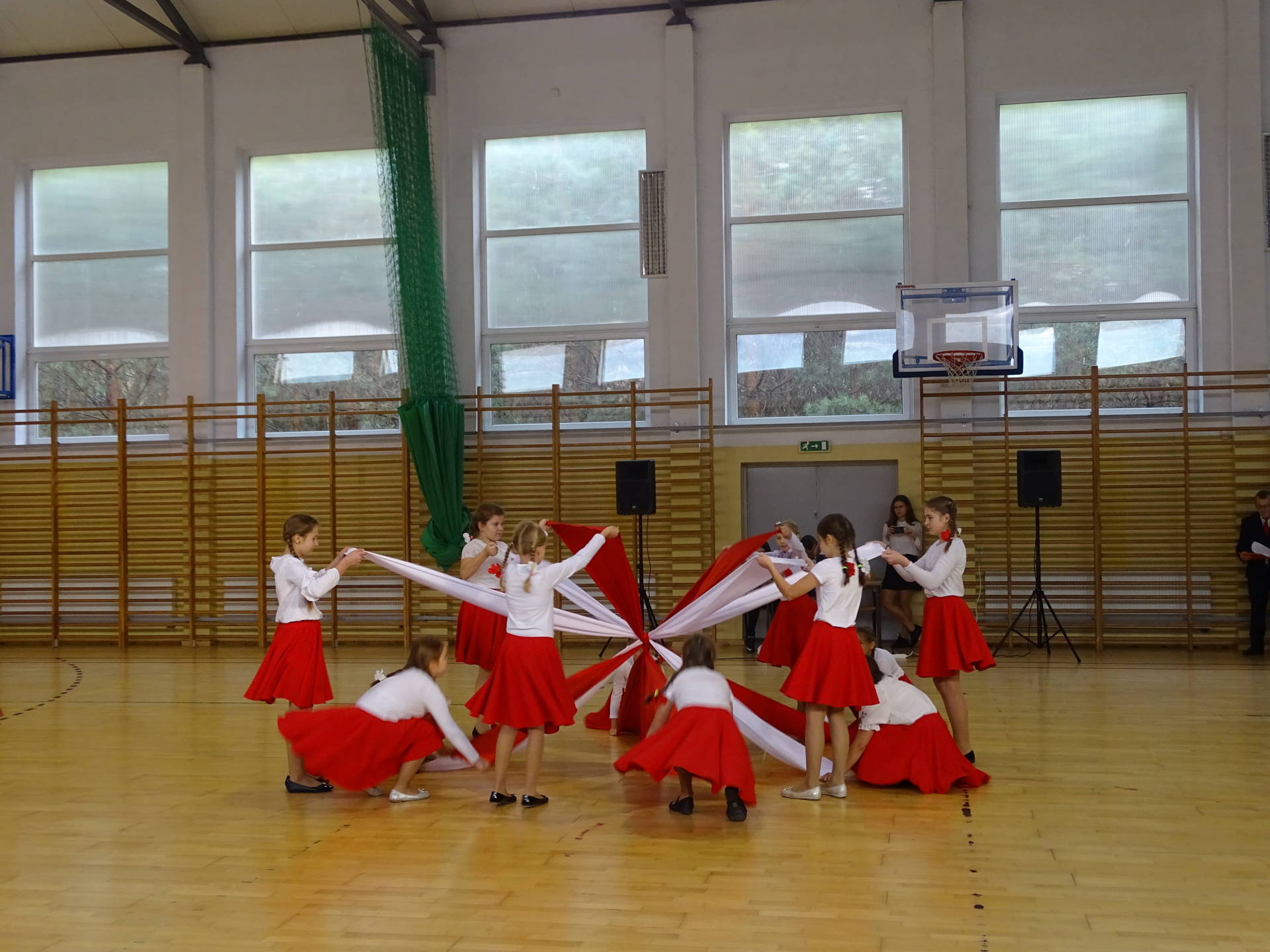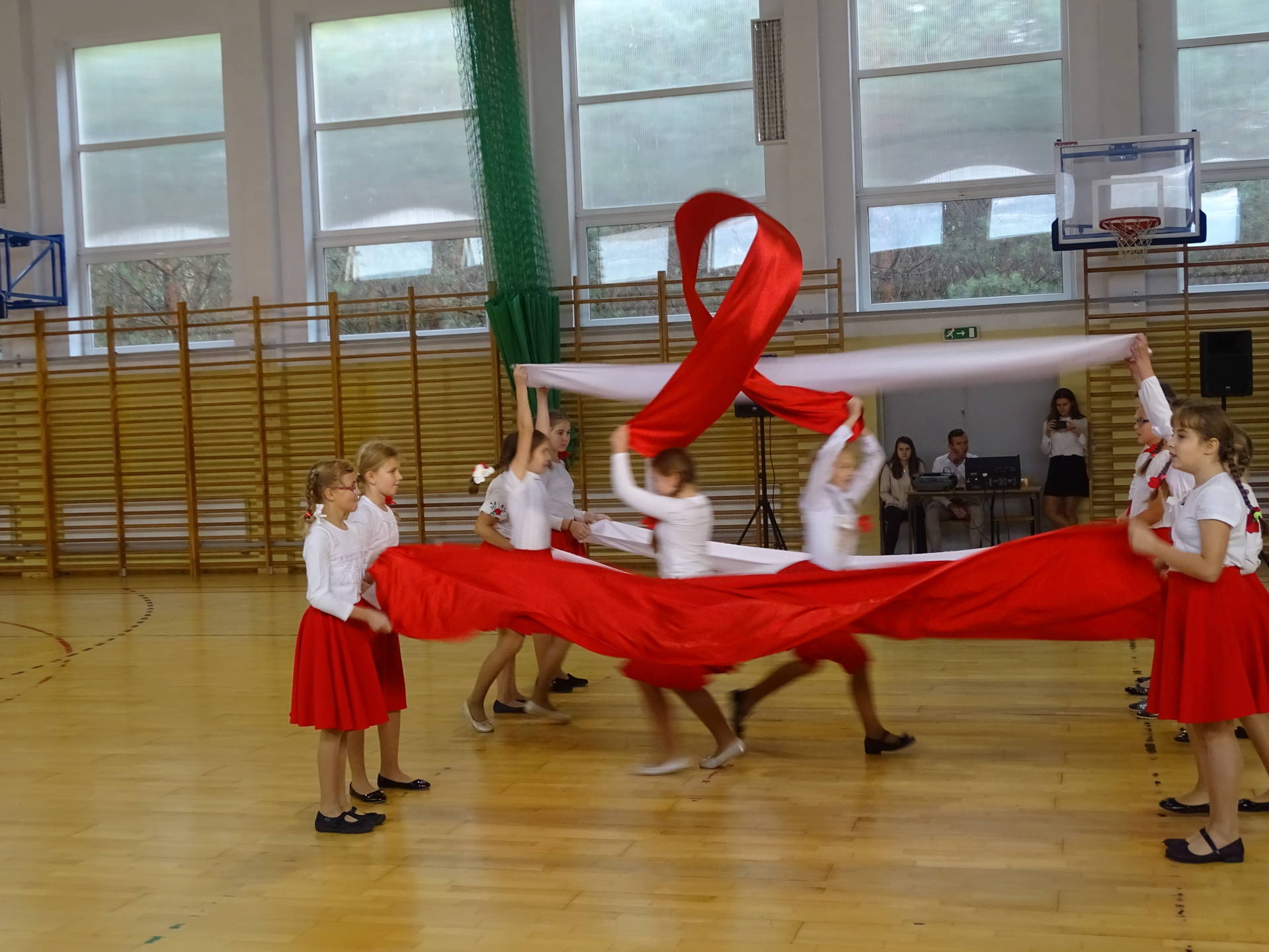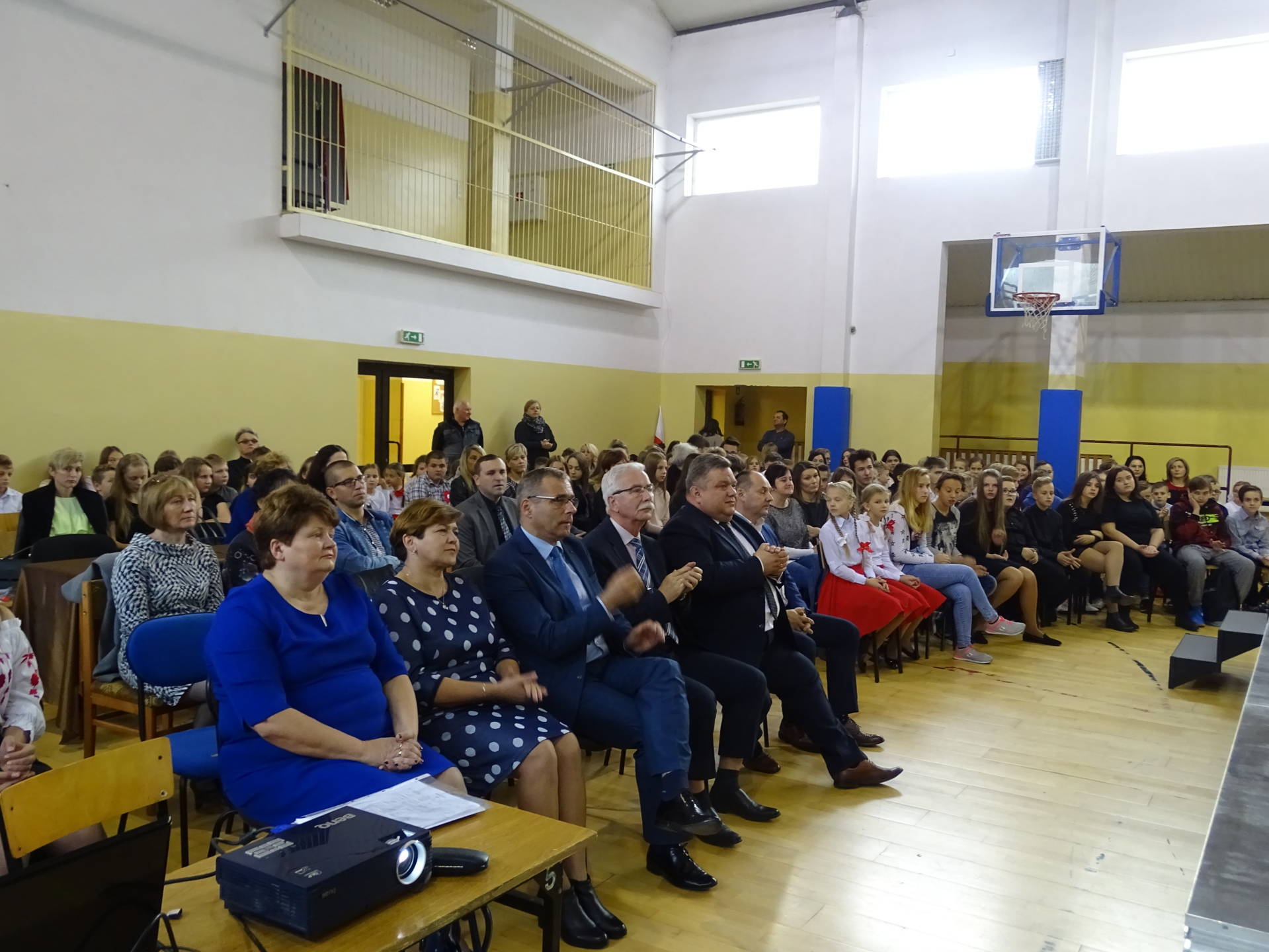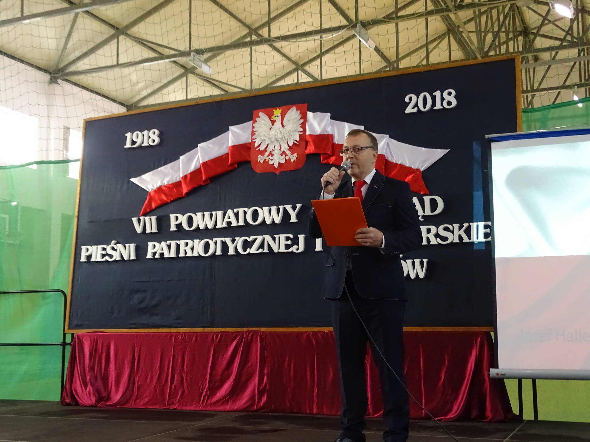 Wicestarosta Powiatu Szydłowieckiego pan Adam Włoskiewicz, Wójt Gminy Jastrząb pan Andrzej Bracha, Wójt Gminy Mirów pan Artur Siwiorek, Kierownik Gminnego Ośrodka Pomocy Społecznej w Mirowie pani Alicja Wójcik , Kierownik Referatu Oświaty, Sportu, Kultury, Zdrowia i Funduszy Strukturalnych pan Piotr Kowalik, Przewodniczący Komisji Oświaty pan Jarosław Gromek, dyrektorzy szkół podstawowych z powiatu szydłowieckiego, Dyrektor Gminnej Biblioteki Publicznej w Mirowie pani Beata Seweryn, Proboszcz parafii Mirów ks. Grzegorz Stępień. Tegoroczny przegląd odbywał się w 100 rocznicę odzyskania przez Polskę niepodległości. Rozpoczęła go tańcem z szarfami w barwach narodowych grupa dziewcząt z kl. IV – V. Następnie prowadząca przegląd pani Krystyna Książek złożyła życzenia z okazji Święta Niepodległości i zaprosiła do występów solistów i zespoły. Na scenie wystąpili uczniowie z Publicznej Szkoły Podstawowej w: Bieszkowie Dolnym, Cukrówce, Jastrzębiu, Majdowie, Mirowie, Orońsku, nr 1 w Szydłowcu, Wałsnowie, Woli Lipienieckiej Dużej, Wysokiej, Zbijowie Małym oraz z Centrum Kształcenia Zawodowego i Ustawicznego w Szydłowcu i Publicznego Gimnazjum w Chlewiskach. Młodzież wykonywała te zapomniane, jak i zupełnie nowe, pieśni i piosenki patriotyczne i żołnierskie. Jury w składzie: pani Sława Hanusz, pani Joanna Orczykowska, pani Małgorzata Jasińska pochwaliło młodych artystów za ich śpiew, akompaniament, choreografię i zaangażowanie. Wyróżnieni przez jury i publiczność soliści: Natalia Dygas z PSP w Mirowie, Eryk Tarka z PSP w Cukrówce, Julia Kacprowicz z PSP w Wałsnowie i zespoły: zespół z PSP w Jastrzębiu, zespół z PSP w Mirowie, zespół z PSP nr 1 w Szydłowcu, zespół z PSP w Wysokiej zostali nagrodzeni, a każdy uczestnik otrzymał dyplom, pamiątkowy długopis i czekoladę. Z okazji 100 lecia niepodległości wszyscy śpiewali pieśni patriotyczne i żołnierskie. Przegląd Pieśni Patriotycznej i Żołnierskiej przygotowały panie: Krystyna Książek, Marta Piętek i Joanna Orczykowska.
