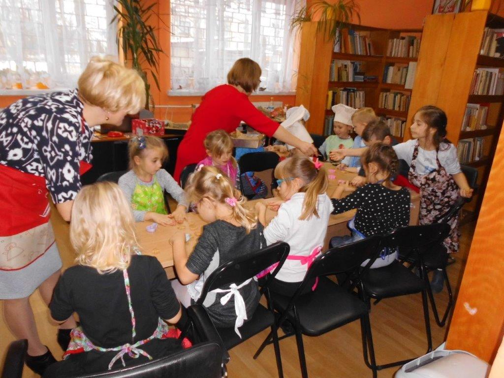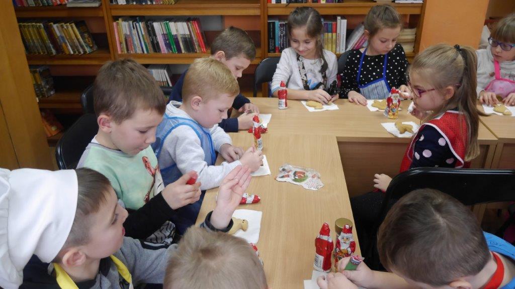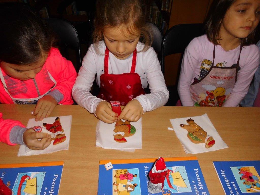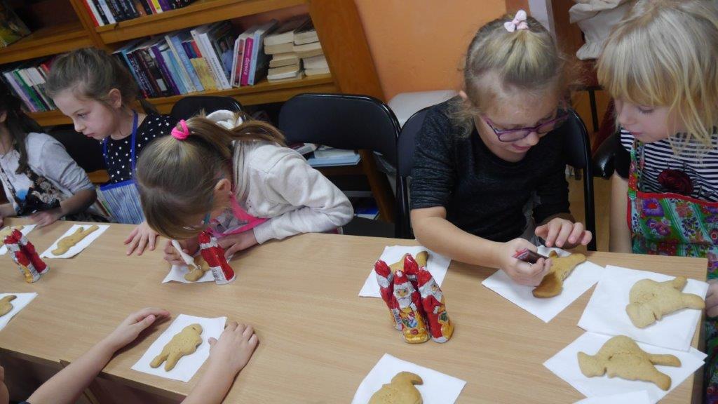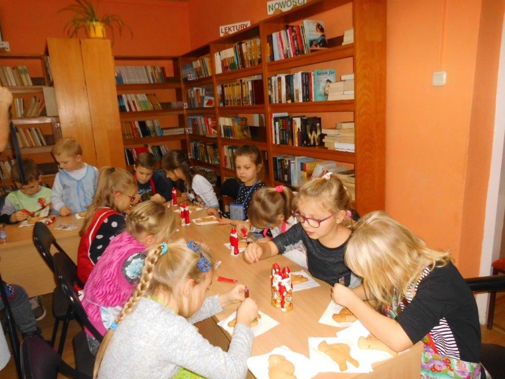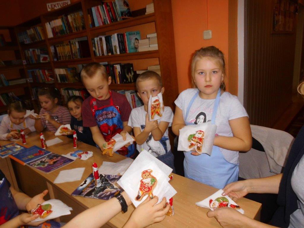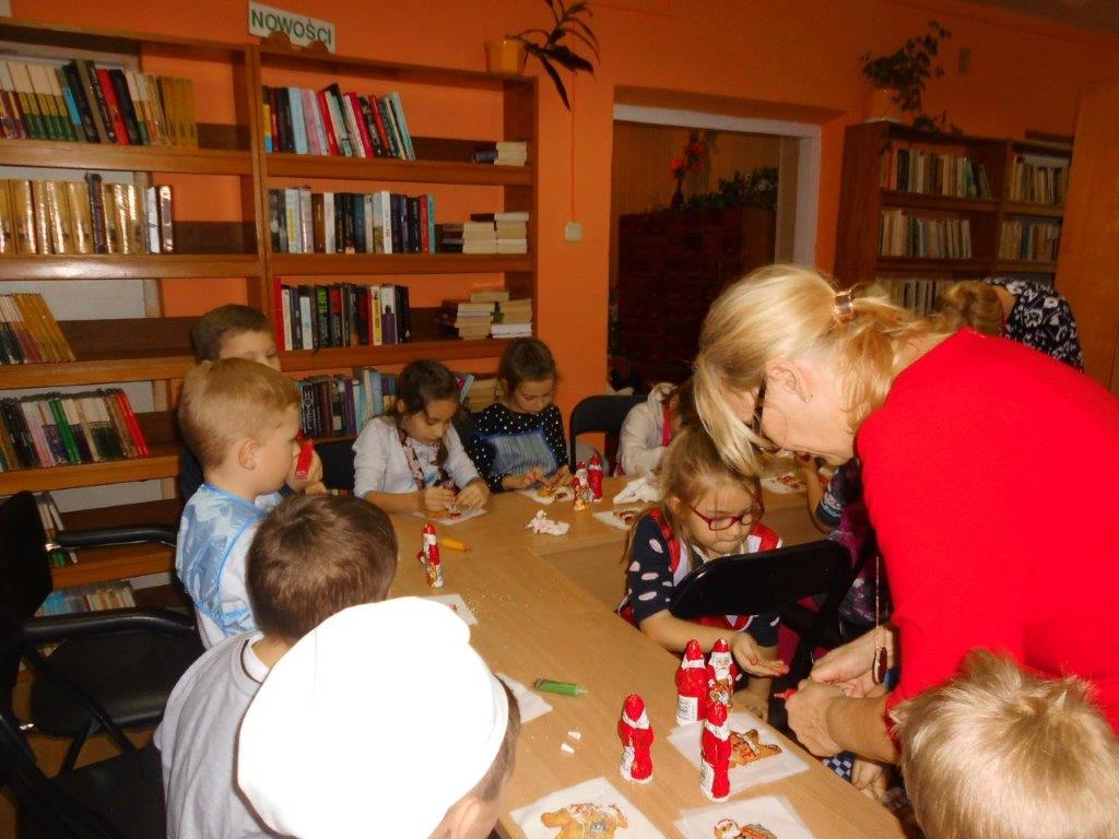 Podczas przygotowywania pierniczków bibliotekarki rozmawiały z dziećmi o tradycji św. Mikołaja, opowiedziały historię pochodzenia pierników, a także legendy z nimi związane. W czasie, gdy pierniczki wypiekały się w piekarniku, dzieciaki brały udział w quizach o świętym Mikołaju. Za prawidłowe odpowiedzi, otrzymywały słodkości i książeczki. W trakcie pieczenia unosił się aromatyczny zapach, a wszystkim udzielił się radosny nastrój związany ze św. Mikołajem. Spotkanie zakończyło się degustacją pierniczków, a każdy z uczestników mógł zabrać do domu, piernikowego pięknie ozdobionego Mikołaja.
