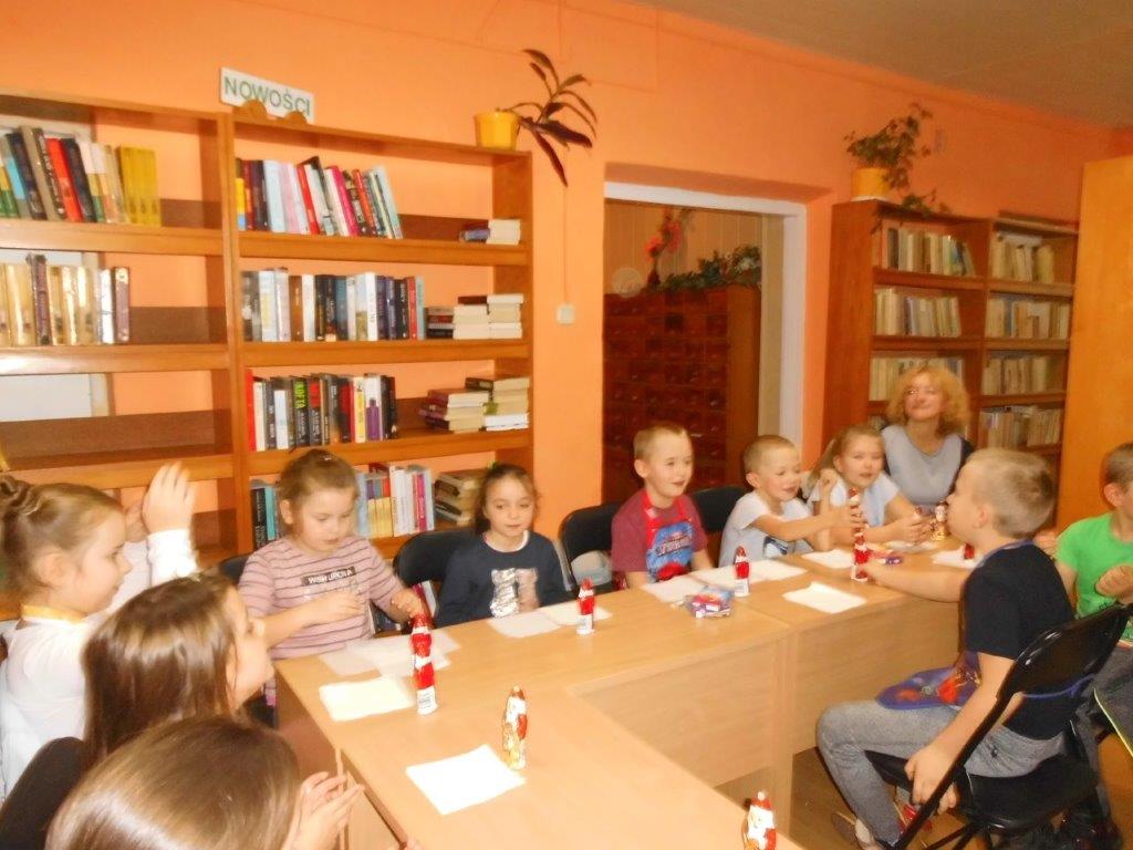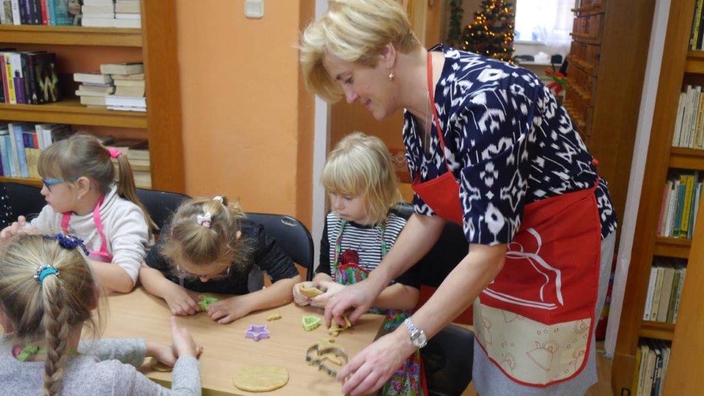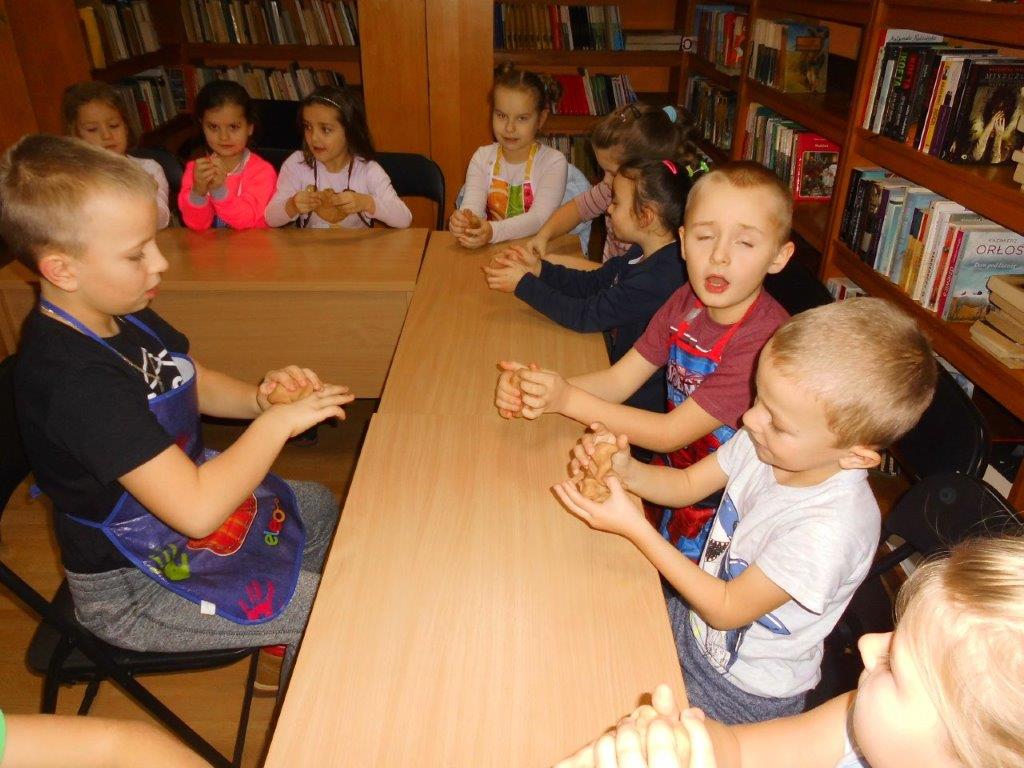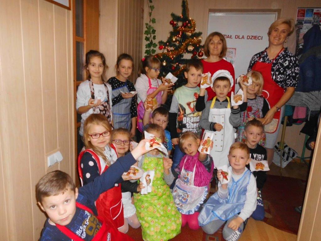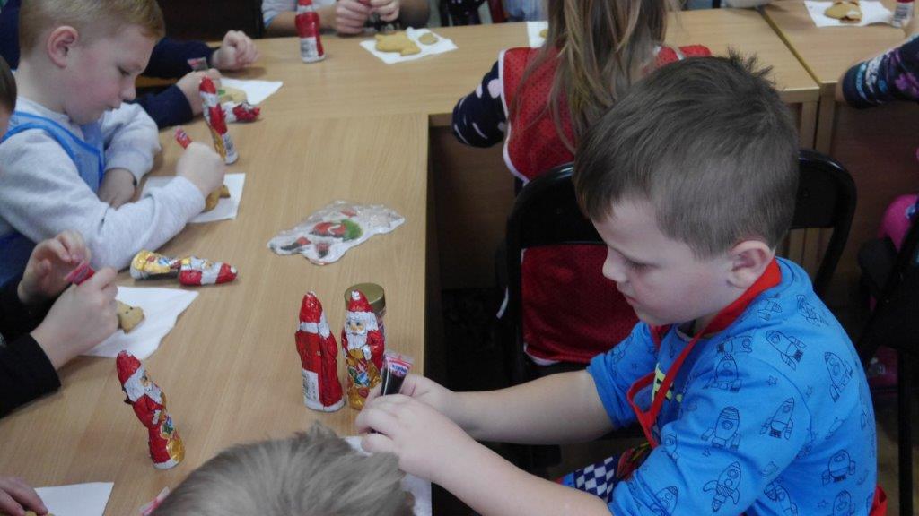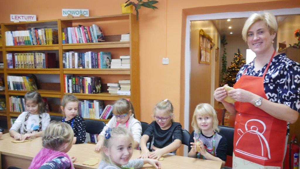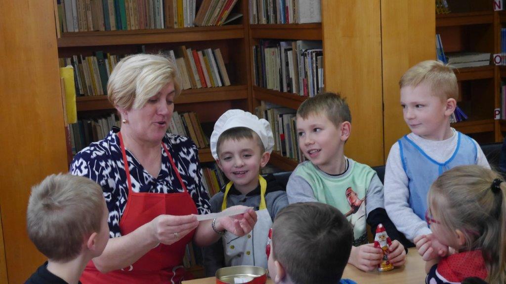 Podczas przygotowywania pierniczków bibliotekarki rozmawiały z dziećmi o tradycji św. Mikołaja, opowiedziały historię pochodzenia pierników, a także legendy z nimi związane. W czasie, gdy pierniczki wypiekały się w piekarniku, dzieciaki brały udział w quizach o świętym Mikołaju. Za prawidłowe odpowiedzi, otrzymywały słodkości i książeczki. W trakcie pieczenia unosił się aromatyczny zapach, a wszystkim udzielił się radosny nastrój związany ze św. Mikołajem. Spotkanie zakończyło się degustacją pierniczków, a każdy z uczestników mógł zabrać do domu, piernikowego pięknie ozdobionego Mikołaja.