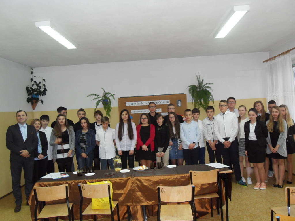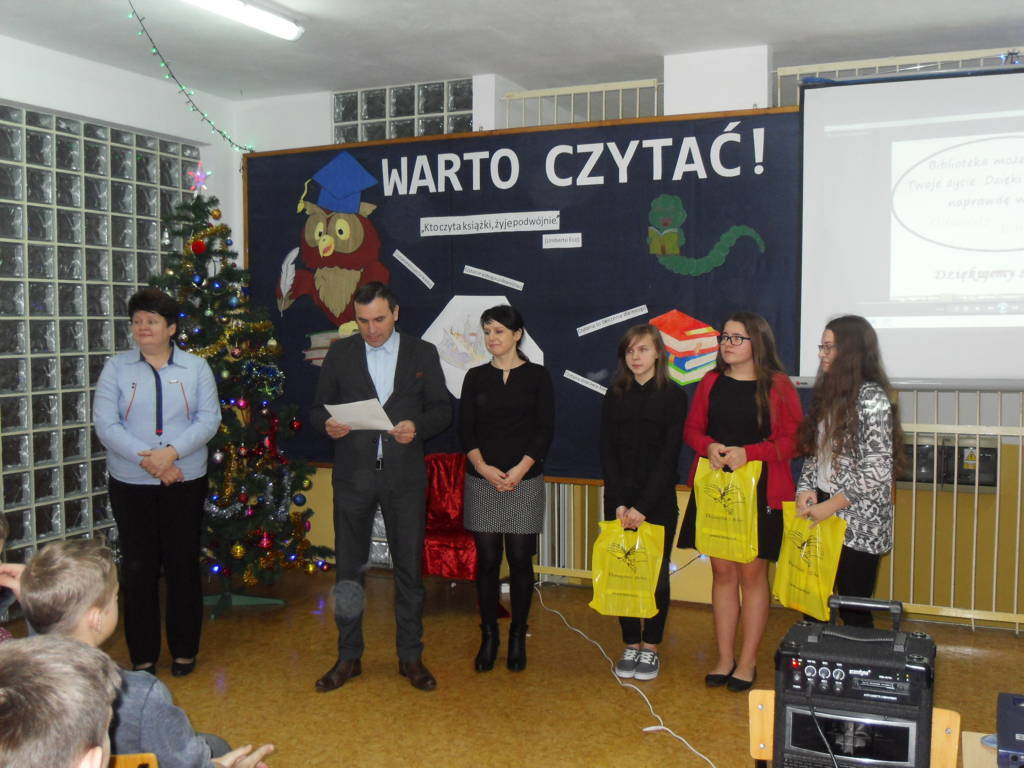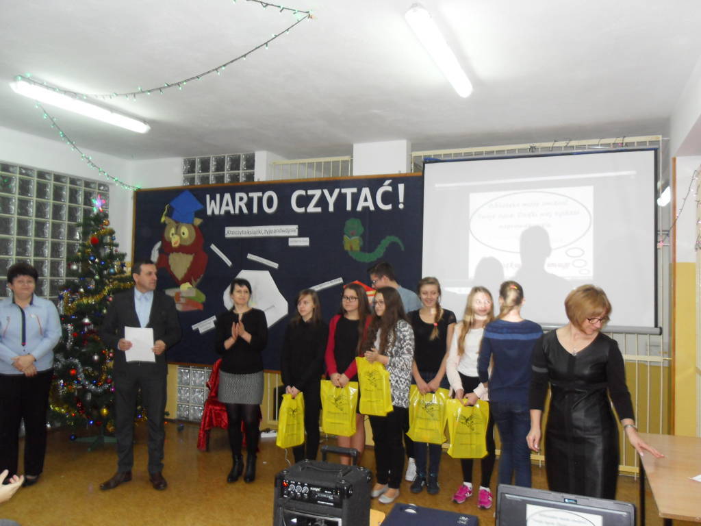p. Beata Seweryn – dyrektor Gminnej Biblioteki Publicznej w Mirowie, p. Piotr Kowalik – kierownik Referatu Oświaty w Mirowie oraz p. Sylwia Matejska – nauczyciel języka polskiego oceniała poprawność czytania tekstu, jego interpretację, dykcję a także kontakt ze słuchaczami. Mistrzynią Pięknego Czytania została Kamila Ludew – uczennica kl. IIa. II miejsce zajęła Karolina Seweryn – uczennica kl. IIIb, natomiast III miejsce należało do Izabeli Kobierskiej – uczennicy kl. IIIa. Jury zdecydowało przyznać cztery wyróżnienia następującym osobom: Bartoszowi Nowakowi kl. IIb, Juliannie Wakule kl. IIIb, Natalii Rutkowskiej kl. IIa i Wiktorii Tarabasz kl. IIb. Laureaci otrzymali nagrody książkowe, ufundowane przez Gminną Bibliotekę Publiczną w Mirowie. Uroczyste wręczenie w/w nagród odbyło się 30 listopada o godz. 10.00 na szkolnym holu. Pierwsze słowa należały do pani dyrektor Marzanny Błach, która powitała zgromadzonych i przedstawiła cele spotkania. Nagrodzenie zwycięzców zostało poprzedzone prezentacją multimedialną pt. „Dlaczego warto czytać?” przygotowaną przez panie bibliotekarki – p. Beatę Seweryn i p. Annę Elbert. Dzięki tej prezentacji gimnazjaliści mogli uświadomić sobie, że czytanie ma same zalety, m.in.: rozwija wyobraźnię, uczy analitycznego myślenia, wzbogaca słownictwo, poszerza wiedzę, poprawia koncentrację i pamięć. Laureaci I, II i III miejsca zaprezentowali wzorcowe czytanie tekstów prozy, które pozwoliły im osiągnąć sukces konkursowy.Na koniec głos zabrał p. Piotr Kowalik, który podziękował uczniom za udział w konkursie, pogratulował zwycięzcom oraz nauczycielom za promocję czytelnictwa. Konkurs został zorganizowany w ramach współpracy z Gminną Biblioteką Publiczną w związku otrzymaniem dotacji z MEN w kwocie 6480 zł na zakup książek do Bibliotek Szkolnych w ramach programu ,, Narodowy Program Rozwoju Czytelnictwa”. Inicjatorem przystąpienia do programu PG im. Jana Pawła II i ZSP w Zbijowie Małym był Piotr Kowalik. Zadanie zostało zrealizowane we współpracy z Dyrektorem PG w Mirowie p. Marznną Błach i Dyrektorem ZSP w Zbijowie Małym p. Anną Bilską.