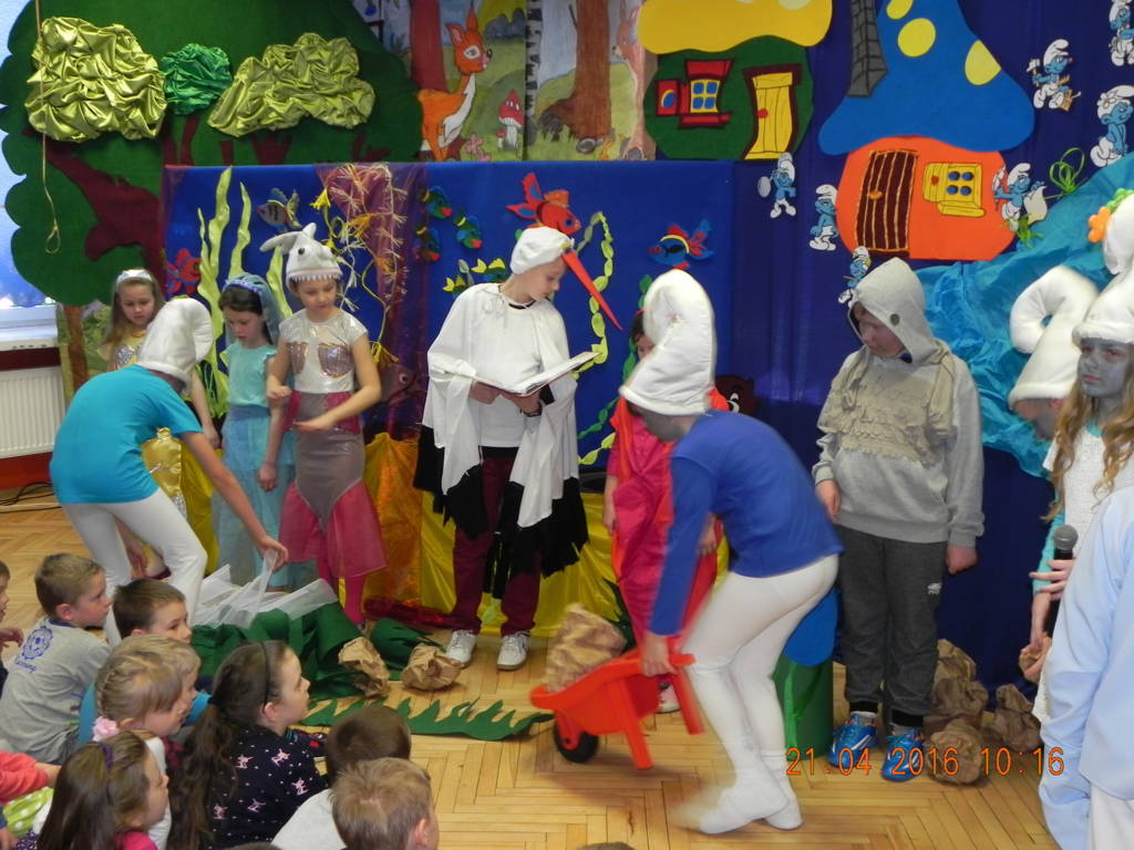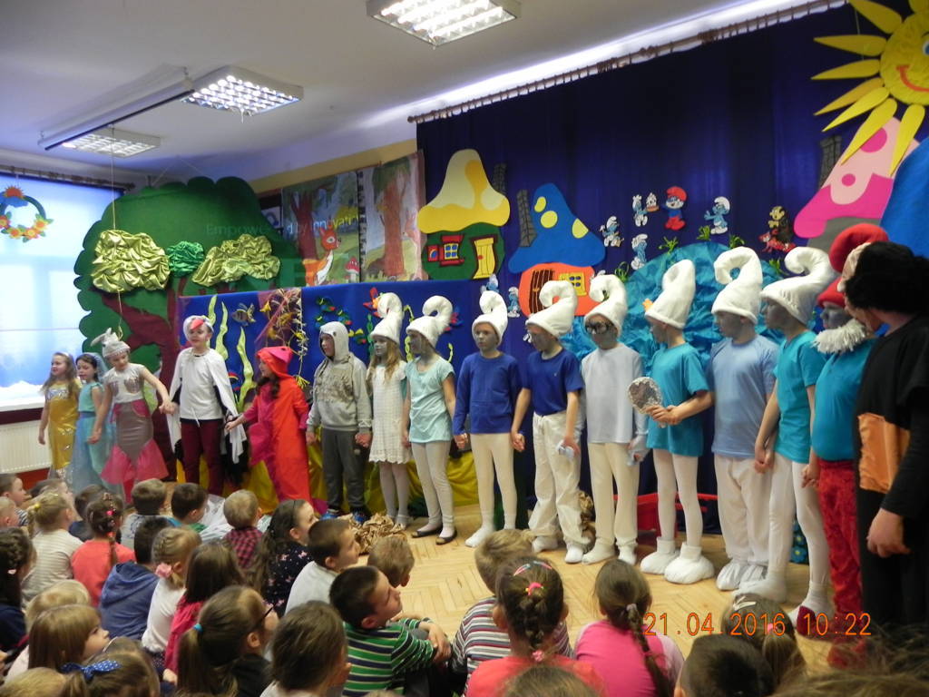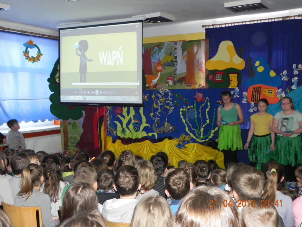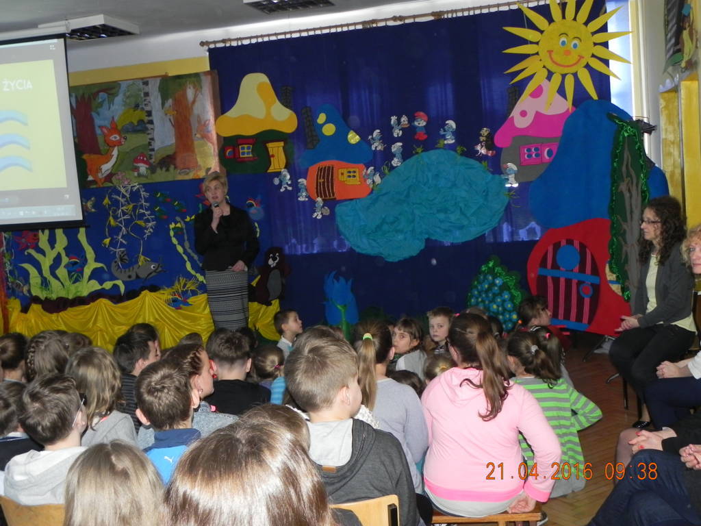 Woda źródłem życia to nazwa imprezy, która odbyła się w naszej szkole w dniu 21.04.2016r. Uczniowie klas VI wprowadzili nas w tematykę wody. Opowiedzieli nam jak ważną rolę w życiu odgrywa dla nas woda. Swoje przemówienia wzbogacili filmami multimedialnymi, z których dowiedzieliśmy się co robić by nie marnować tej życiodajnej substancji. Następnie na scenie pojawiła się klasa III, która przeniosła nas w magiczne miejsce zwane wioską smerfów. W przepięknej, bajkowej scenerii, wzbogaconej piosenkami i prezentacją multimedialną uczniowie odegrali przedstawienie pt. Smerfy nad Iłżanką poruszając tematykę zanieczyszczania wód oraz pokazali jak zbudować oczyszczalnie wody.Na koniec nastąpiło uroczyste wręczenie dyplomów za udział w konkursie Woda to życie, w którym uczniowie otrzymali nagrody od przewodniczącej rady powiatu szydłowieckiego Anity Gołosz.Wszyscy zrozumieli znaczenie wody w życiu człowieka i potrzebę oszczędnego nią gospodarowania.