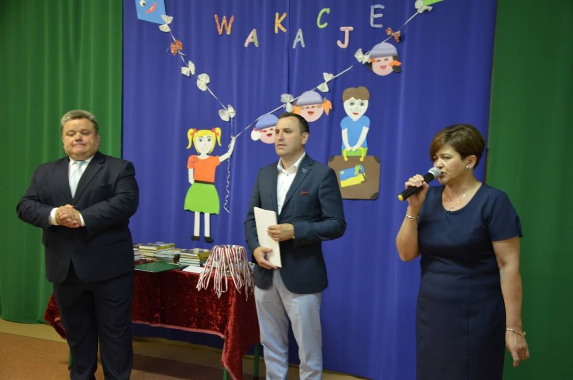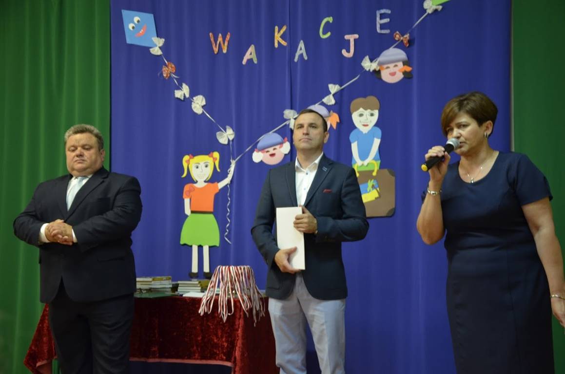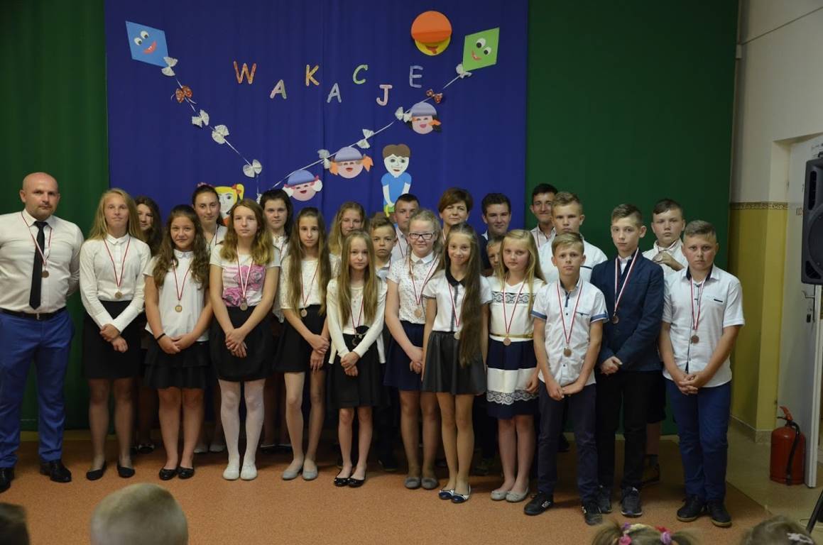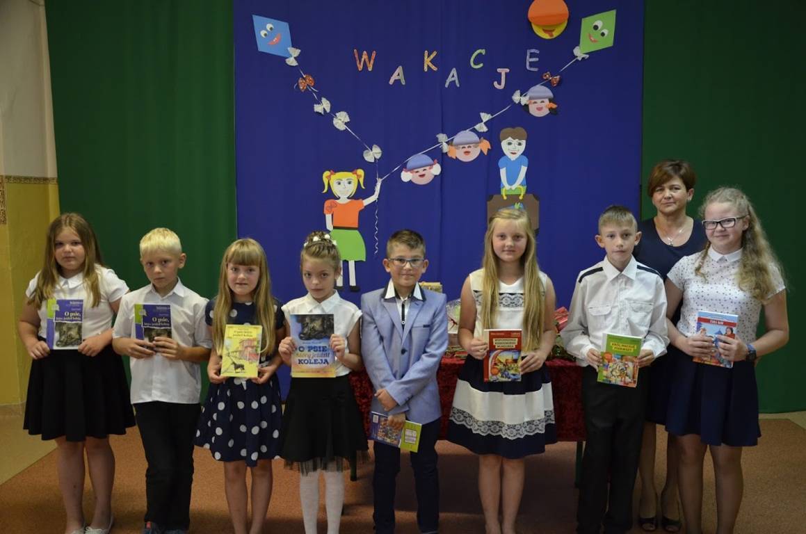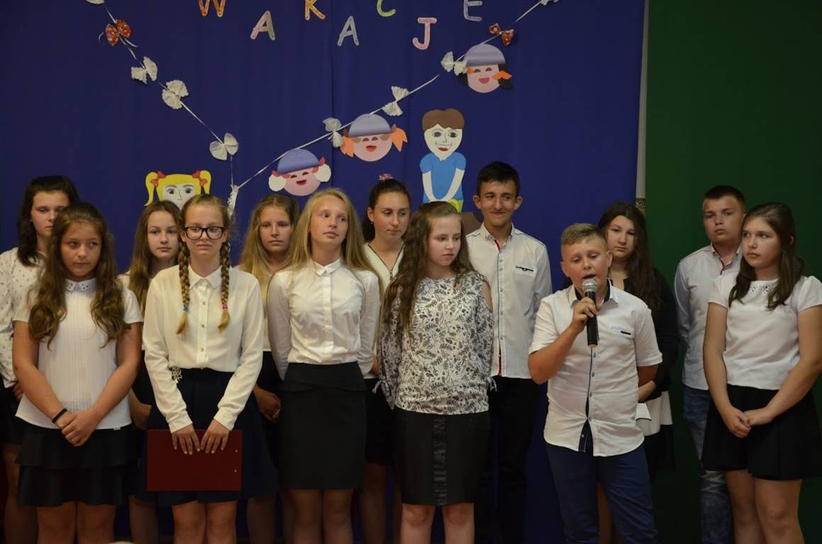 Uczniowie klasy szóstej pod opieką wychowawcy pani Alicji Szymczyk przygotowali wakacyjny artystyczny występ. Następnie pani Dyrektor Pelagia Olszewska wraz z Wychowawcami poszczególnych klas wręczyła najlepszym uczniom nagrody książkowe oraz nagrody za wspaniałą frekwencję w roku szkolnym 2016/2017. Zasłużeni uczniowie klasy piątej i szóstej wraz z panem Karolem Kaczmarzykiem otrzymali brązowe medale za zdobycie III miejsca w rankingu osiągnięć sportowych szkół podstawowych powiatu szydłowieckiego w klasyfikacji generalnej. Na zakończenie uroczystości Dyrektor Szkoły pani Pelagia Olszewska dziękując za cały rok szkolny, życzyła wszystkim słonecznych, bezpiecznych wakacji, udanego wypoczynku, wspaniałych przygód, spotkań z ciekawymi ludźmi i wielu niezapomnianych przeżyć. Uczniowie spotkali się w klasach ze swoimi wychowawcami i otrzymali świadectwa promocyjne.