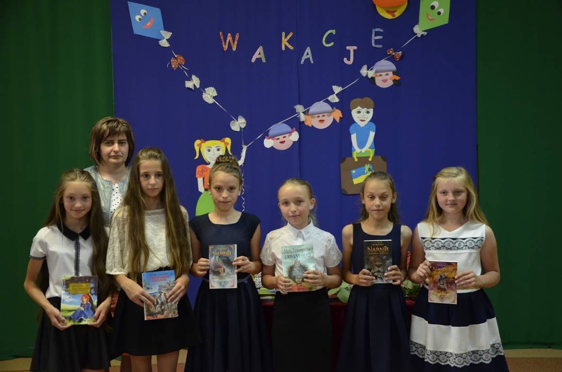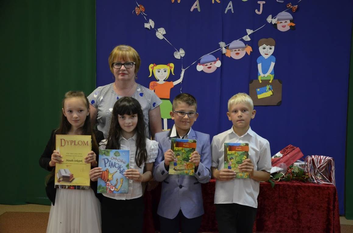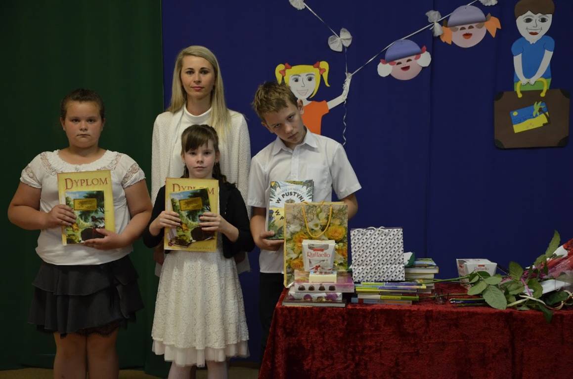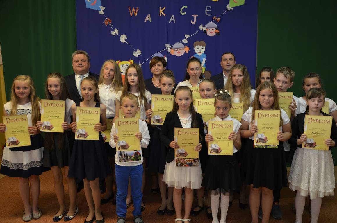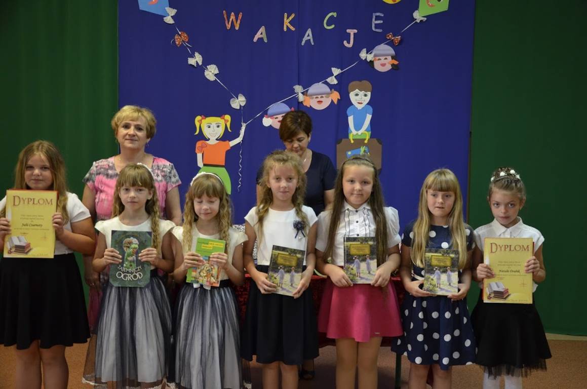 Uczniowie klasy szóstej pod opieką wychowawcy pani Alicji Szymczyk przygotowali wakacyjny artystyczny występ. Następnie pani Dyrektor Pelagia Olszewska wraz z Wychowawcami poszczególnych klas wręczyła najlepszym uczniom nagrody książkowe oraz nagrody za wspaniałą frekwencję w roku szkolnym 2016/2017. Zasłużeni uczniowie klasy piątej i szóstej wraz z panem Karolem Kaczmarzykiem otrzymali brązowe medale za zdobycie III miejsca w rankingu osiągnięć sportowych szkół podstawowych powiatu szydłowieckiego w klasyfikacji generalnej. Na zakończenie uroczystości Dyrektor Szkoły pani Pelagia Olszewska dziękując za cały rok szkolny, życzyła wszystkim słonecznych, bezpiecznych wakacji, udanego wypoczynku, wspaniałych przygód, spotkań z ciekawymi ludźmi i wielu niezapomnianych przeżyć. Uczniowie spotkali się w klasach ze swoimi wychowawcami i otrzymali świadectwa promocyjne.