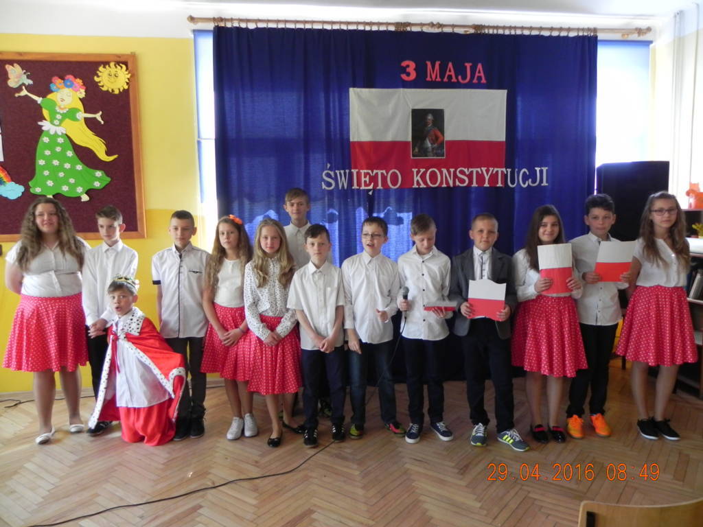 Narodowe święta maja na celu uwrażliwienie uczniów na losy własnego kraju i narodu. Taki też cel przyświecał nauczycielkom p. Agnieszce Kawalec, p. Agacie Kuźdub i p. Małgorzacie Tarabasz, które wraz ze swoimi wychowankami z klasy V przygotowały uroczysty apel poświęcony Konstytucji 3 Maja.Zebrani uczniowie mogli zapoznać się z okolicznościami uchwalenia Konstytucji 3 Maja, poznać jej twórców i istotę tego najważniejszego dokumentu w państwie, wysłuchać przysięgi króla Stanisława Augusta Poniatowskiego, a także rozważań na temat haseł: wolność, naród, ojczyzna. Uroczystość kształtowała postawy patriotyczne oraz poczucie dumy z przodków, budziła szacunek dla symboli narodowych. Odśpiewano hymn państwowy ze szczególnym zwróceniem na zachowanie właściwej postawy. To wszystko sprawiło, że uroczystość miała podniosły charakter. Na zakończenie wręczone zostały nagrody za udział w konkursie wiedzy o majowej konstytucji – pierwsze miejsce zajął Kacper Łyżwa z klasy V, drugie miejsce Wiktor Bilski z klasy VI a.