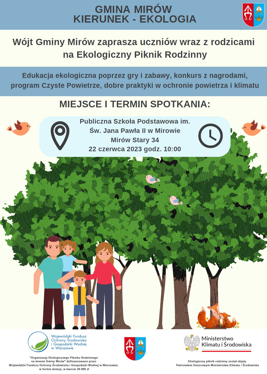 Serdecznie zapraszamy na Rodzinny Piknik Ekologiczny w dniu 22.06.2023r. w godzinach 10:00 - 16:00 na terenie przy Publicznej Szkole Podstawowej im. Św Jana Pawła II w Mirowie.