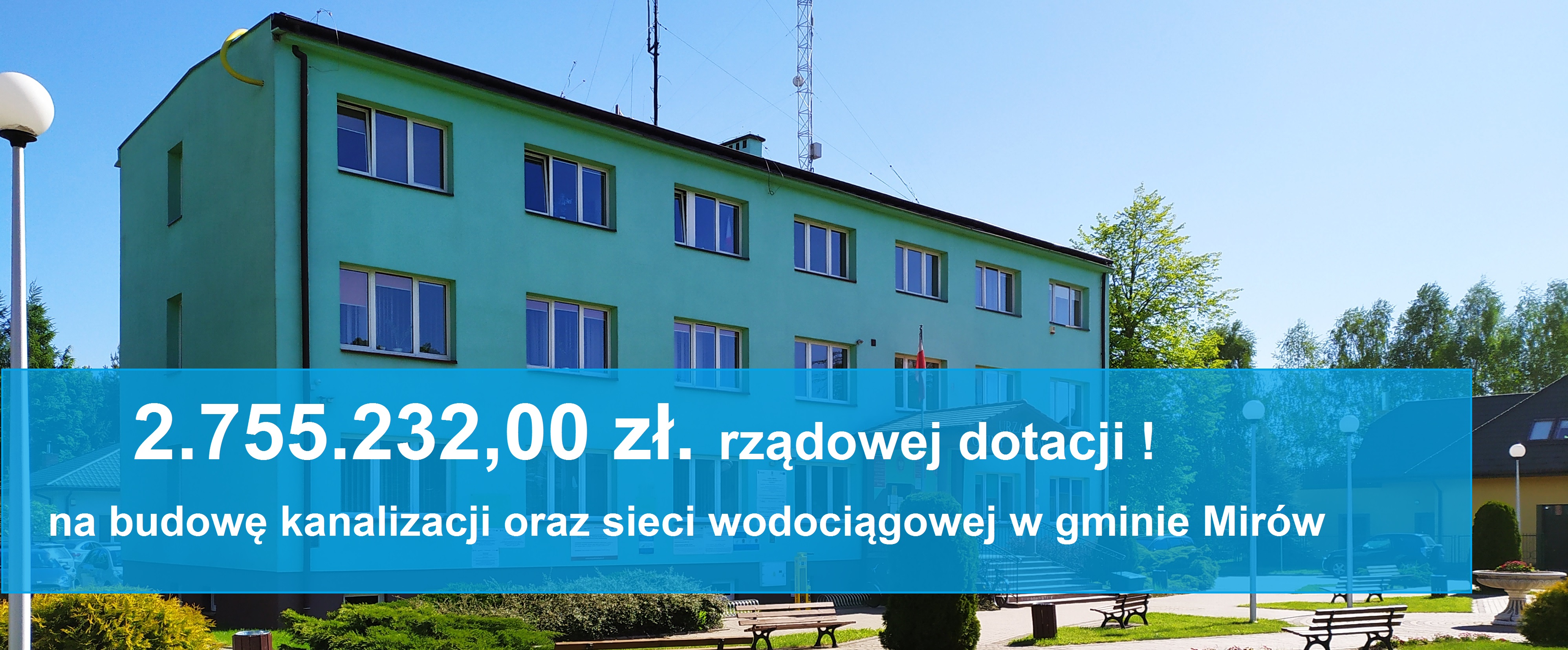 Na stronach rządowych pojawiła się lista gmin, które otrzymały dotację na modernizację gospodarki wodno ściekowej. Są to środki rządowe dystrybuowane w ramach wyrównania subwencji ogólnej. Gmina Mirów otrzymała 300.000,00 zł. na modernizację sieci wodociągowej oraz 2.455.232,00 zł. na budowę kanalizacji. Łączna wartość otrzymanych środków to 2.755.232,00 zł.