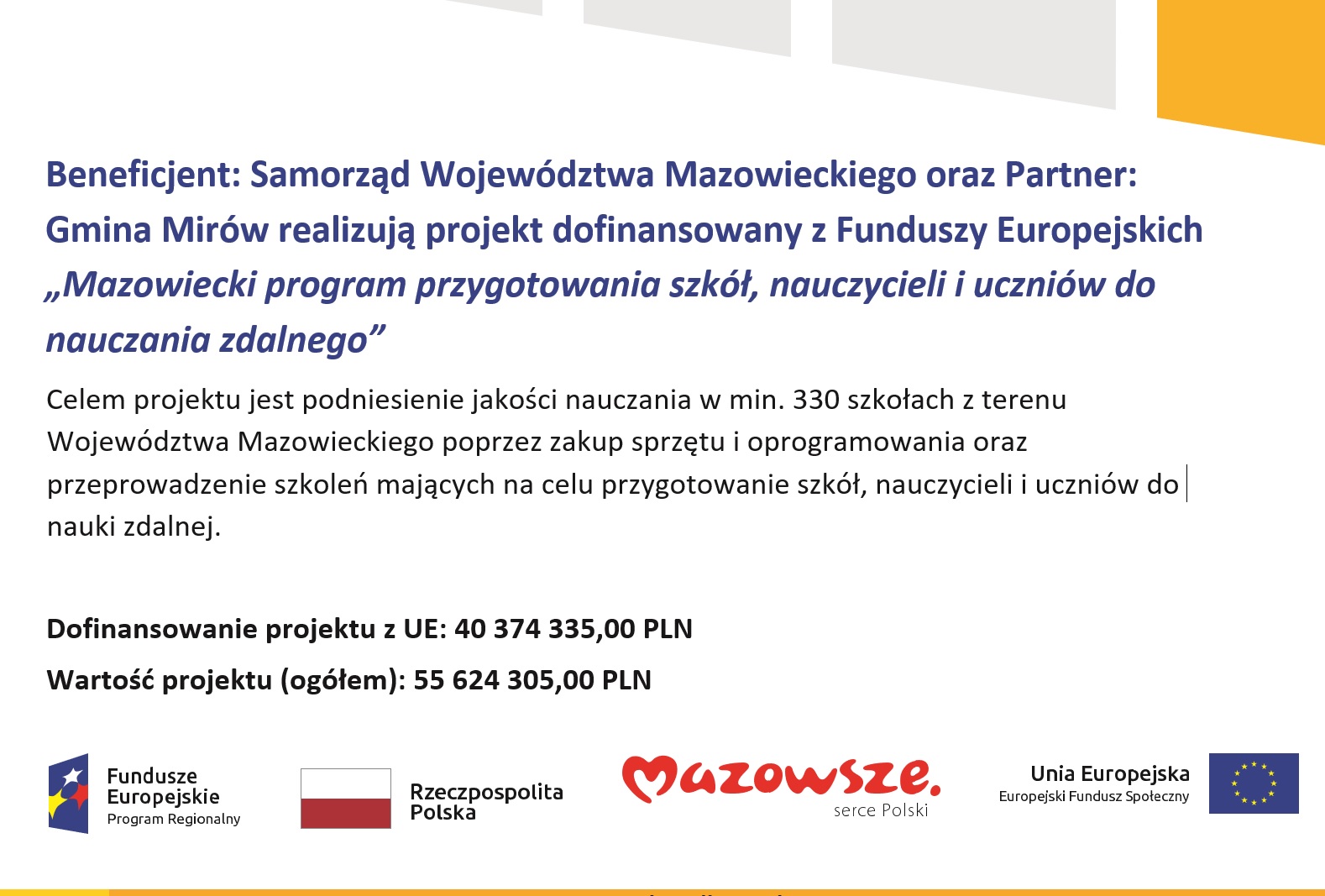 Gmina Mirów w partnerstwie z Samorządem Województwa Mazowieckiego realizuje projekt pn. „Mazowiecki program przygotowania szkół, nauczycieli i uczniów do nauczania zdalnego” w ramach X Osi priorytetowej „Edukacja dla rozwoju regionu”,