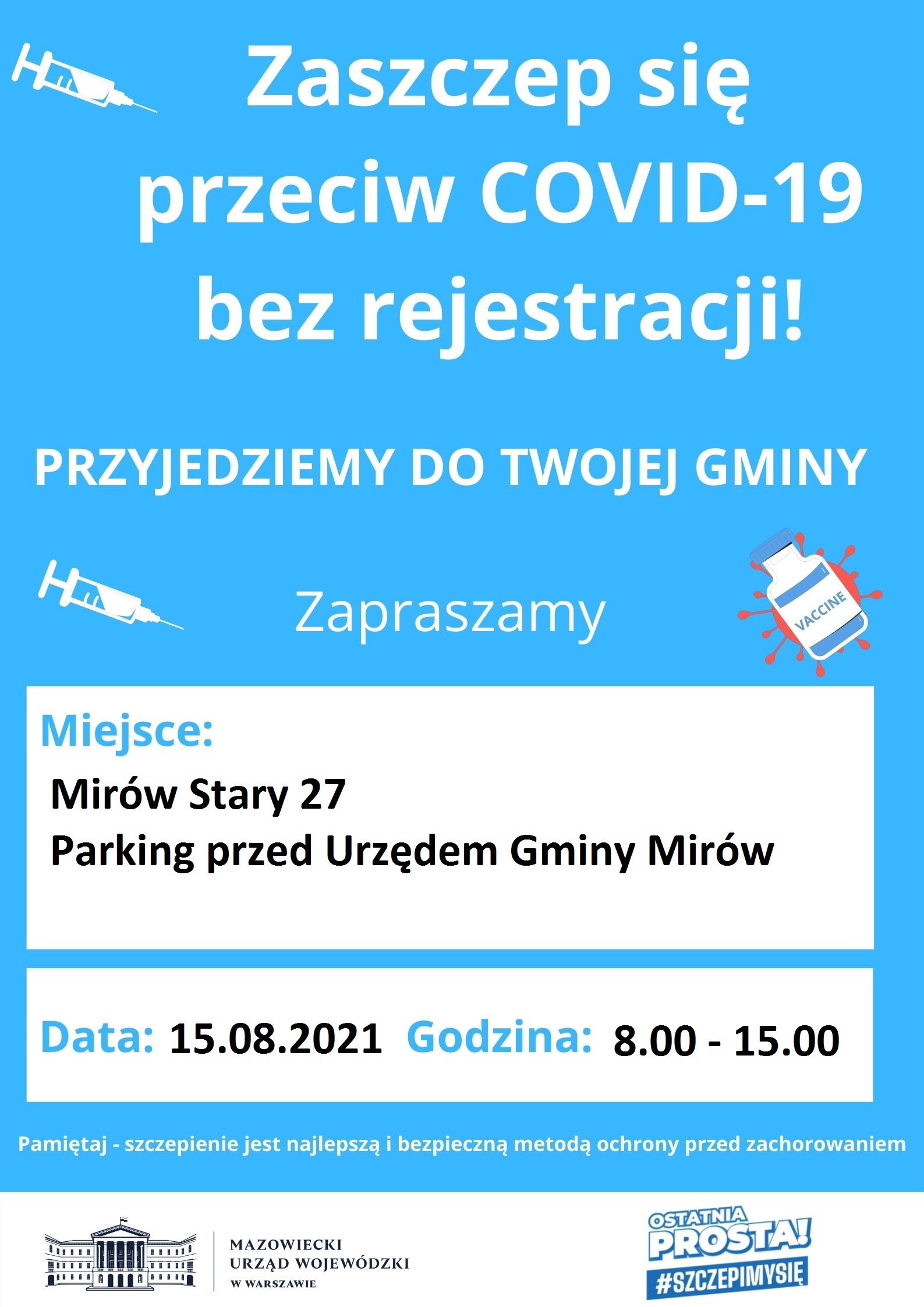 Zapraszamy Państwa w niedzielę, 15 sierpnia w godzinach od 8.00 do 15.00 na teren parkingu przed Urzędem Gminy Mirów. Chętni będą mogli się zaszczepić jednorazową dawką preparatu Johnson&Johnson. Organizatorami akcji jest delegatura Mazowieckiego Urzędu Wojewódzkiego w Radomiu przy współpracy Gminy Mirów.