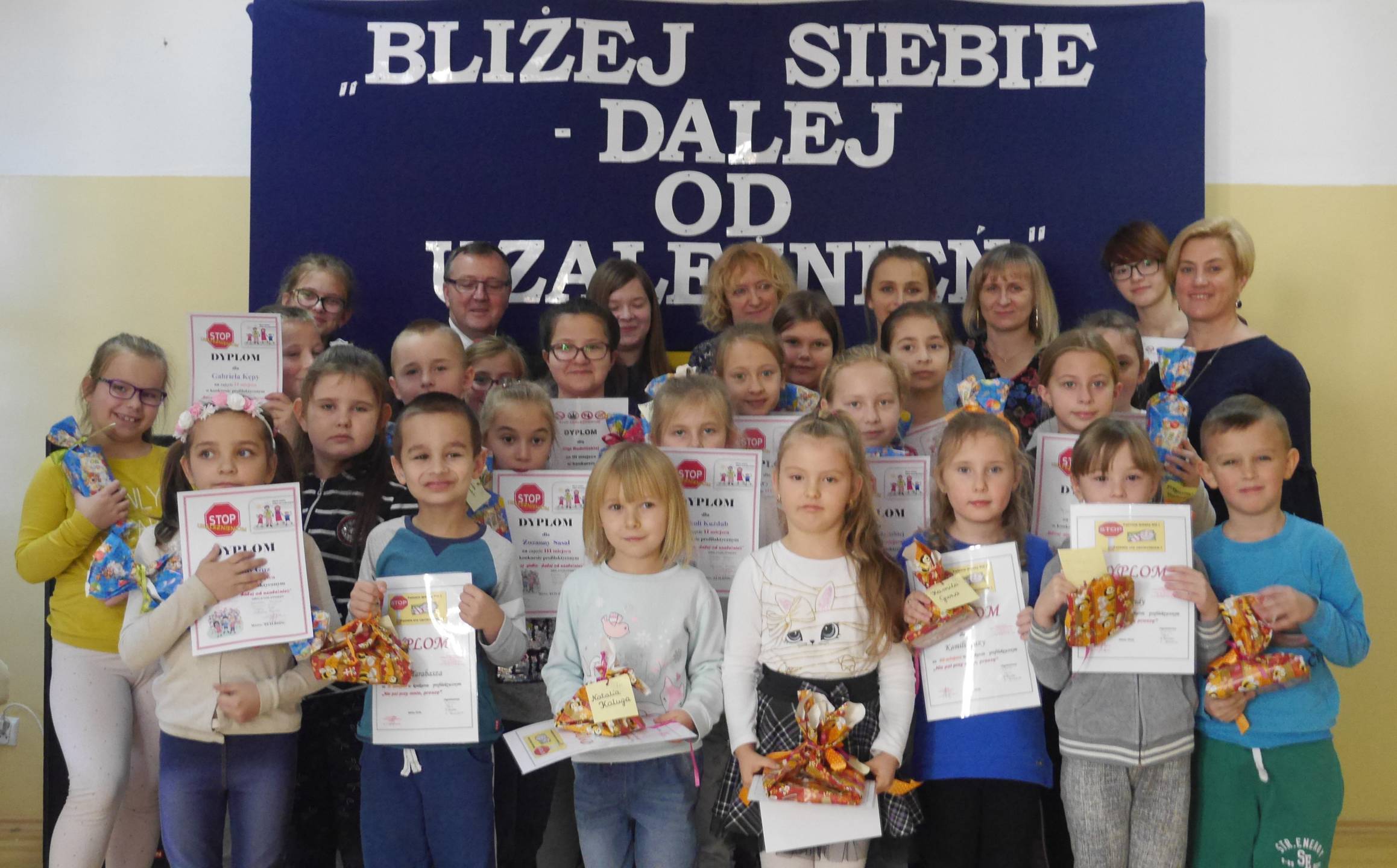 Jak co roku, dla sprawnej realizacji procesu wychowawczego, przy współpracy z Gminną Komisją ds. Rozwiązywania Problemów Alkoholowych w Mirowie podjęto w Naszej szkole działania profilaktyczne. W ramach zaplanowanej i realizowanej szkolnej profilaktyki uzależnień zainicjowano i przeprowadzono w szkole akcję profilaktyczno- edukacyjną pt. „Bliżej siebie- dalej od uzależnień”. Skierowano ją do dzieci z oddziałów przedszkolnych, uczniów klas 0-8 oraz III klas gimnazjum. Podjęte w jej ramach działania były ukierunkowane na uwrażliwienie uczniów na zgubne skutki uzależnień i promowanie zdrowego stylu życia. W ramach przedsięwzięcia przygotowano i zorganizowano różnorodne konkursy profilaktyczne, których tematykę dostosowano do wieku i możliwości uczniów. Podczas apelu profilaktycznego, który miał miejsce 30 XI 2018r. społeczność szkolna uczestniczyła w „Profilaktycznym maratonie filmowym” . Wywołał on refleksje na temat mądrego podejmowania decyzji, dokonywania właściwych wyborów i życia bez nałogów. Poznano w jaki sposób rozwijają się uzależnienia, pogłębiono wiedzę o zdrowotnych, społecznych i ekonomicznych ich skutkach. Podczas apelu zachęcano do zachowań asertywnych oraz przedstawiono wyniki szkolnych konkursów profilaktycznych, które zostały przeprowadzone w ramach akcji: plastycznego pt. „Nie pal przy mnie, proszę”, literacko-plastycznego pt. „Stop uzależnieniom”, plastycznego pt. „Dalej od uzależnień”, wiedzy pt. „Wolni od uzależnień”. Laureaci konkursów i wyróżnieni uczniowie otrzymali pamiątkowe dyplomy i nagrody rzeczowe Podjęte i zrealizowane działania pomogły utrwalić nawyki zdrowego stylu życia. Ich organizatorami był zespół nauczycieli :Elżbieta Kuźdub, Sylwia Lech, Agnieszka Kawalec, Joanna Minda.