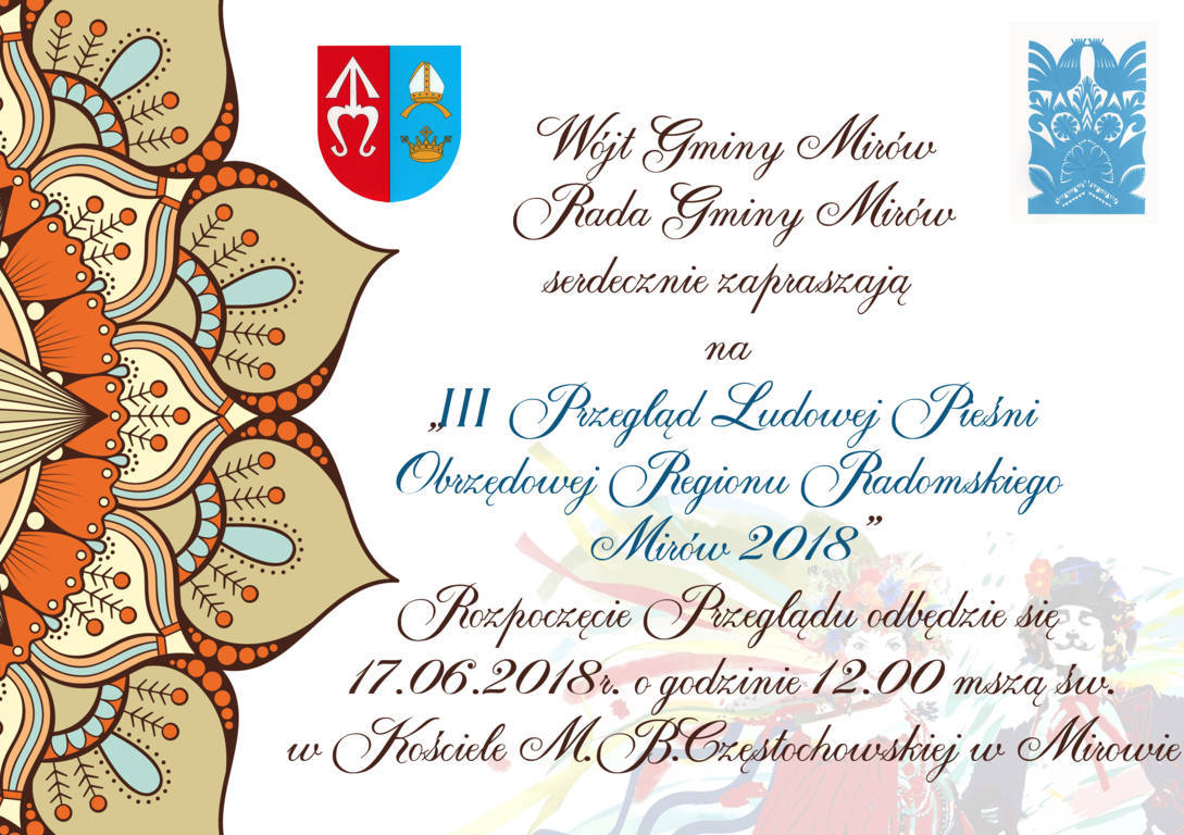 W dniu 17.06.20178r. w gminie Mirów odbył się III Przegląd Ludowej Pieśni Obrzędowej Regionu Radomskiego. Uroczystego otwarcia imprezy dokonał Wójt Gminy Mirów Artur Siwiorek oraz Przewodniczący Rady Gminy Mirów p. Wiesław Morawiak. Występu zespołów śpiewaczych podziwiali także: Włodzimierz Górlicki Starosta szydłowiecki, Artur Ludew Burmistrz Szydłowca, Waldemar Sowiński wójt Gminy Chlewiska, Andrzej Bracha – wójt Gminy Jastrząb, oraz Anita Gołosz – Przewodnicząca Rady Powiatu Szydłowieckiego.