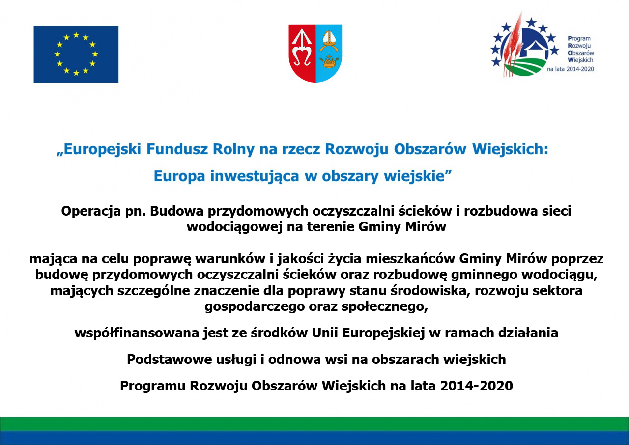Wójt Gminy Mirów informuje, że projekt „Budowa przydomowych oczyszczalni ścieków i rozbudowa sieci wodociągowej na terenie Gminy Mirów” złożony w Urzędzie Marszałkowskim Województwa Mazowieckiego został rozpatrzony pozytywnie. Zgodnie z umową zawartą w dniu 5 czerwca 2018 roku zadanie zostało objęte dofinansowaniem w kwocie 704 830 złotych. Dzięki pozyskanej dotacji na terenie gminy Mirów zbudowanych zostanie 40 przydomowych oczyszczalni ścieków, a sieć wodociągowa zostanie rozbudowana. W dniu 14 czerwca 2018 roku o godzinie 19.00 w świetlicy wiejskiej w Rogowie odbędzie się spotkanie z mieszkańcami gminy Mirów, którzy zgłosili się do udziału w projekcie.