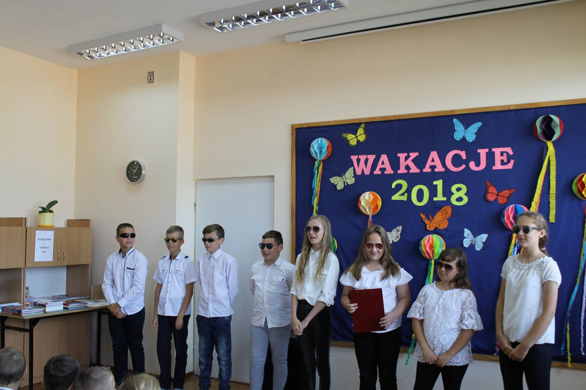 Dnia 22 czerwca 2018r. uroczyście pożegnaliśmy rok szkolny 2017/2018. Na uroczystość do naszej szkoły przybyli zaproszeni goście: wójt naszej gminy p. Artur Siwiorek i kierownik Referatu Oświaty p. Piotr Kowalik. Pani Dyrektor Marzanna Błach powitała serdecznie wszystkich zebranych i zaprosiła na uroczystą akademię, którą przedstawiła klasa VI pod kierunkiem wychowawcy p. Joanny Drabik. Następnie, z rąk Pana wójta najlepsi uczniowie otrzymali stypendia naukowe i nagrody książkowe. Uczniowie naszej szkoły, którzy brali udział w różnego rodzaju konkursach, otrzymali z rąk p. dyrektor pamiątkowe dyplomy i nagrody książkowe. Po części oficjalnej wszyscy udali się do swoich klas po świadectwa. Szczęśliwi uczniowie z cenzurkami w dłoniach rozpoczęli swoje upragnione wakacje. Wszystkim naszym uczniom życzymy szczęśliwych i przede wszystkim bezpiecznych wakacji.