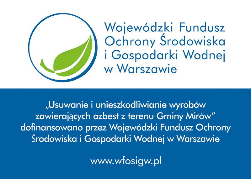 W okresie od 17 lipca do 18 sierpnia 2017 r. planowany jest odbiór azbestu (płyt eternitowych) od mieszkańców gminy Mirów w ramach tegorocznej edycji Programu „Usuwania i unieszkodliwianie azbestu na terenie województwa mazowieckiego” współfinansowanego ze środków Wojewódzkiego Funduszu Ochrony Środowiska i Gospodarki Wodnej w Warszawie.